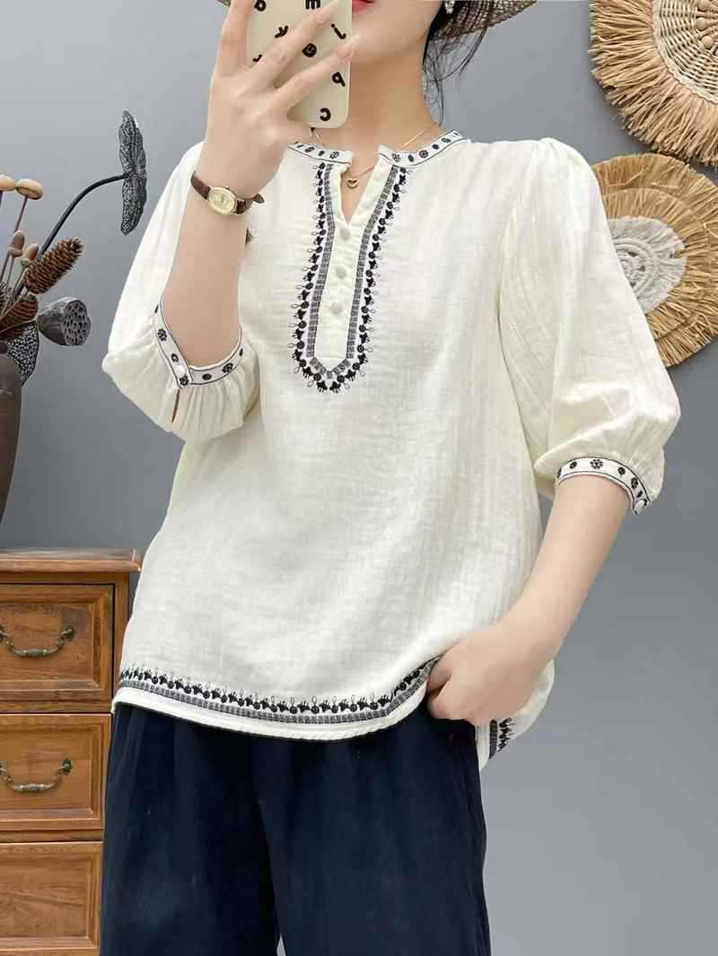 일본 모리 여성 민족 V-Neck 여성용 풀오버 반팔 셔츠 탑 자수스토어 가기