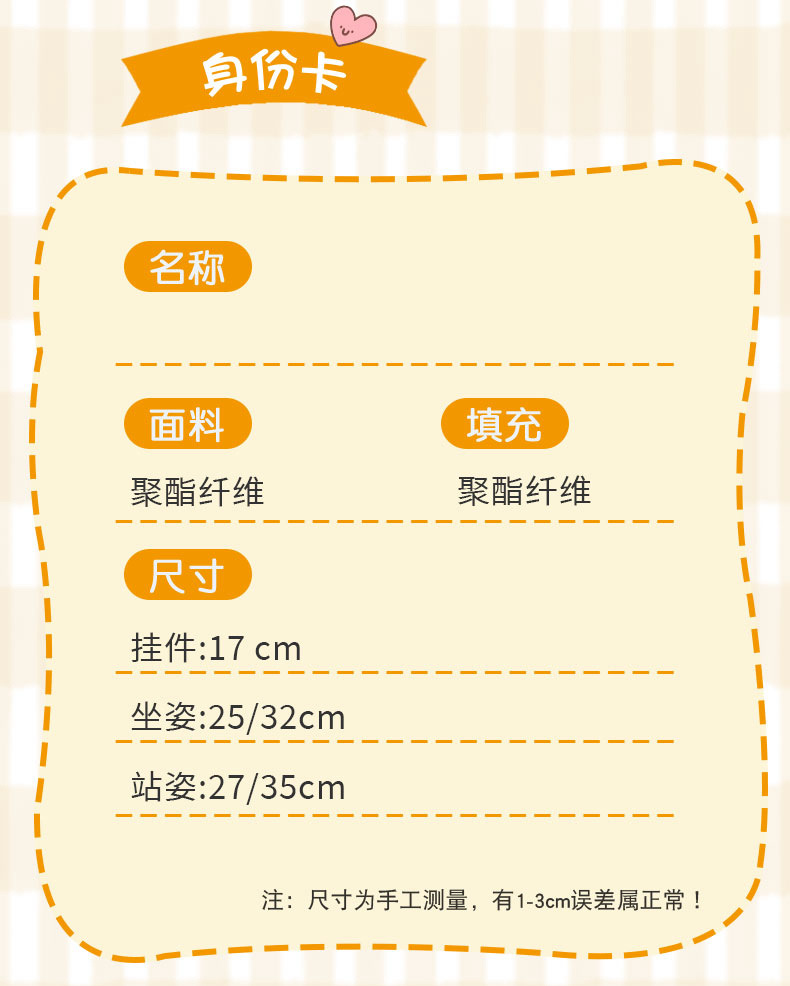 所有宝贝均为实物测量,毛绒玩具本身是软性的会有一定误差(大概3厘米之间)