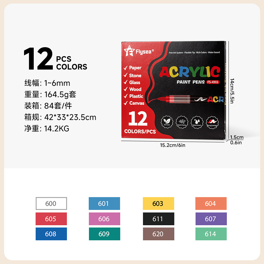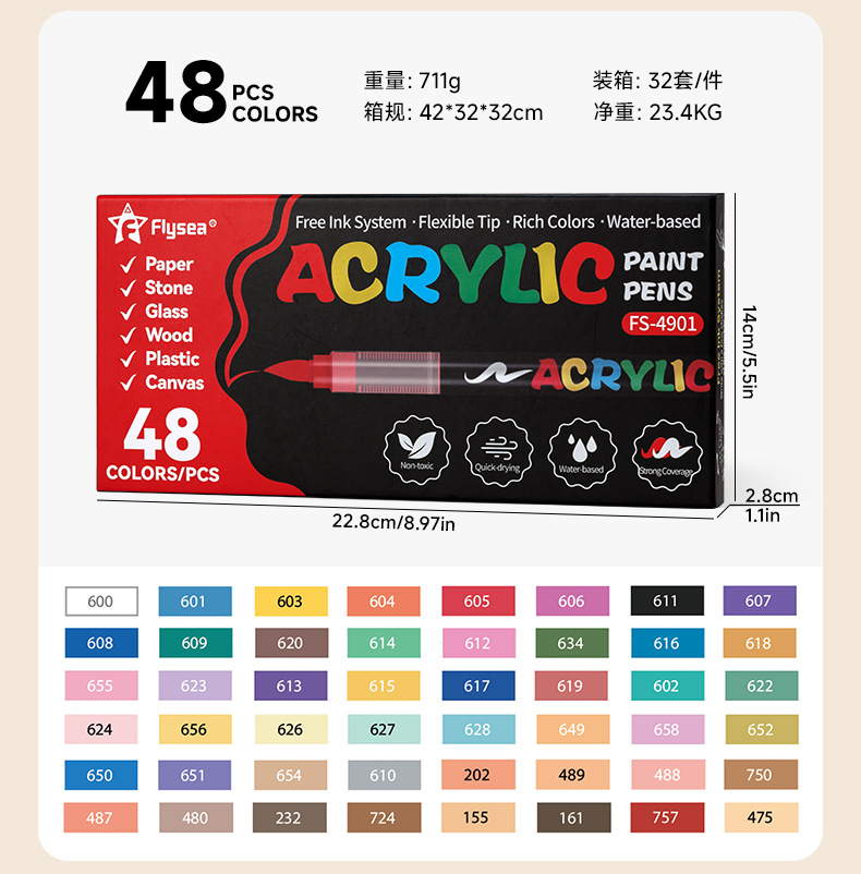 Flysea 4901 스트레이트 액체 아크릴 마커 펜 대용량 쌓을 수있는 색상 불투명 종이 그림 낙서 브러쉬