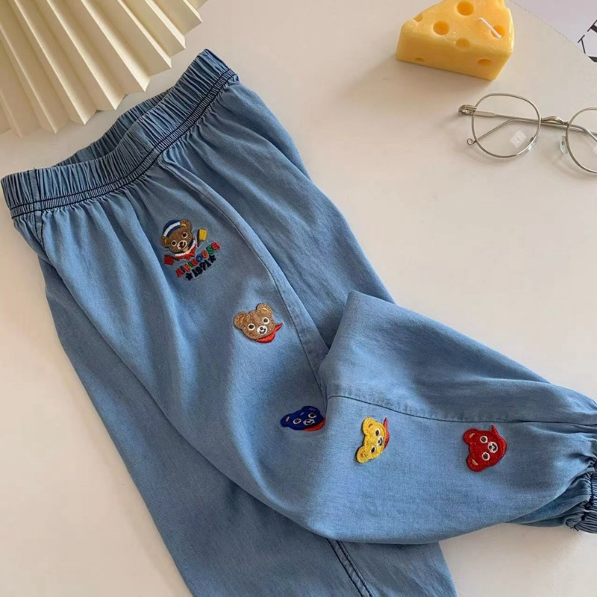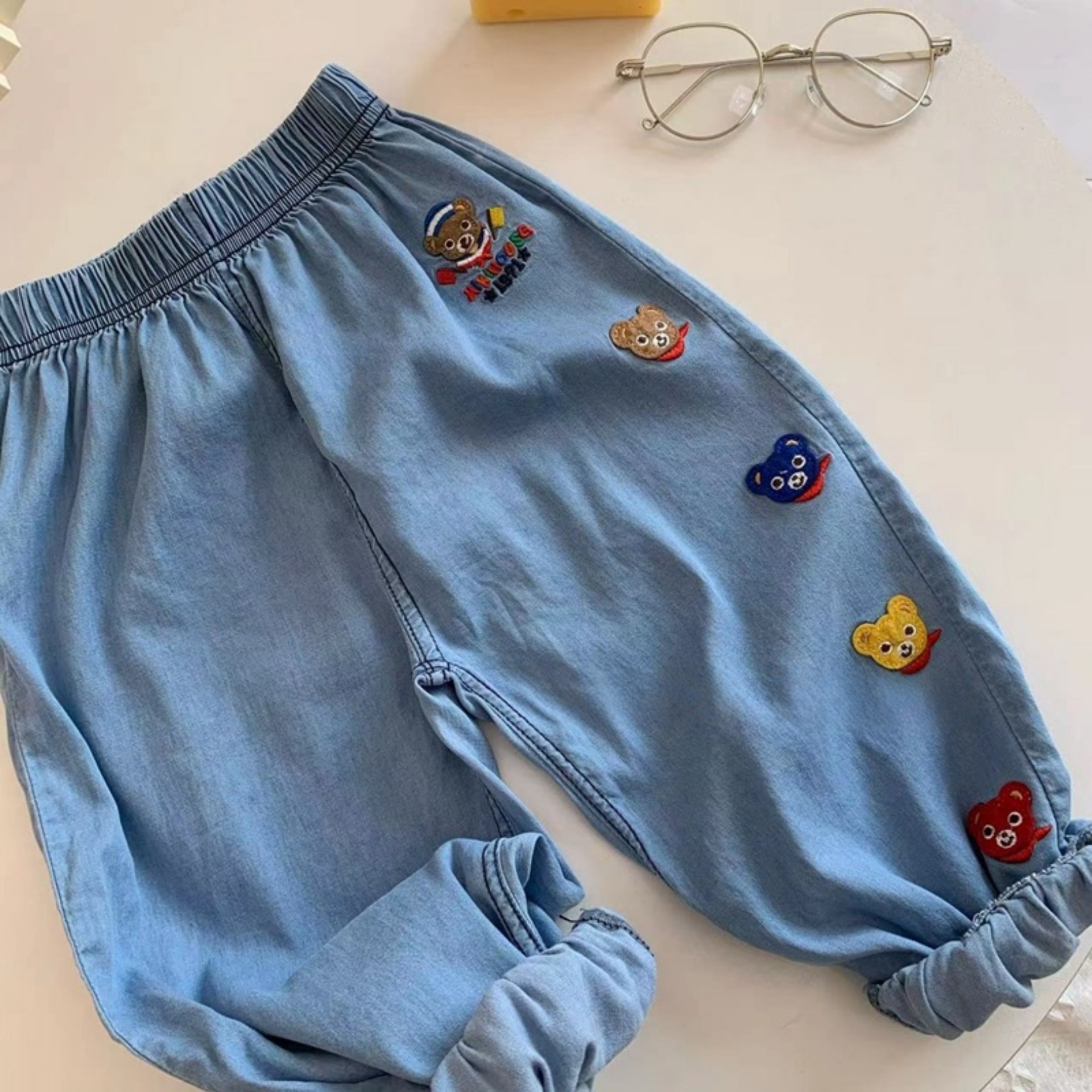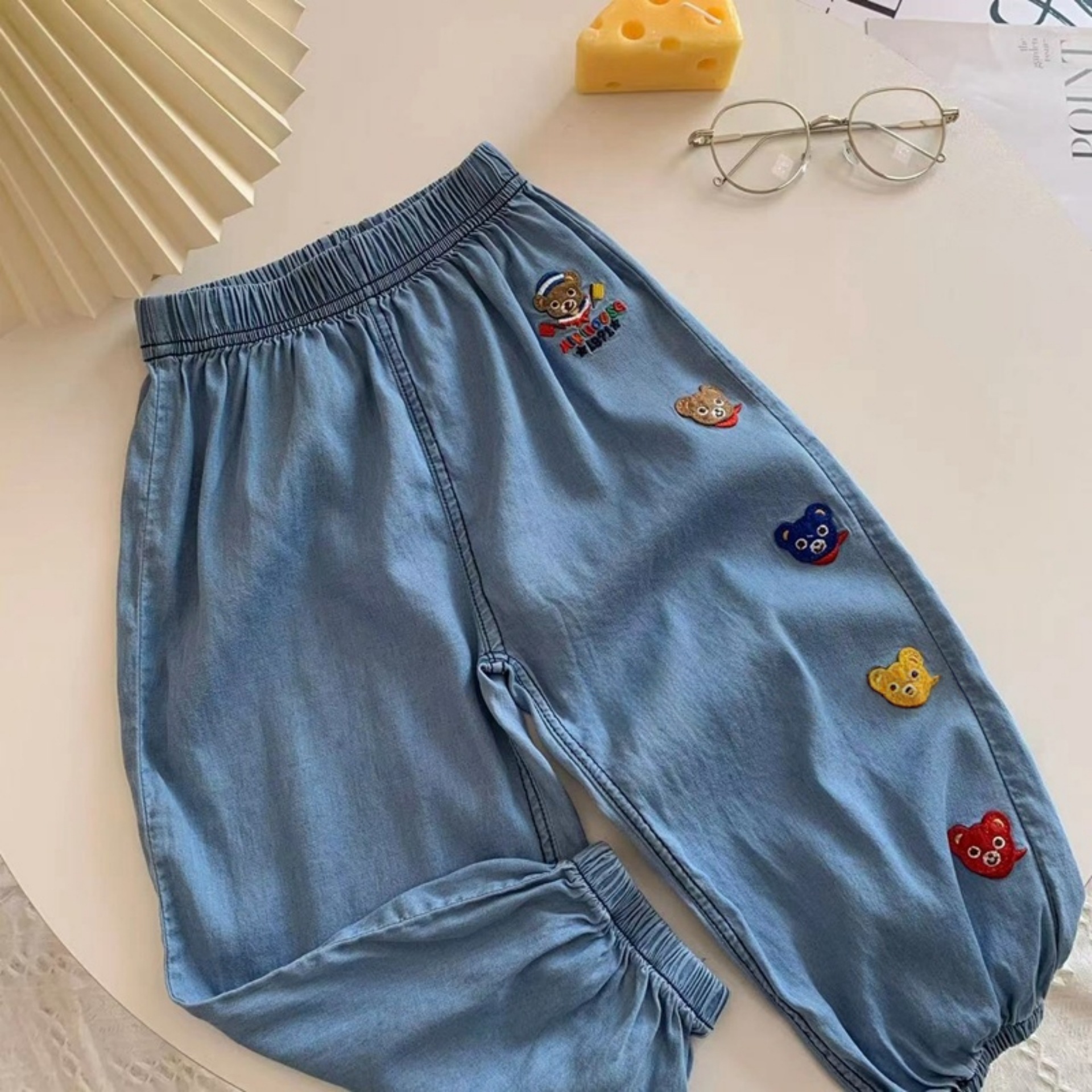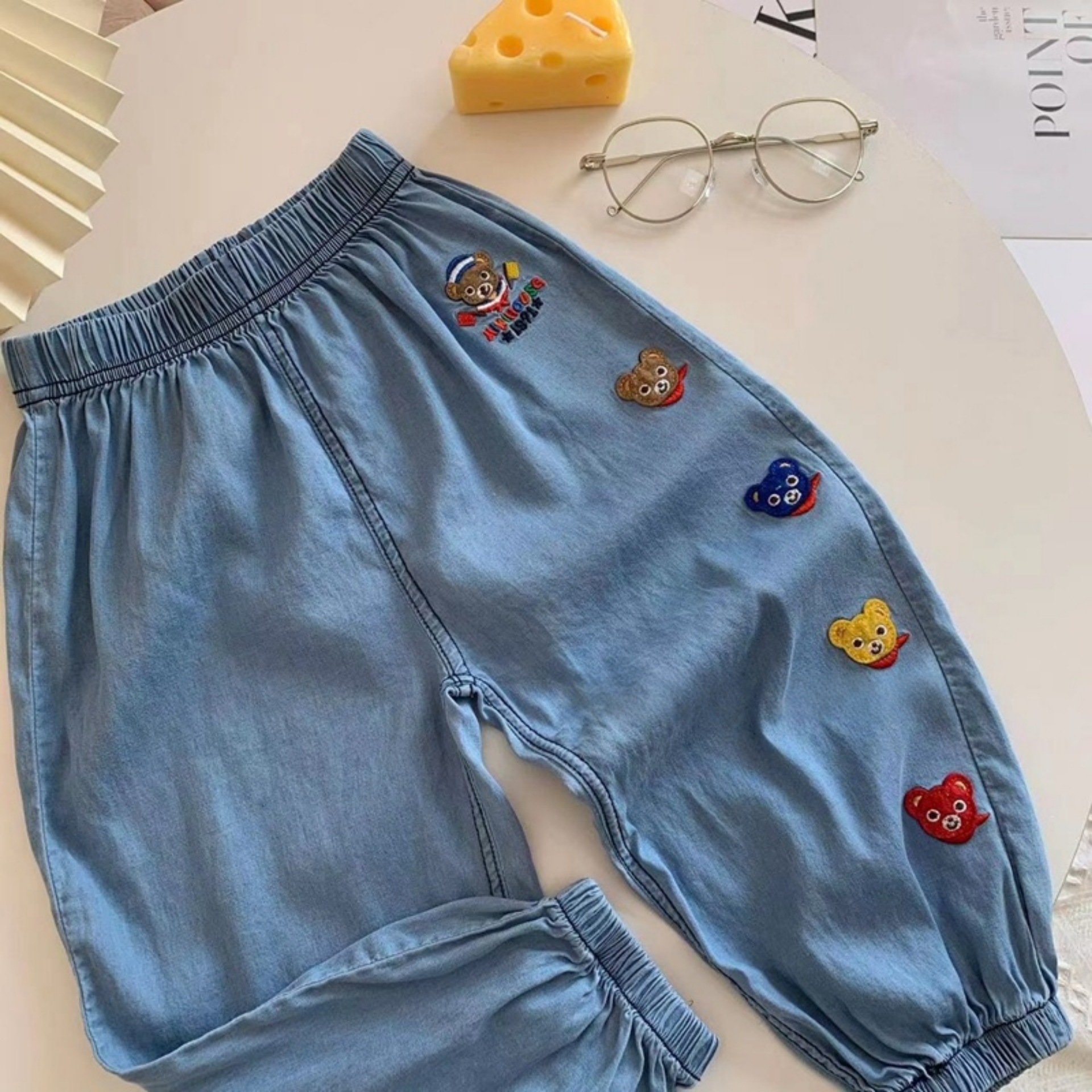 작은 소금 레몬 텐셀 코튼 바지, 여름 신상 아동용 측면 곰 자수 캐주얼 레깅스, 아기용 루즈한 모기 방지 바지스토어 가기