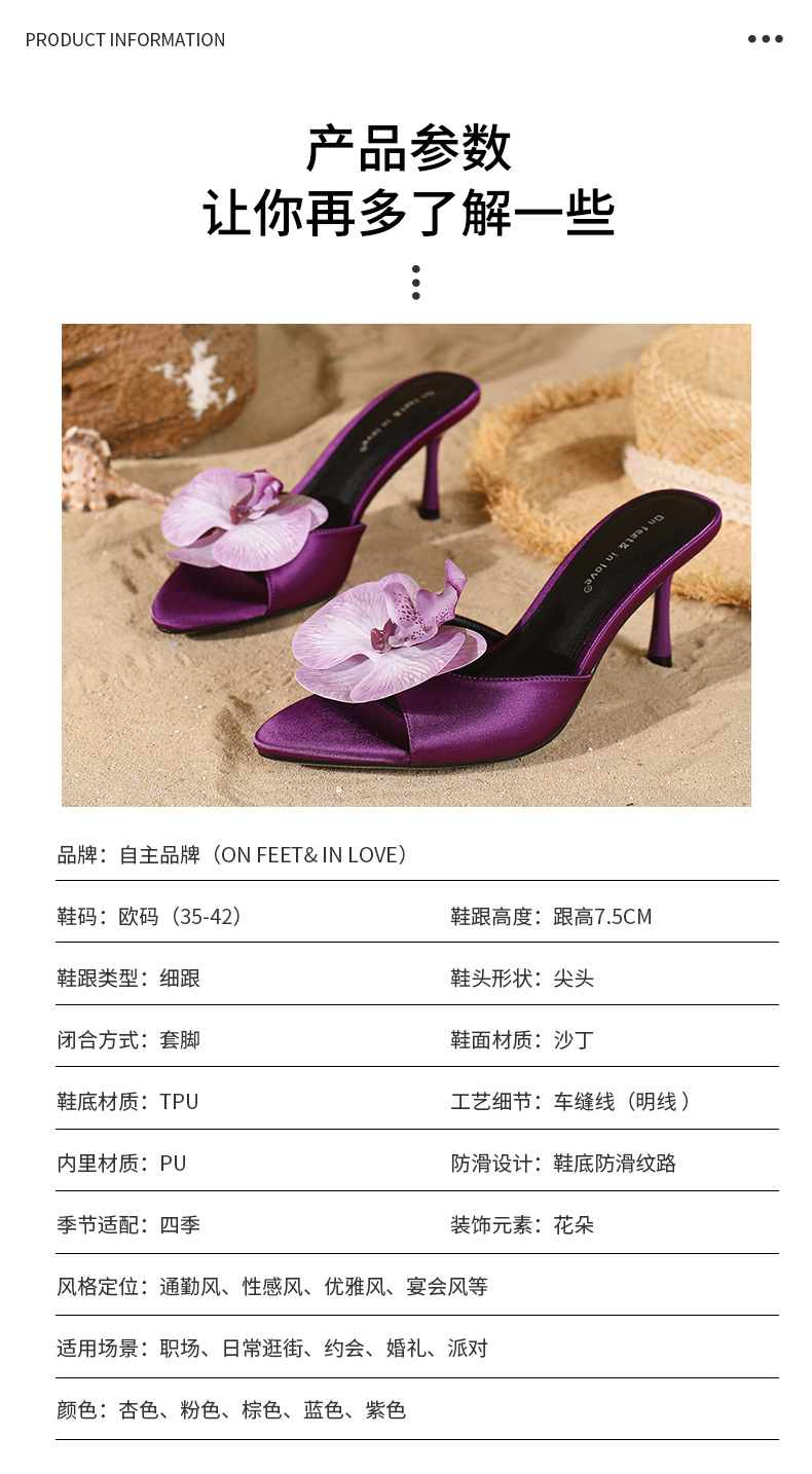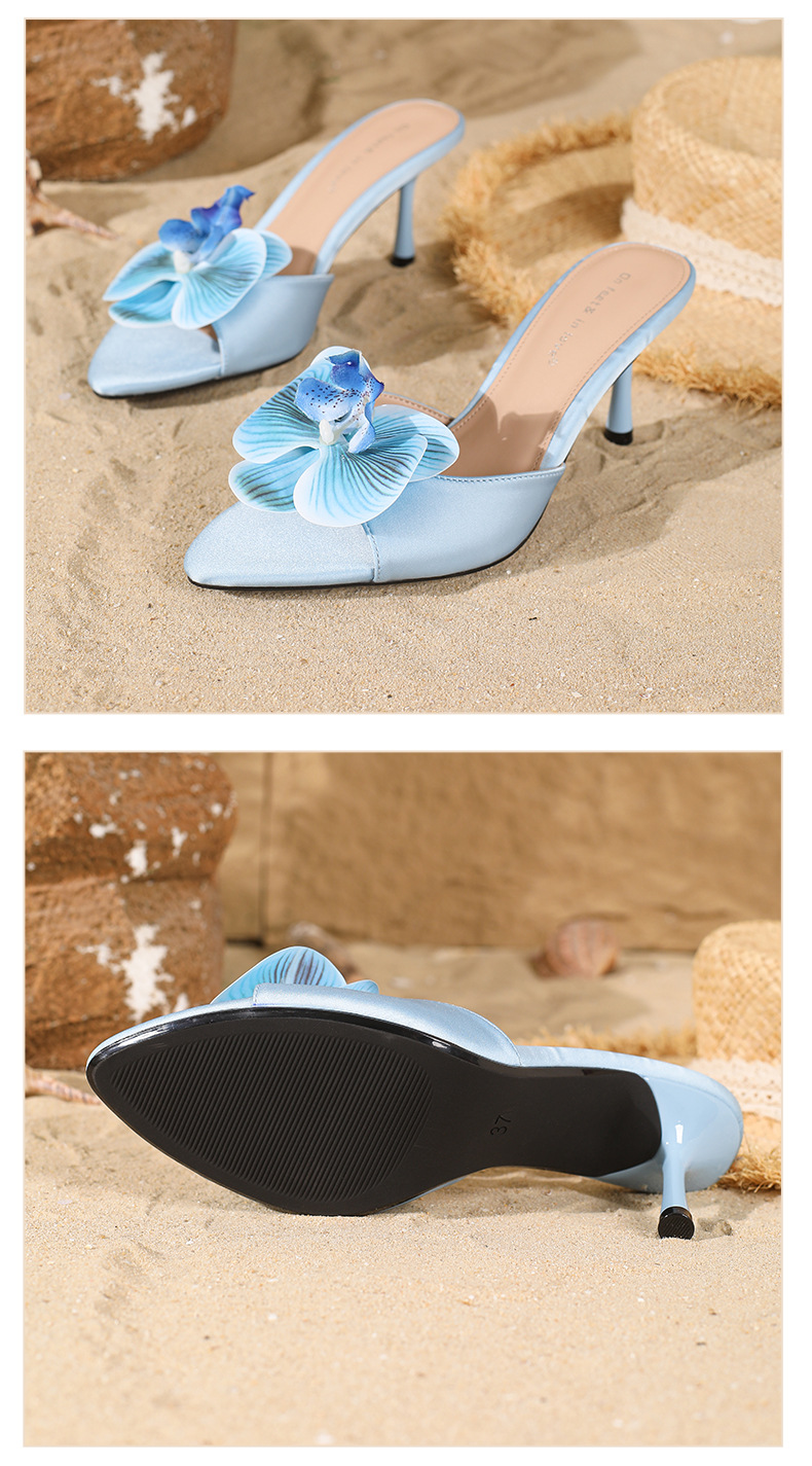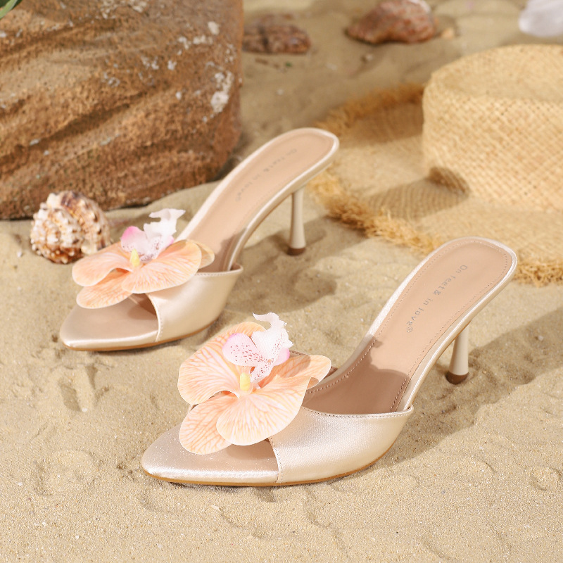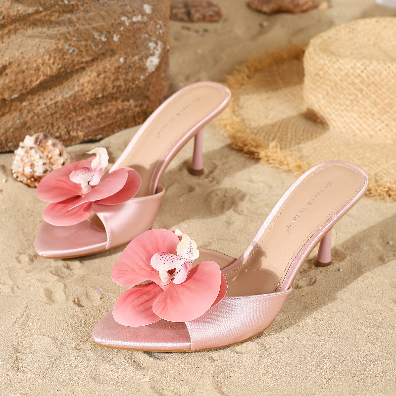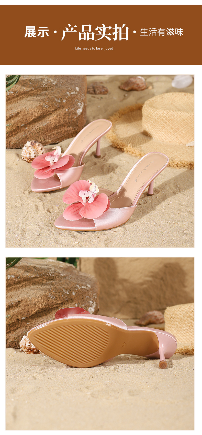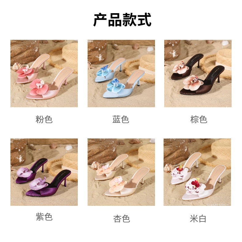 2025 새로운 꽃 장식 오픈 발가락 얇은 굽 뾰족한 여성 여름 겉옷 유행 패션 캐주얼 하이힐 샌들스토어 가기