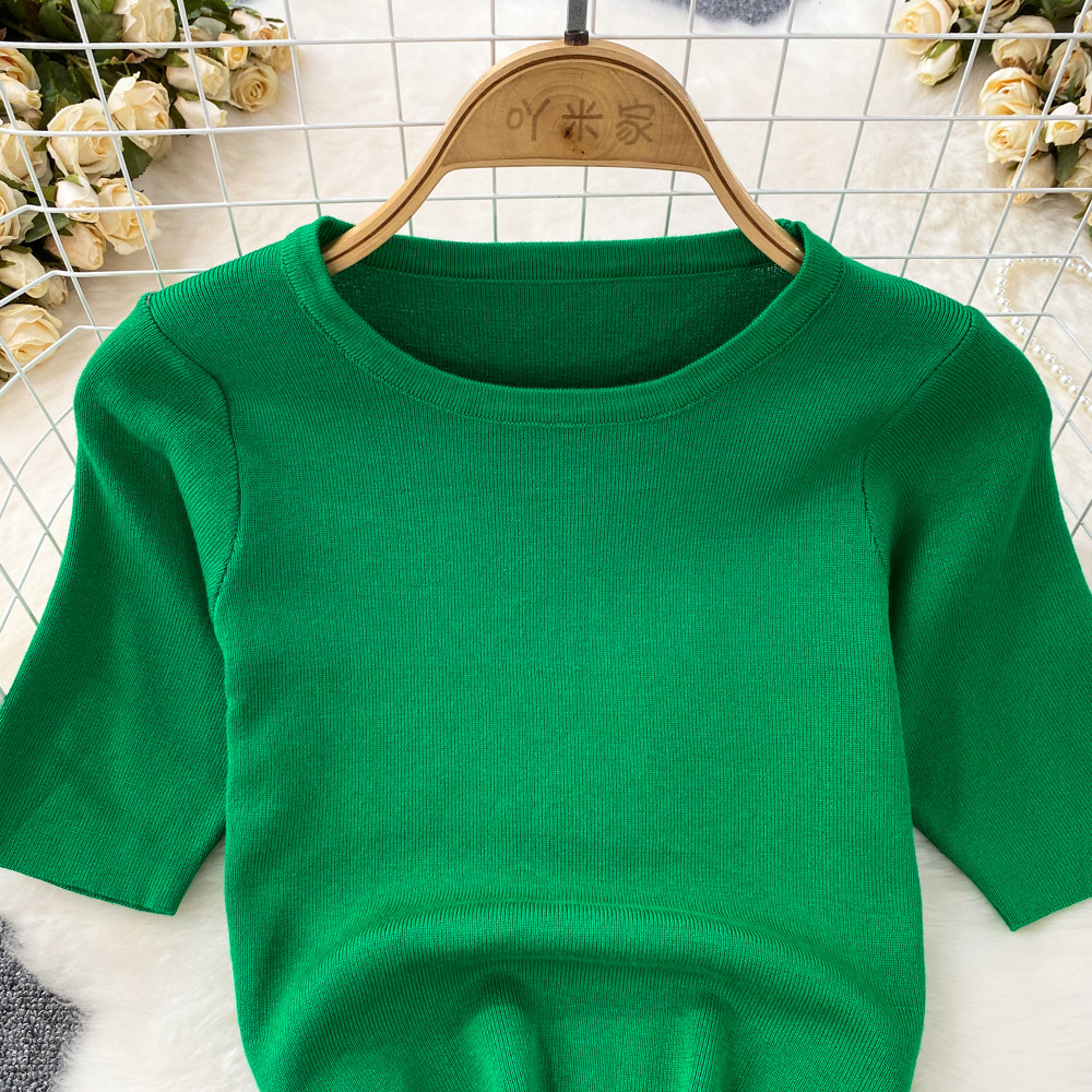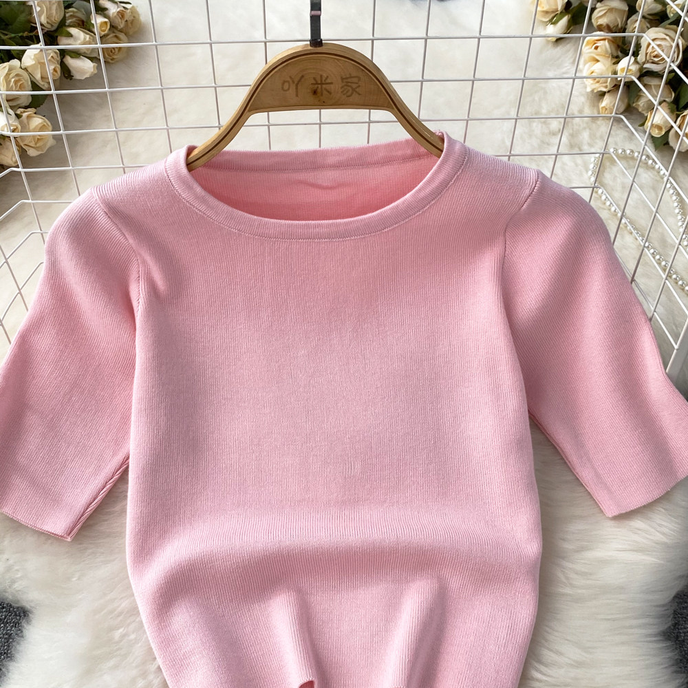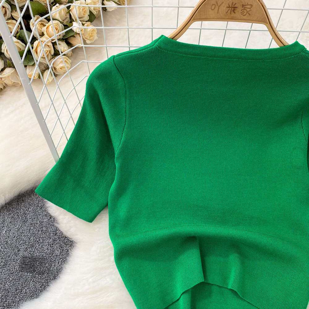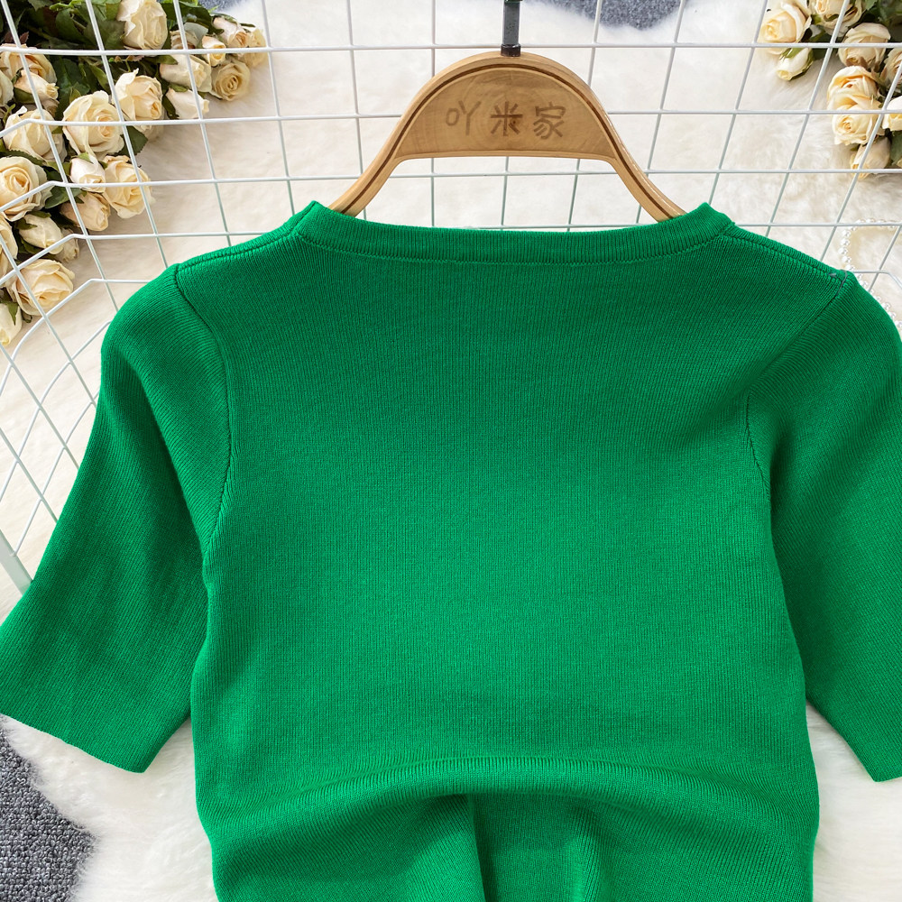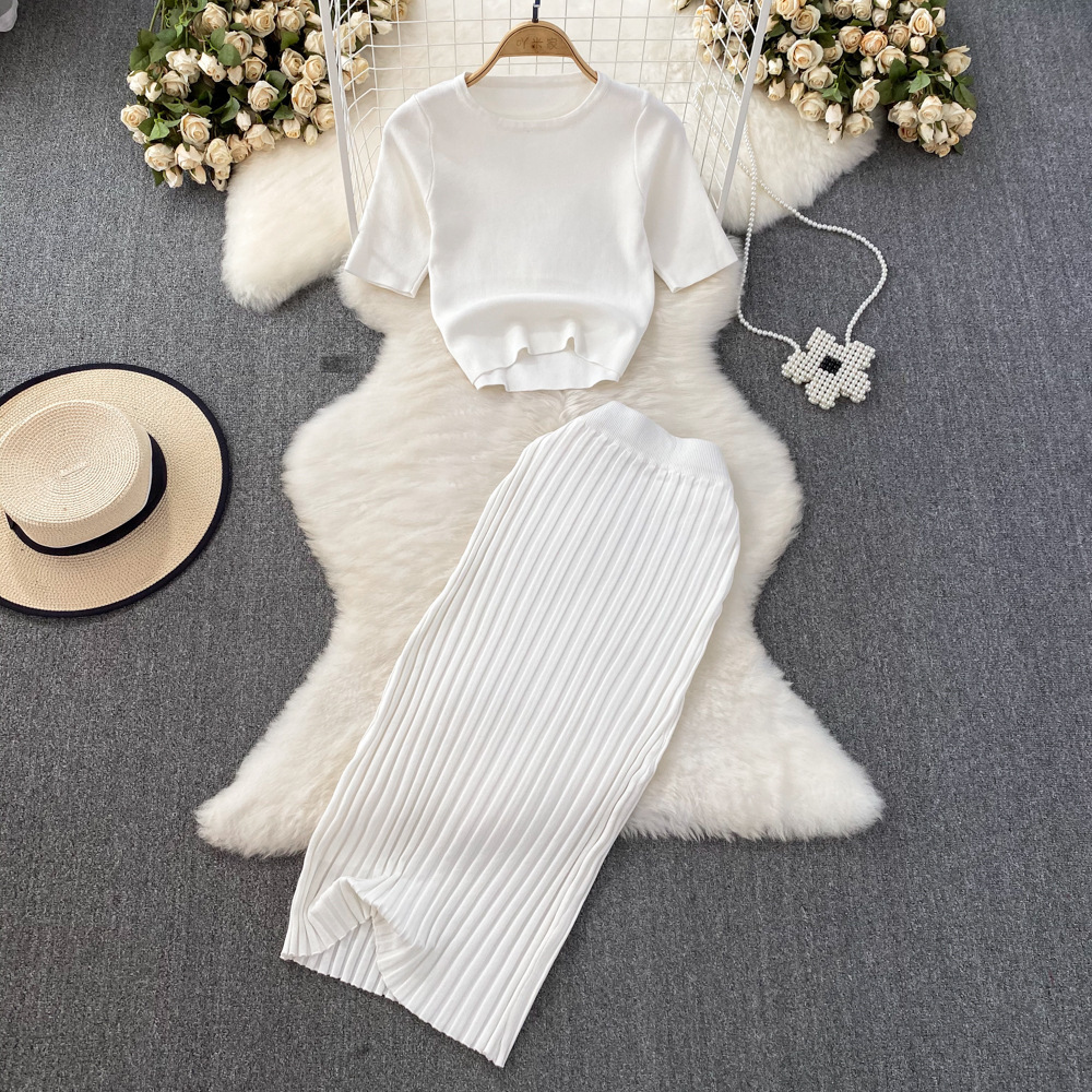 여성용 패션 정장 한국식 반팔 라운드 넥 슬림 니트 스웨터 탑 투피스 세트 하이 웨이스트 중간 길이 스커트 여름스토어 가기
