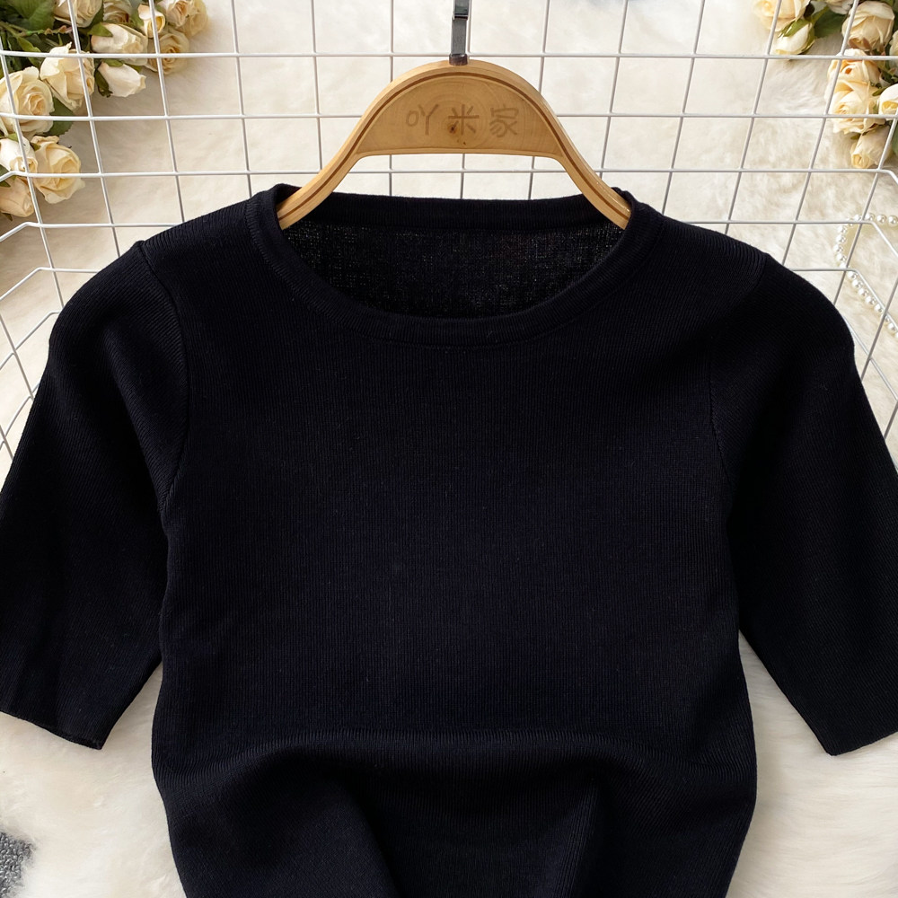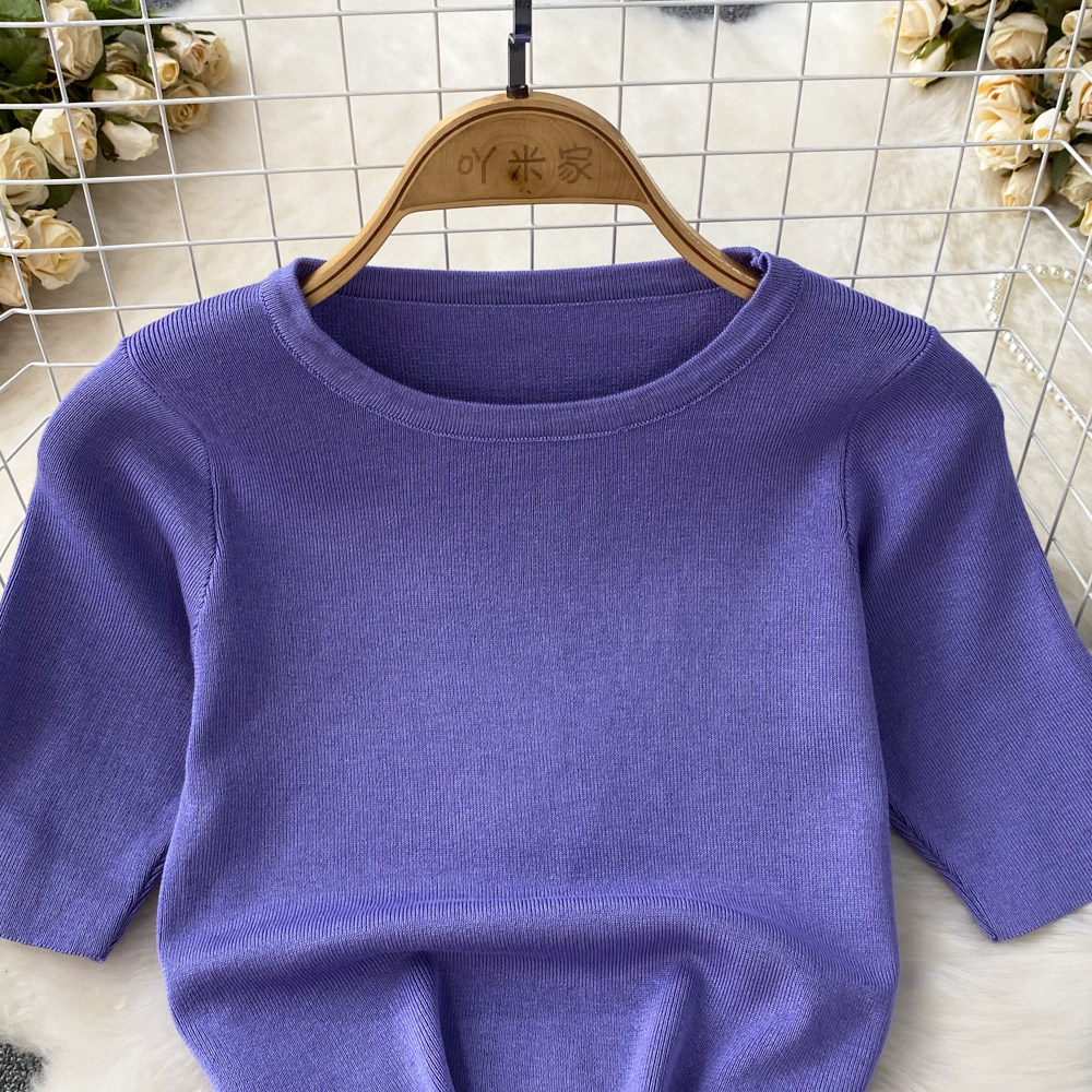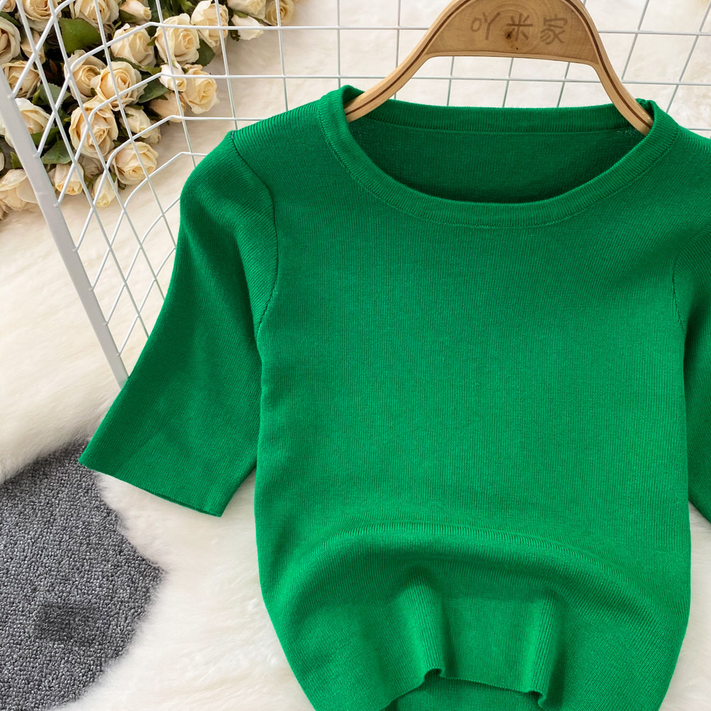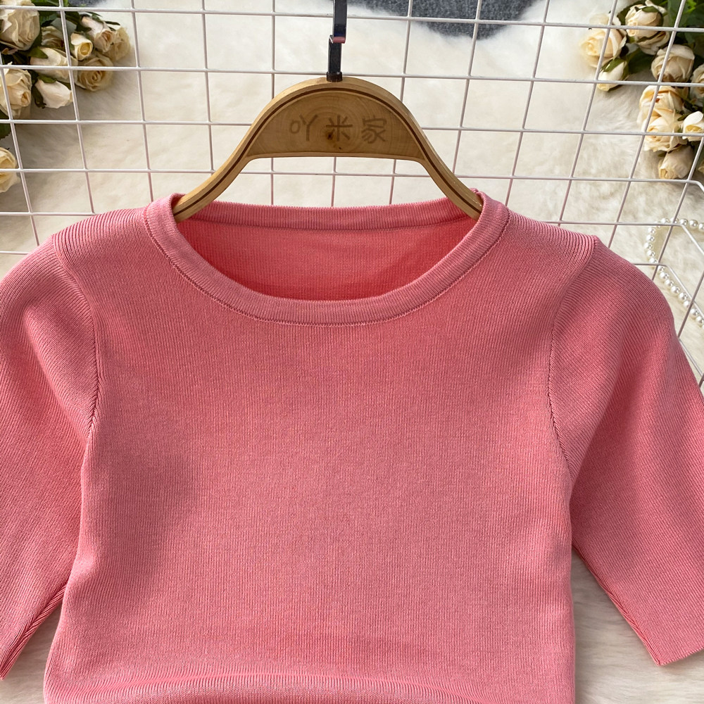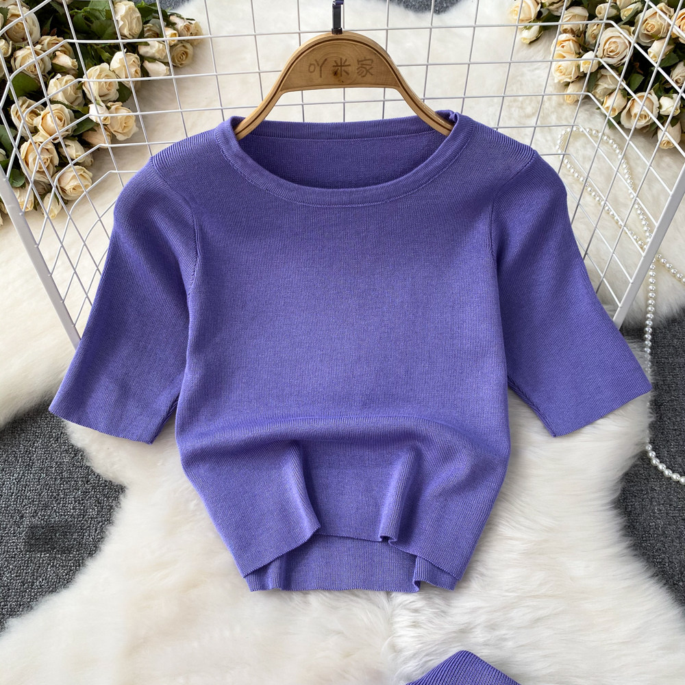 여성용 패션 정장 한국식 반팔 라운드 넥 슬림 니트 스웨터 탑 투피스 세트 하이 웨이스트 중간 길이 스커트 여름스토어 가기
