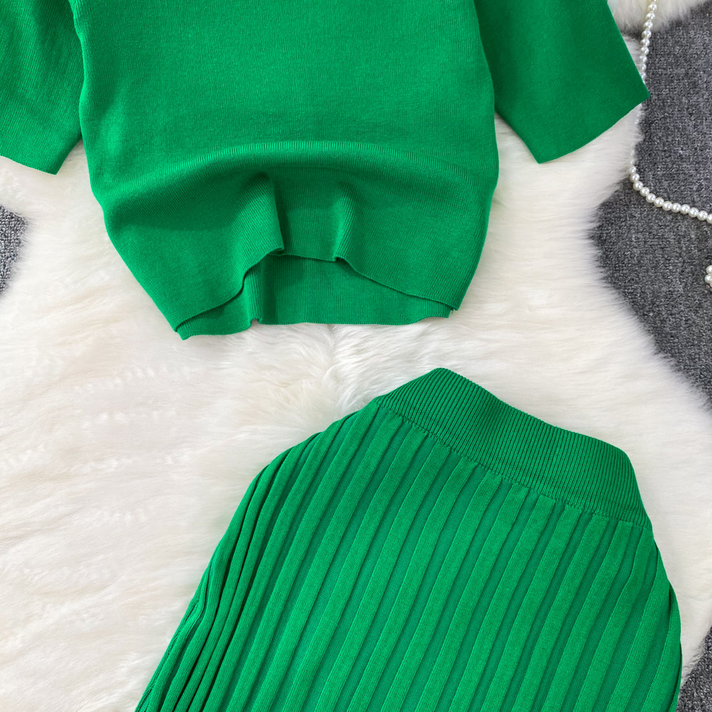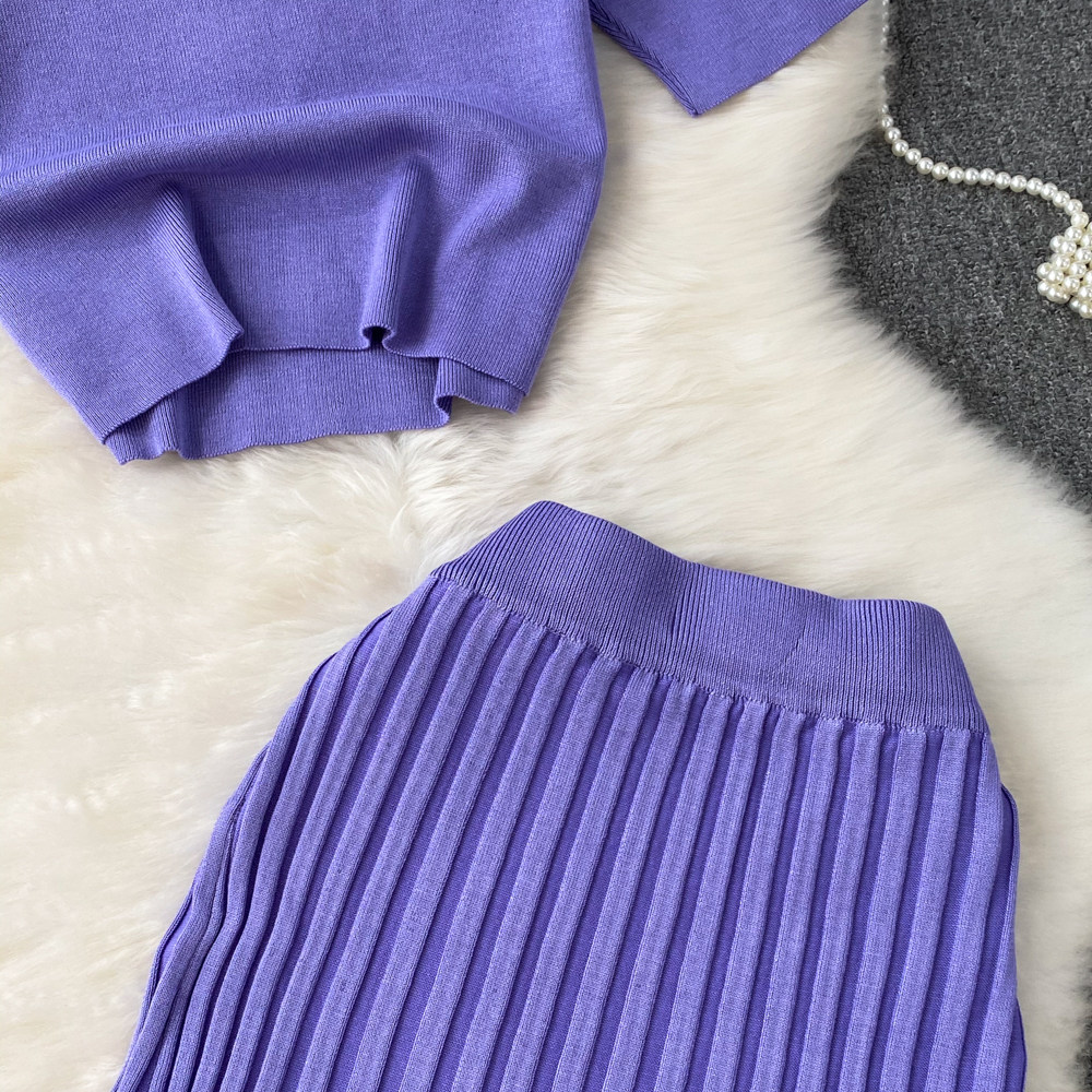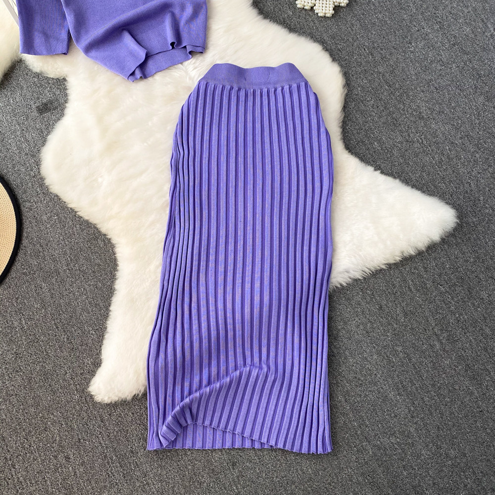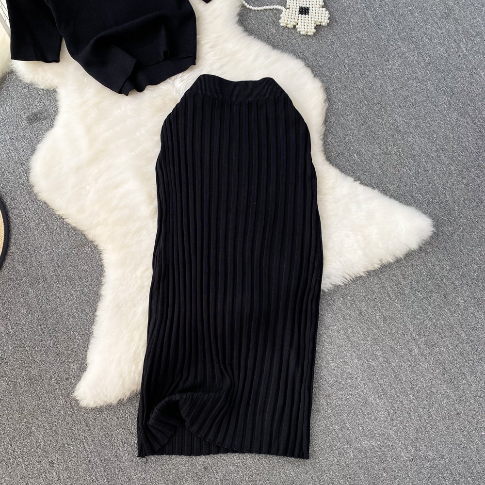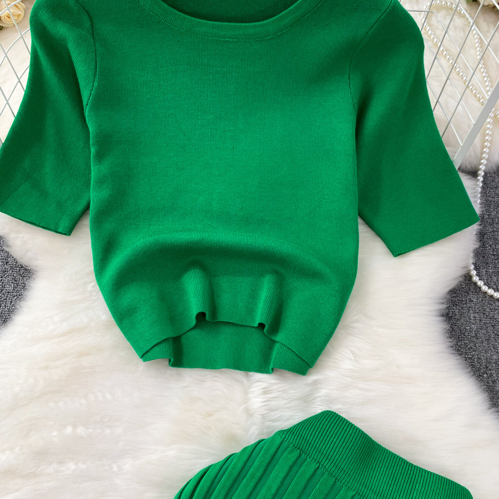 여성용 패션 정장 한국식 반팔 라운드 넥 슬림 니트 스웨터 탑 투피스 세트 하이 웨이스트 중간 길이 스커트 여름