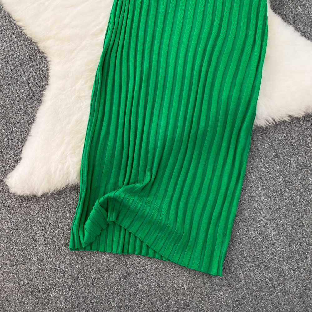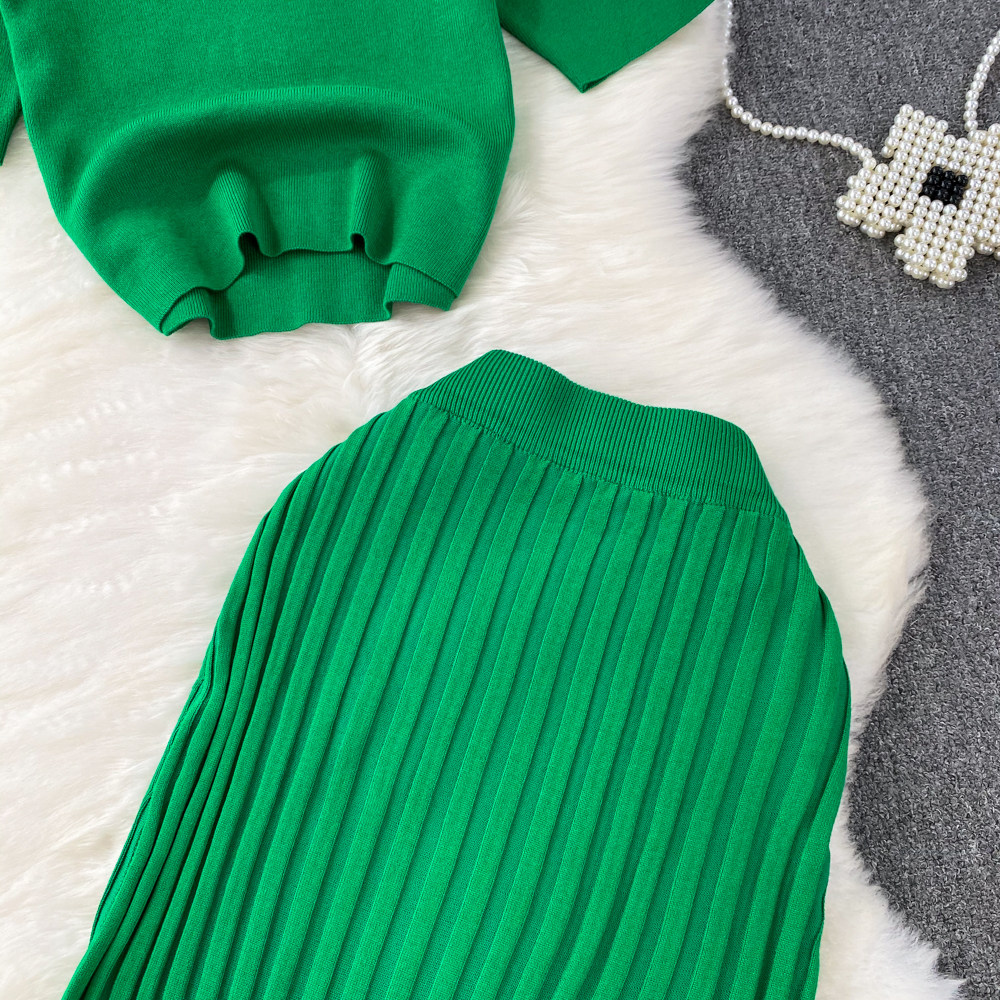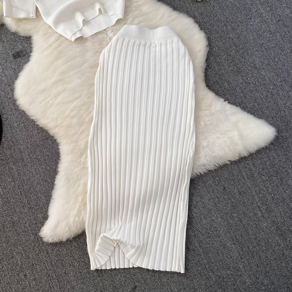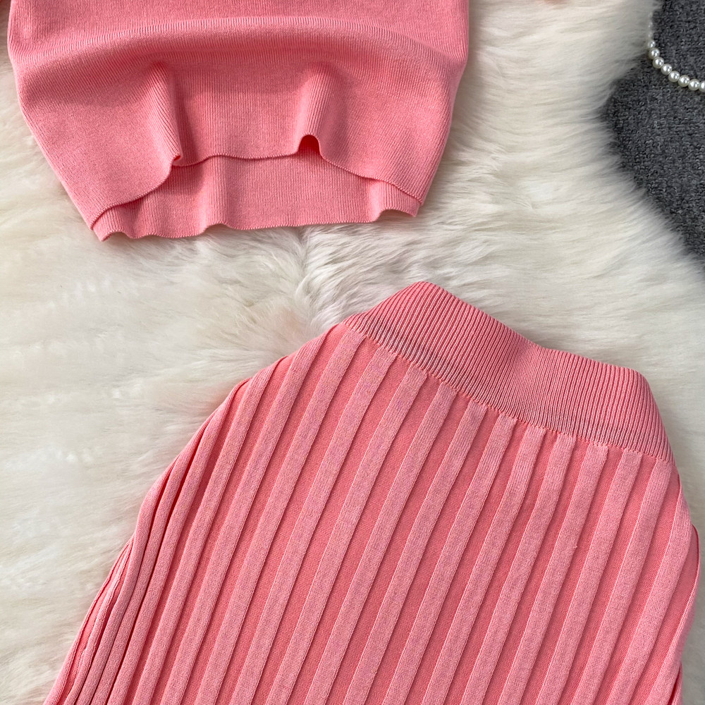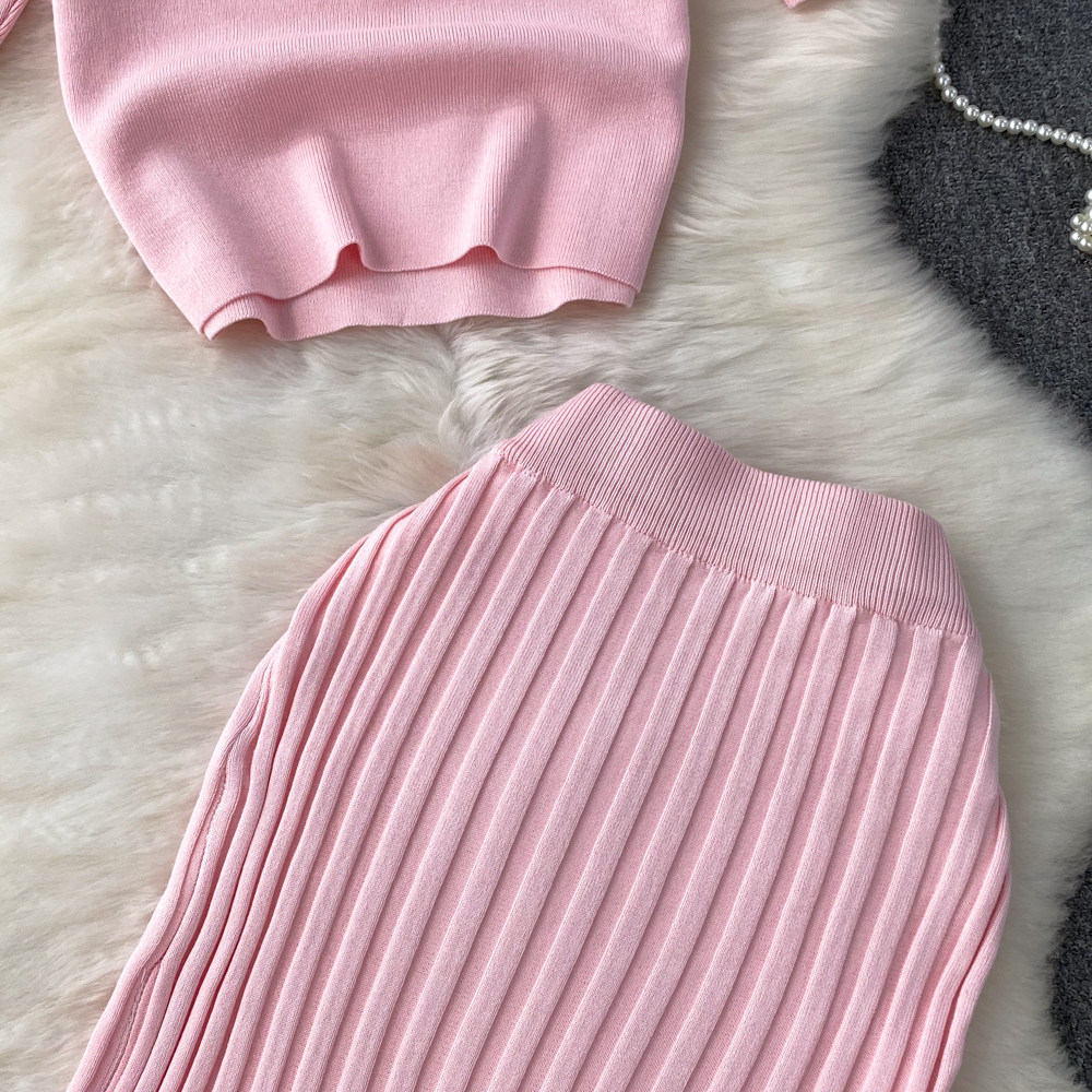 여성용 패션 정장 한국식 반팔 라운드 넥 슬림 니트 스웨터 탑 투피스 세트 하이 웨이스트 중간 길이 스커트 여름