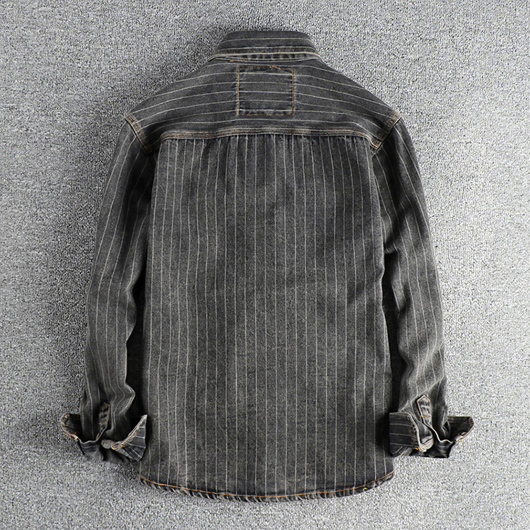 영국 복고풍 검정색과 회색 줄무늬 데님 셔츠 남성 가을 신작 작업복 포켓 셔츠 재킷