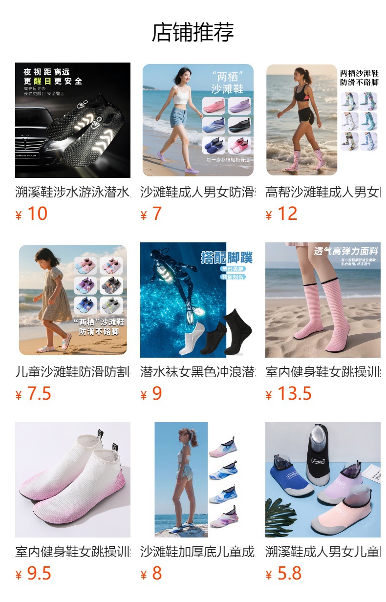 긴통형 비치 슈즈, 논에 모내는 농사용 신발, 여성용 방수화, 물길을 걷는 신발, 연못 및 모래사장용 신발, 워터 부츠, 양말, 속건성 신발스토어 가기