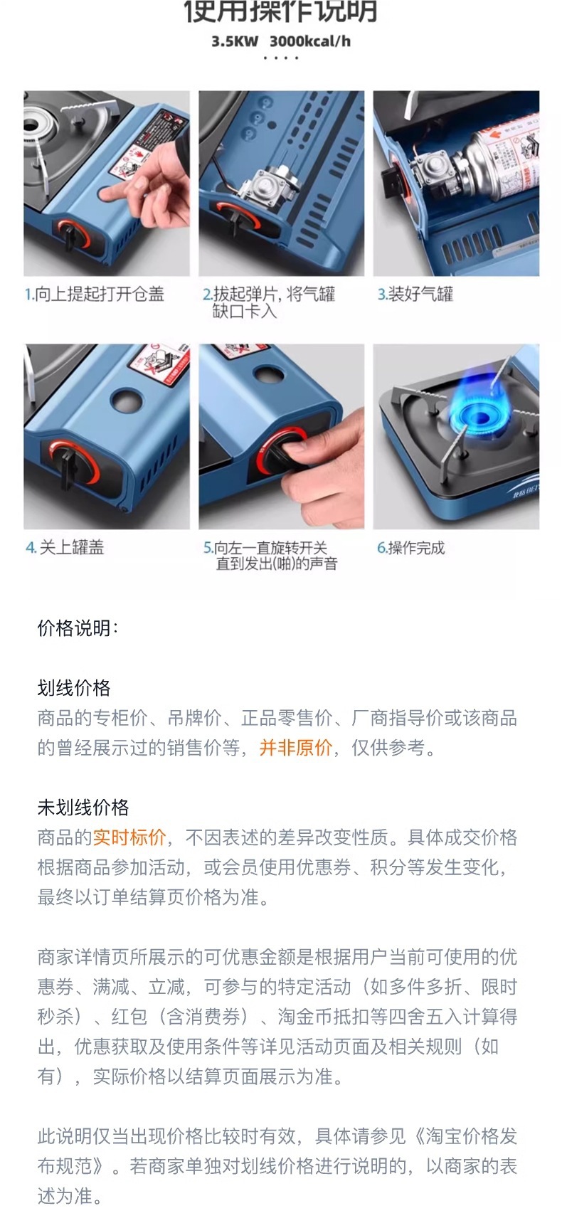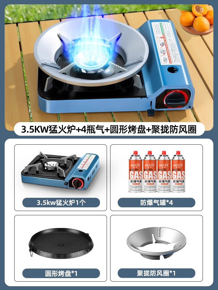 • 3500W 강력한 스토브 + 가스 4병 + 원형 베이킹 팬 + 집결 방풍 링