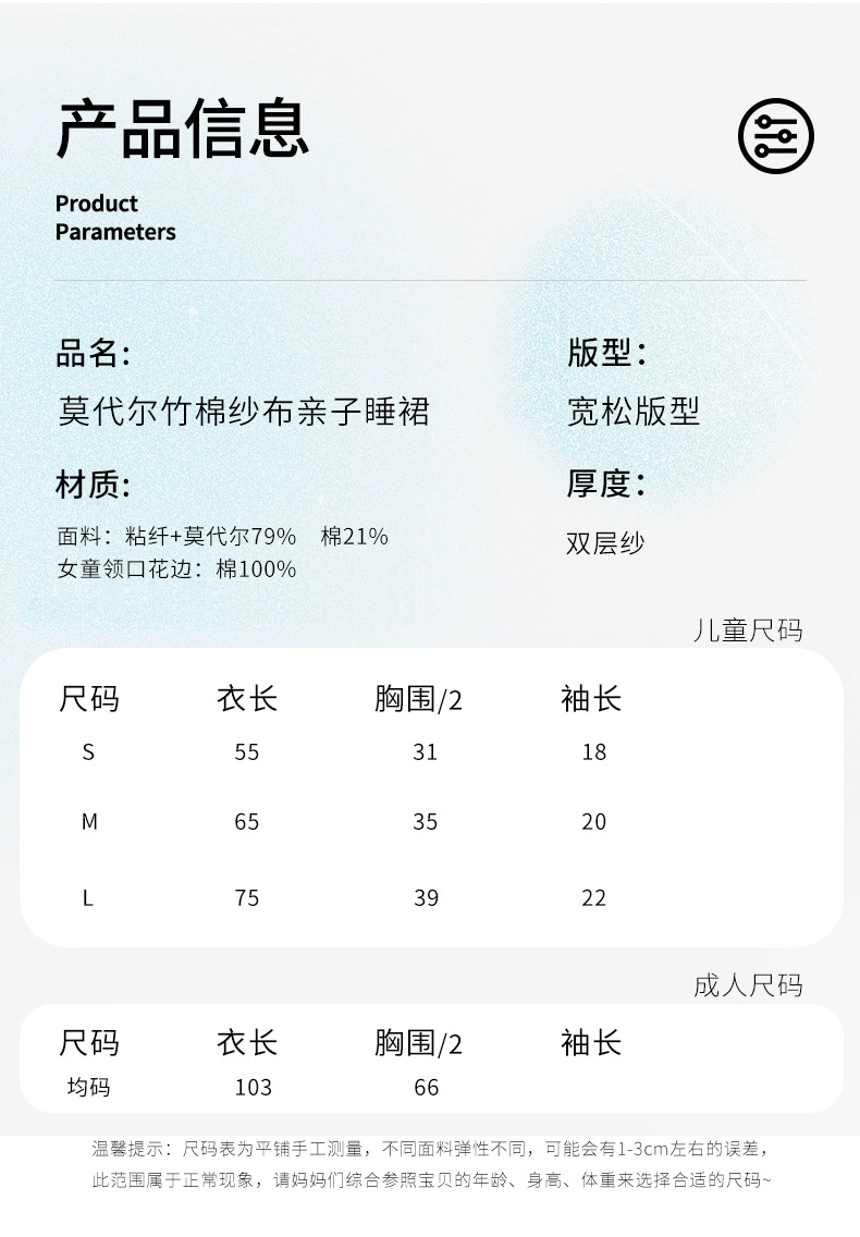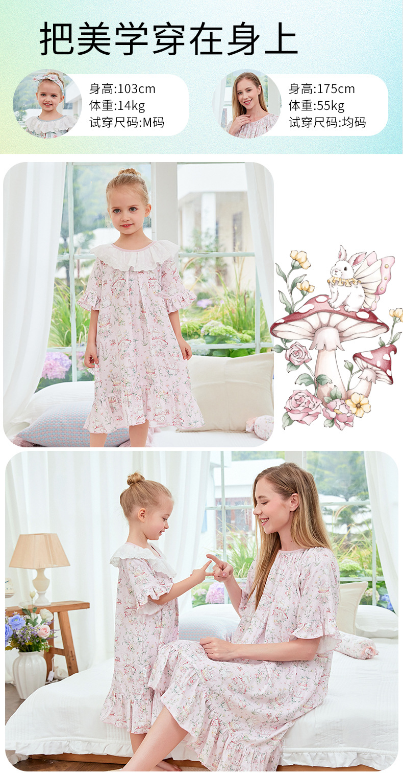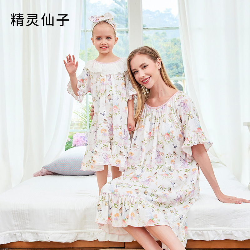 여자 나이트가운 클래스 A 여름 얇은 대나무 코튼 모달 거즈 아기 소녀 성인 부모를위한 통기성 반팔 잠옷
