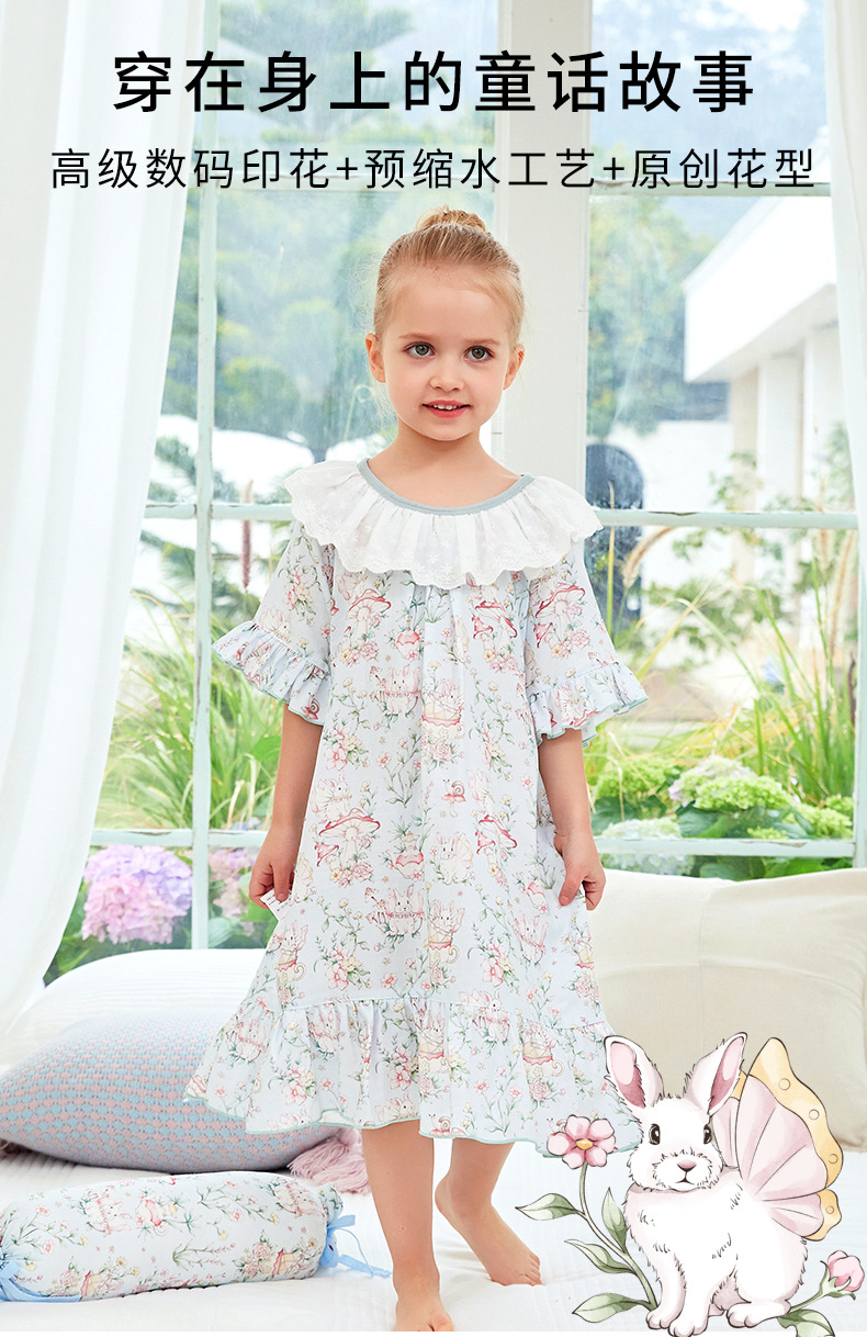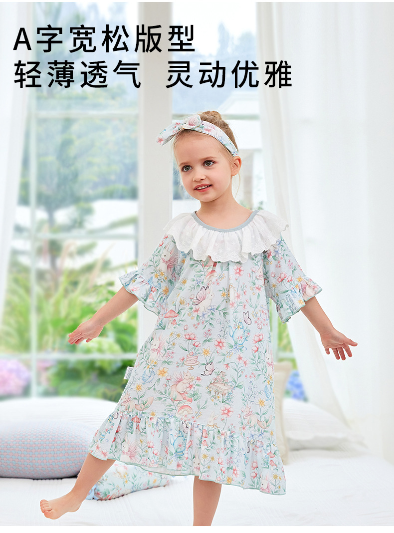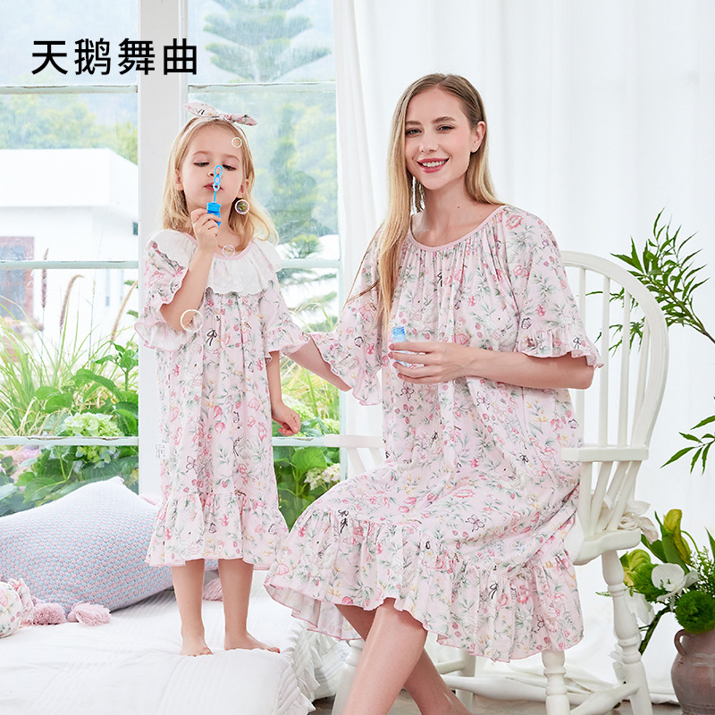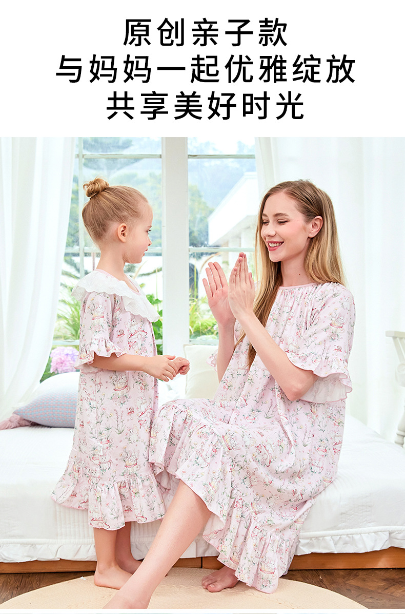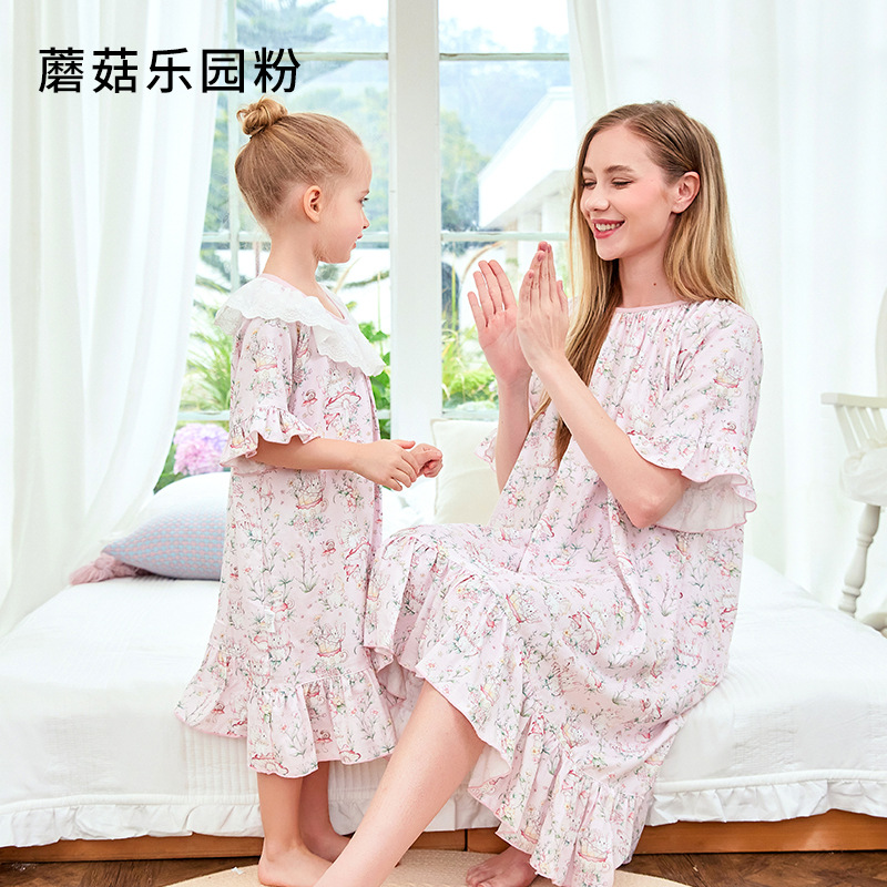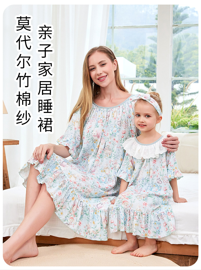 여자 나이트가운 클래스 A 여름 얇은 대나무 코튼 모달 거즈 아기 소녀 성인 부모를위한 통기성 반팔 잠옷스토어 가기