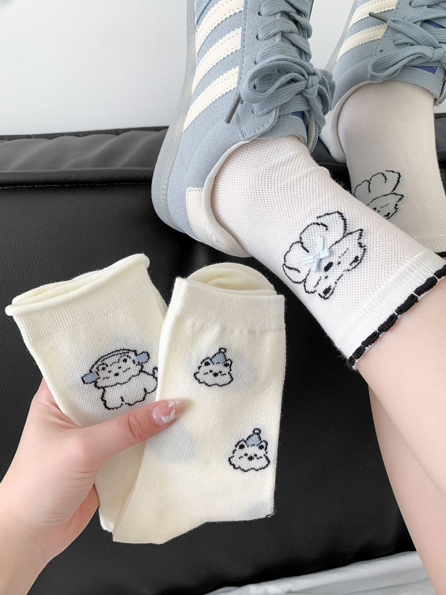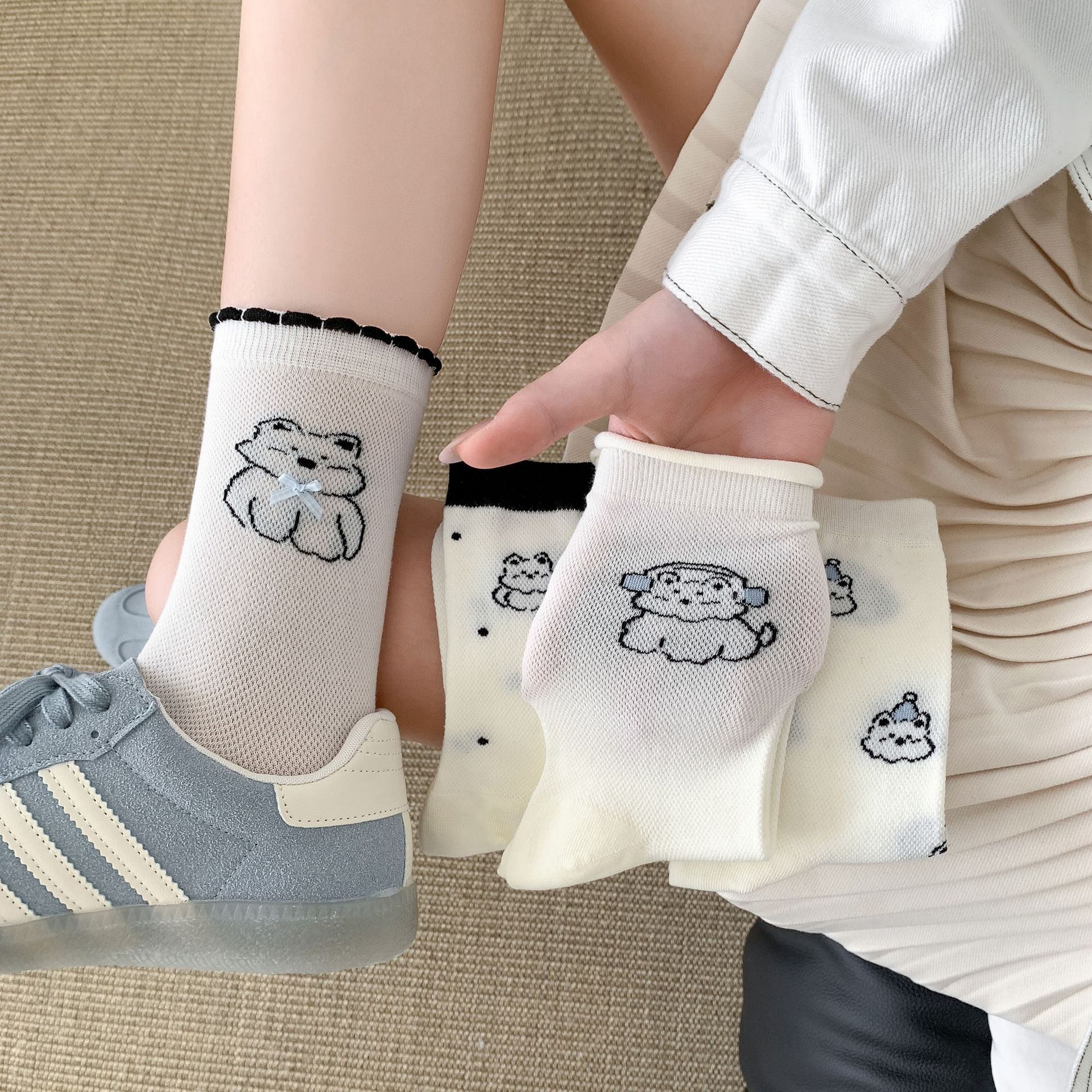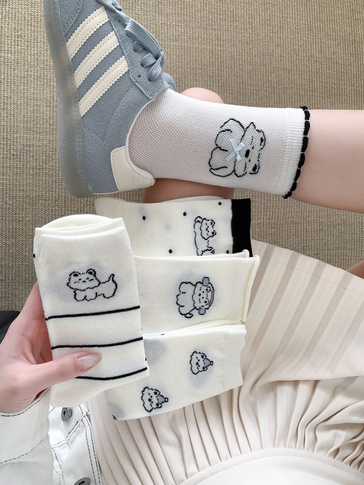 여성용 메쉬 여름 얇은 만화 강아지 양말, 땀 흡수성, 통기성, 심플하고 귀여운 줄무늬 폴카 도트 흰색 종아리 양말