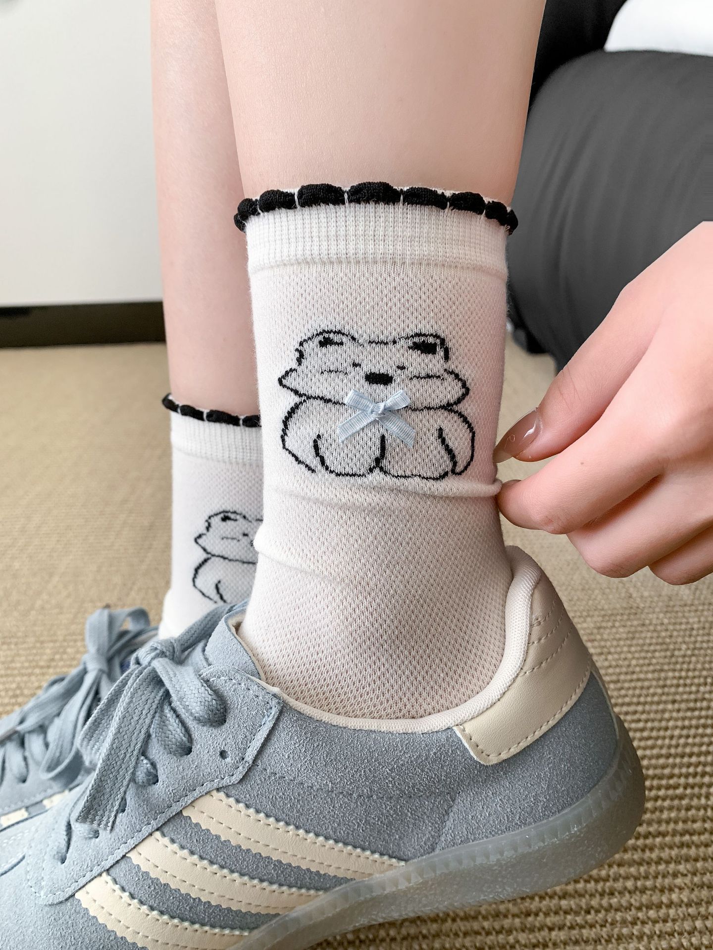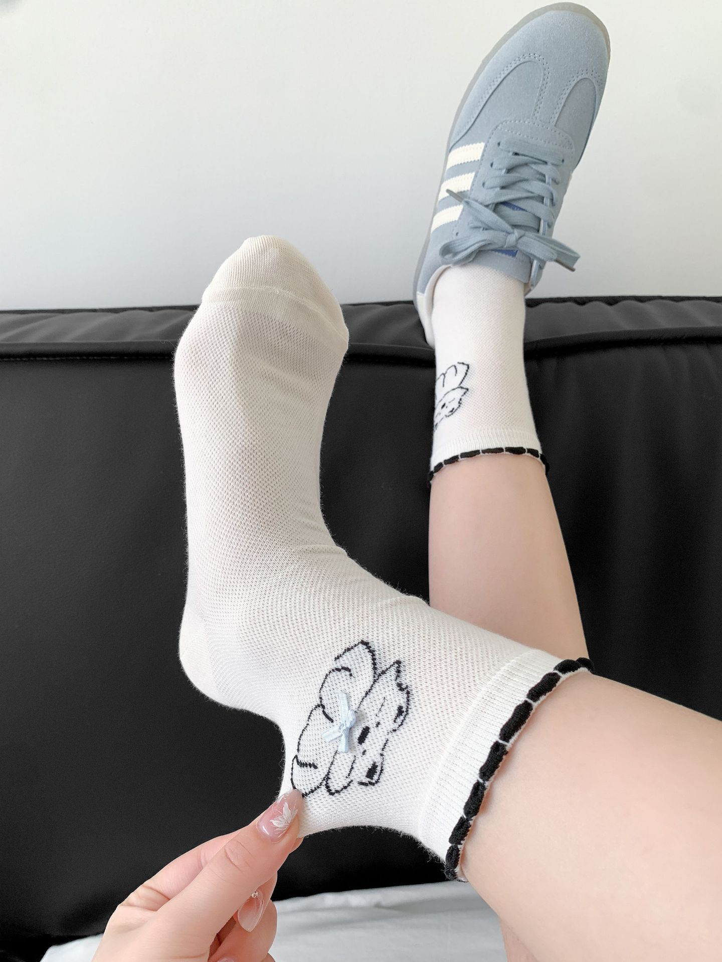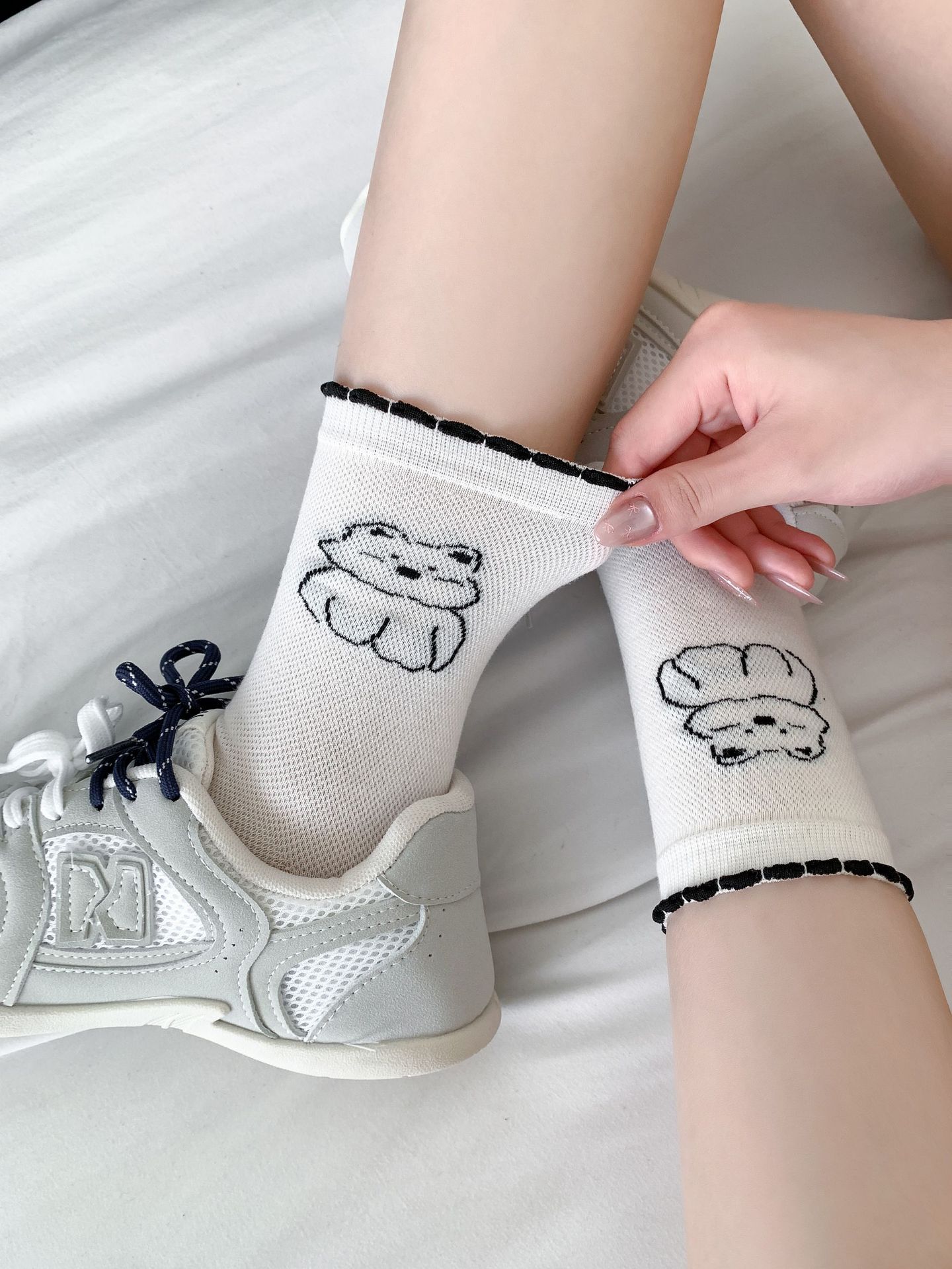 여성용 메쉬 여름 얇은 만화 강아지 양말, 땀 흡수성, 통기성, 심플하고 귀여운 줄무늬 폴카 도트 흰색 종아리 양말