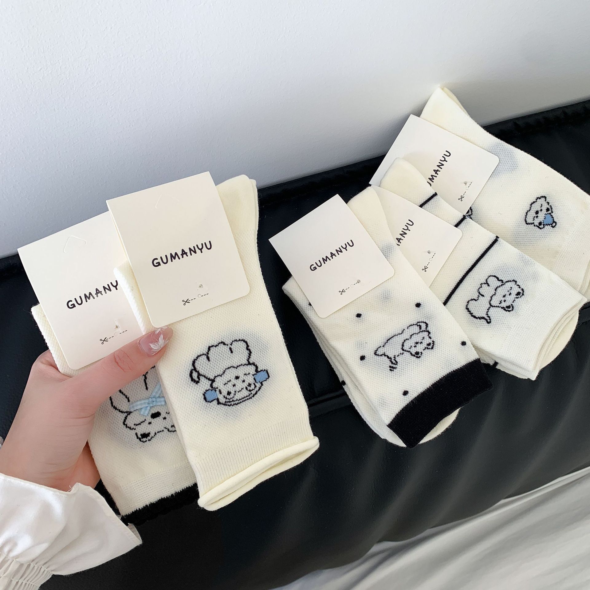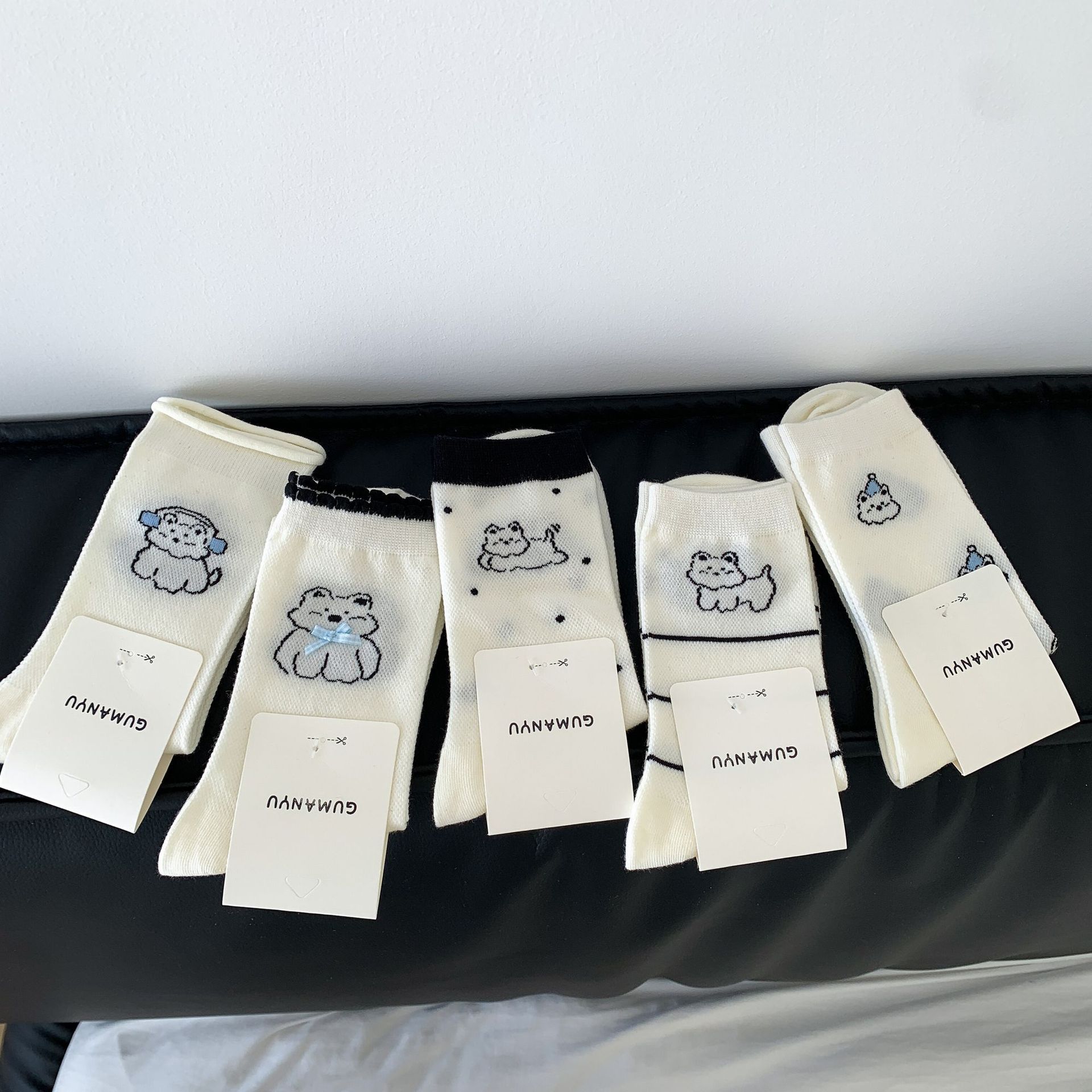 여성용 메쉬 여름 얇은 만화 강아지 양말, 땀 흡수성, 통기성, 심플하고 귀여운 줄무늬 폴카 도트 흰색 종아리 양말스토어 가기