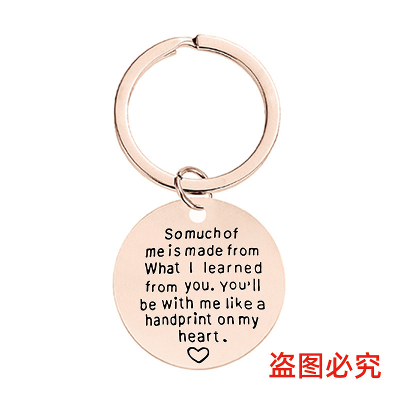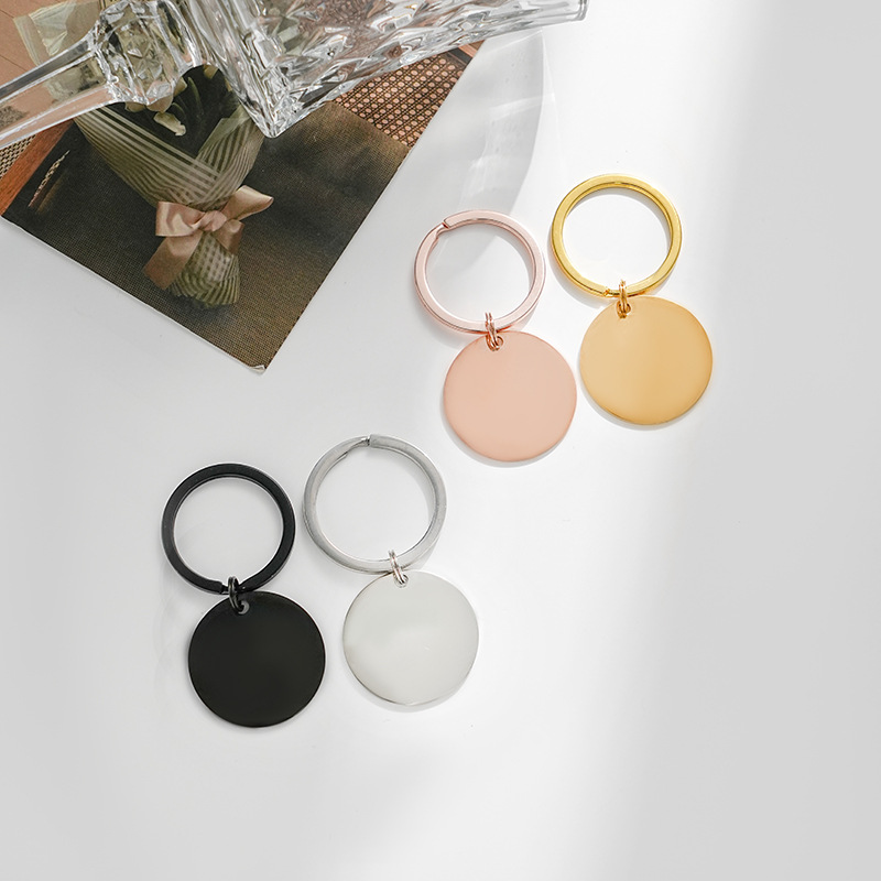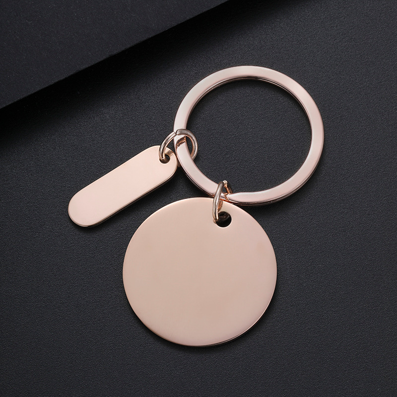 • 로즈 골드 키체인 + 동일한 색상의 스테인레스 스틸 각인 펜던트, 내용 맞춤 설정 가능