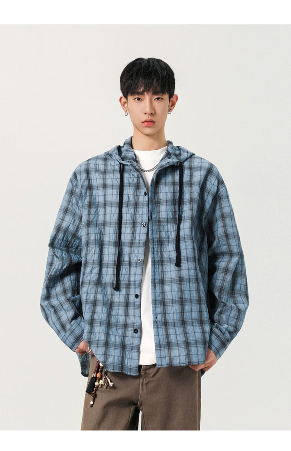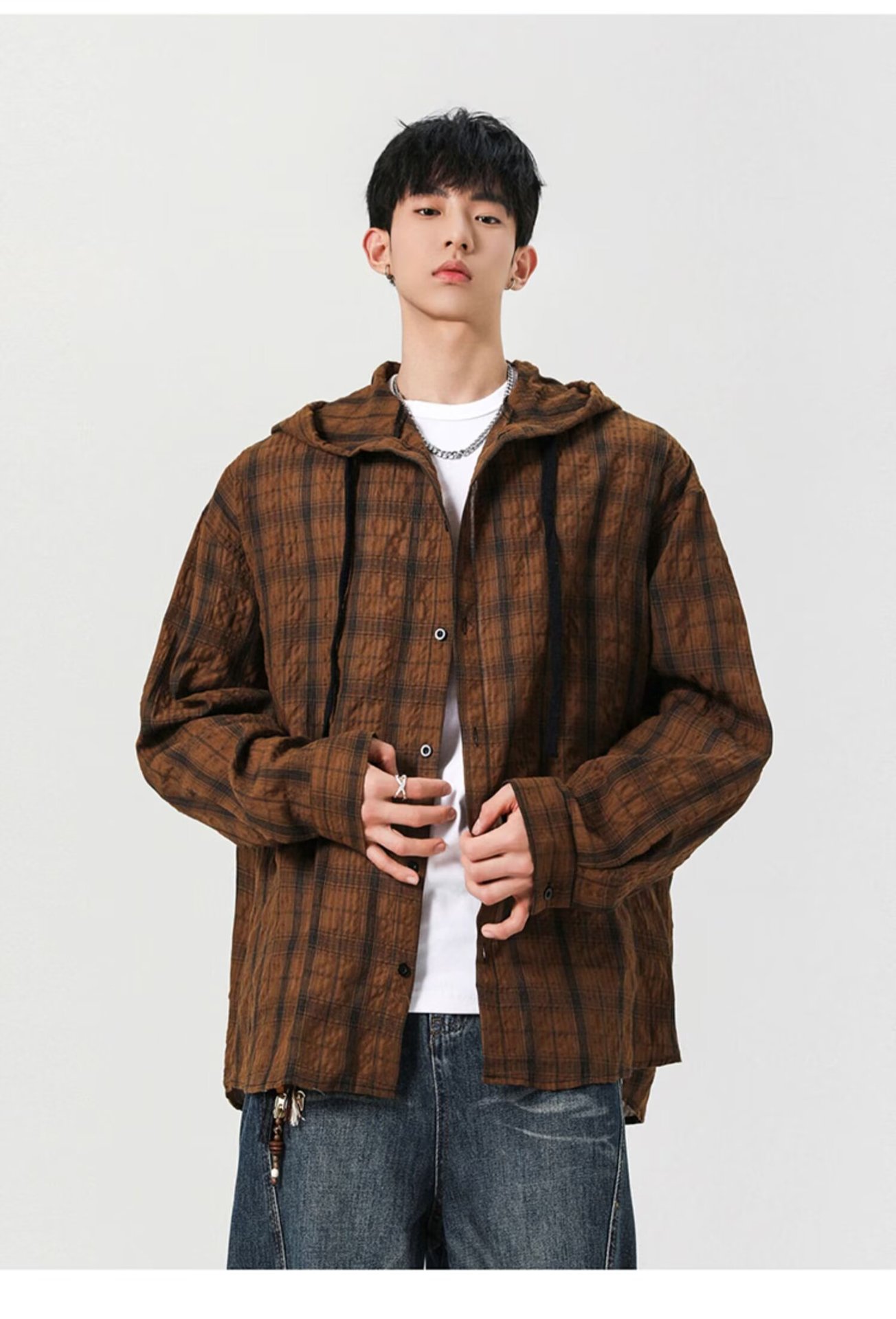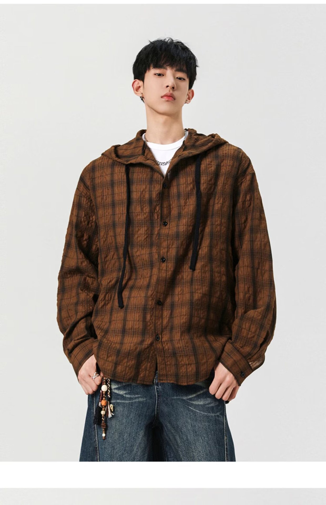 미국 트렌디 브랜드 격자 무늬 셔츠 남성용 후드 긴팔 자외선 차단 재킷 남성용 2025 새로운 복고풍 캐주얼 바닥 셔츠스토어 가기