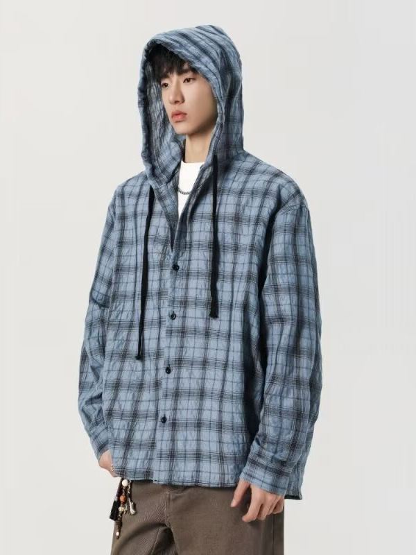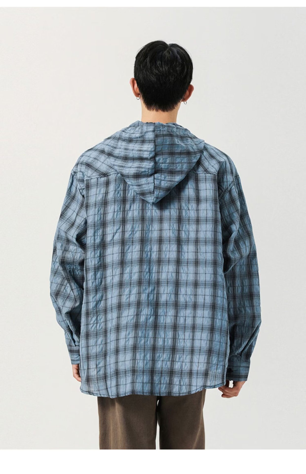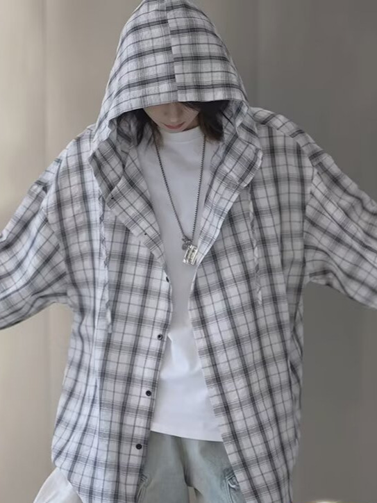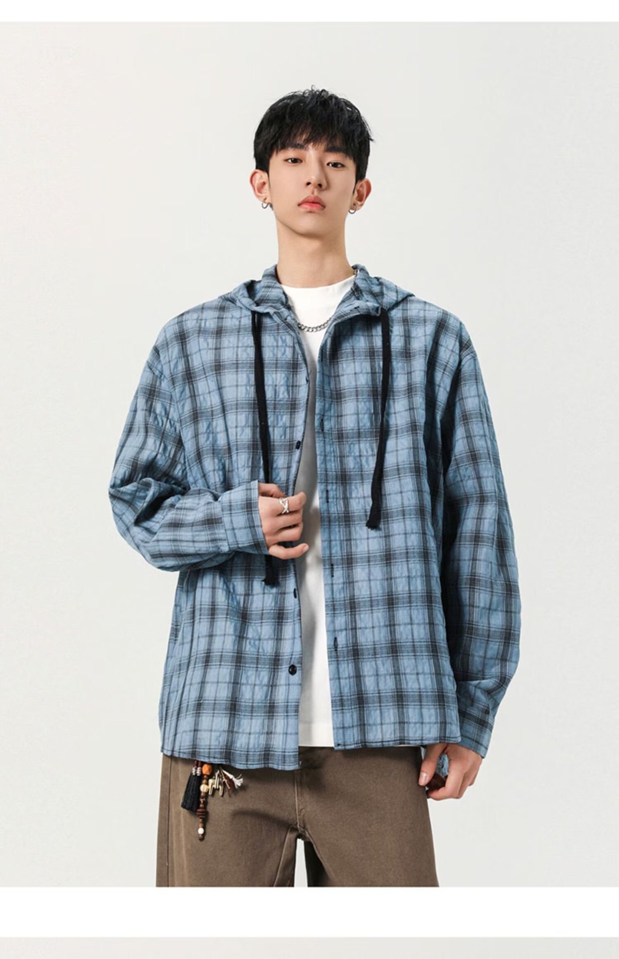 미국 트렌디 브랜드 격자 무늬 셔츠 남성용 후드 긴팔 자외선 차단 재킷 남성용 2025 새로운 복고풍 캐주얼 바닥 셔츠스토어 가기