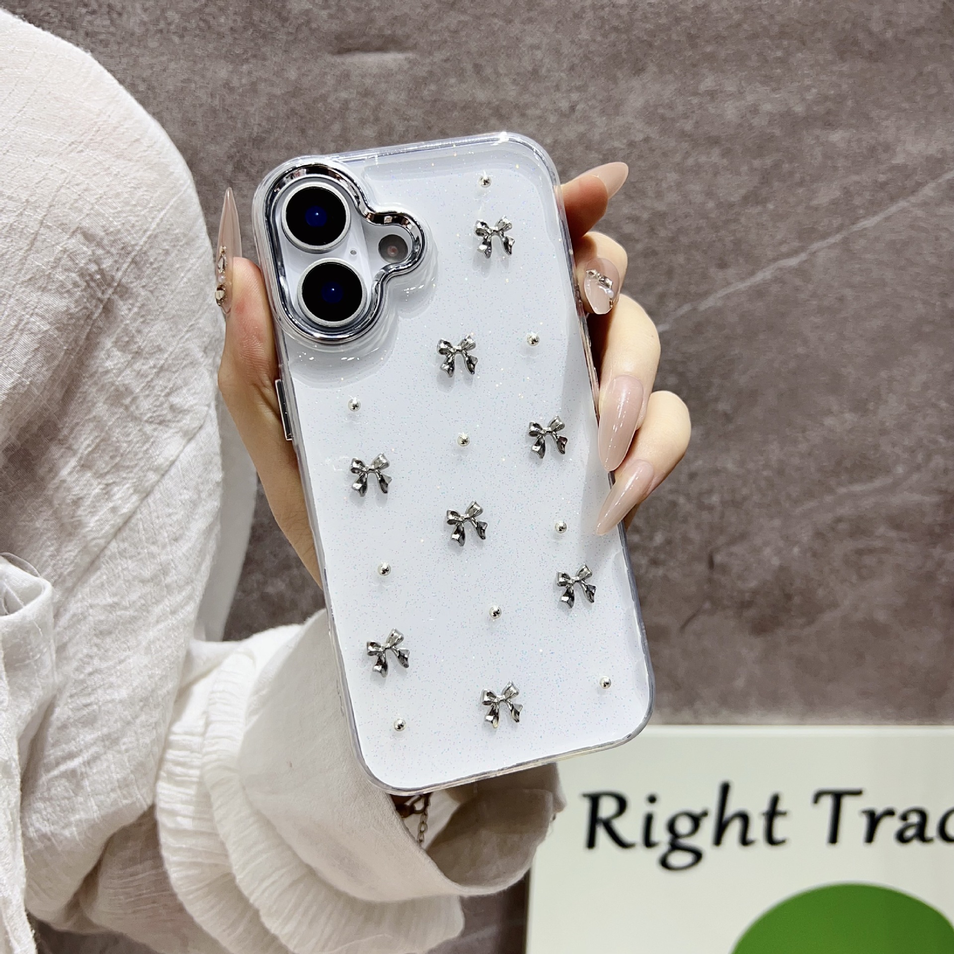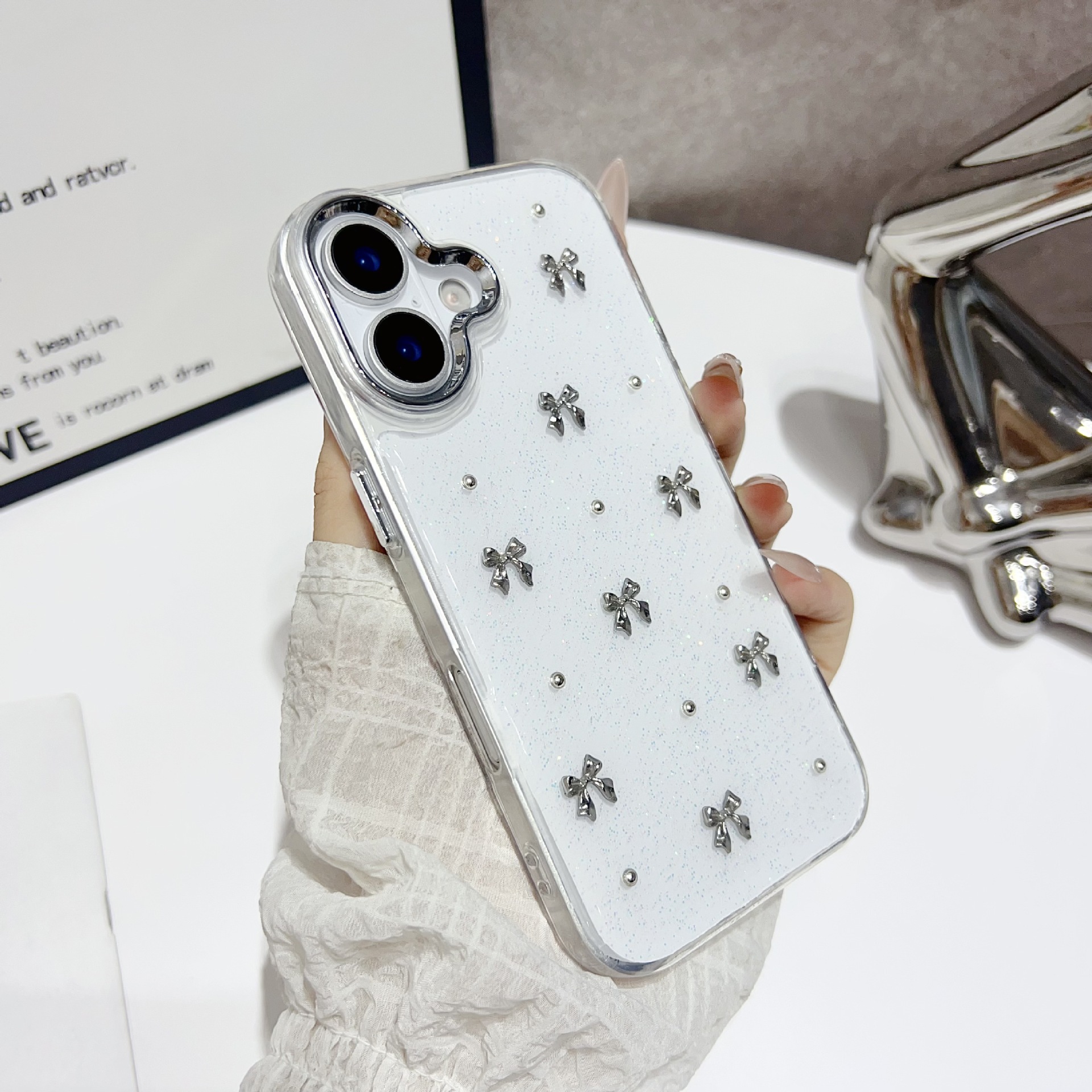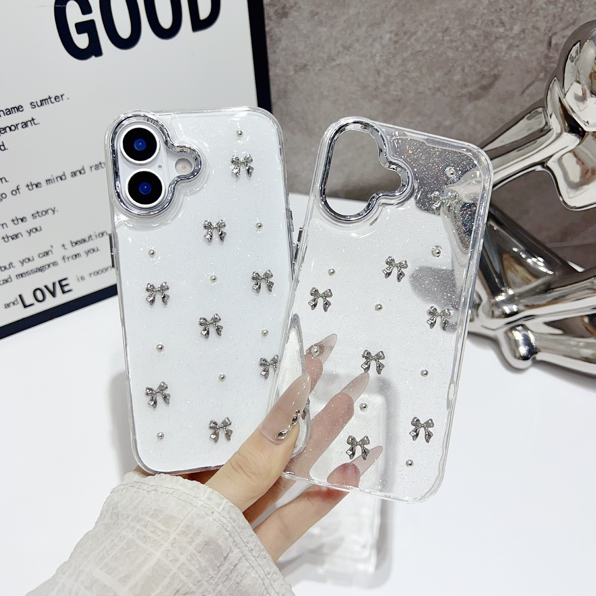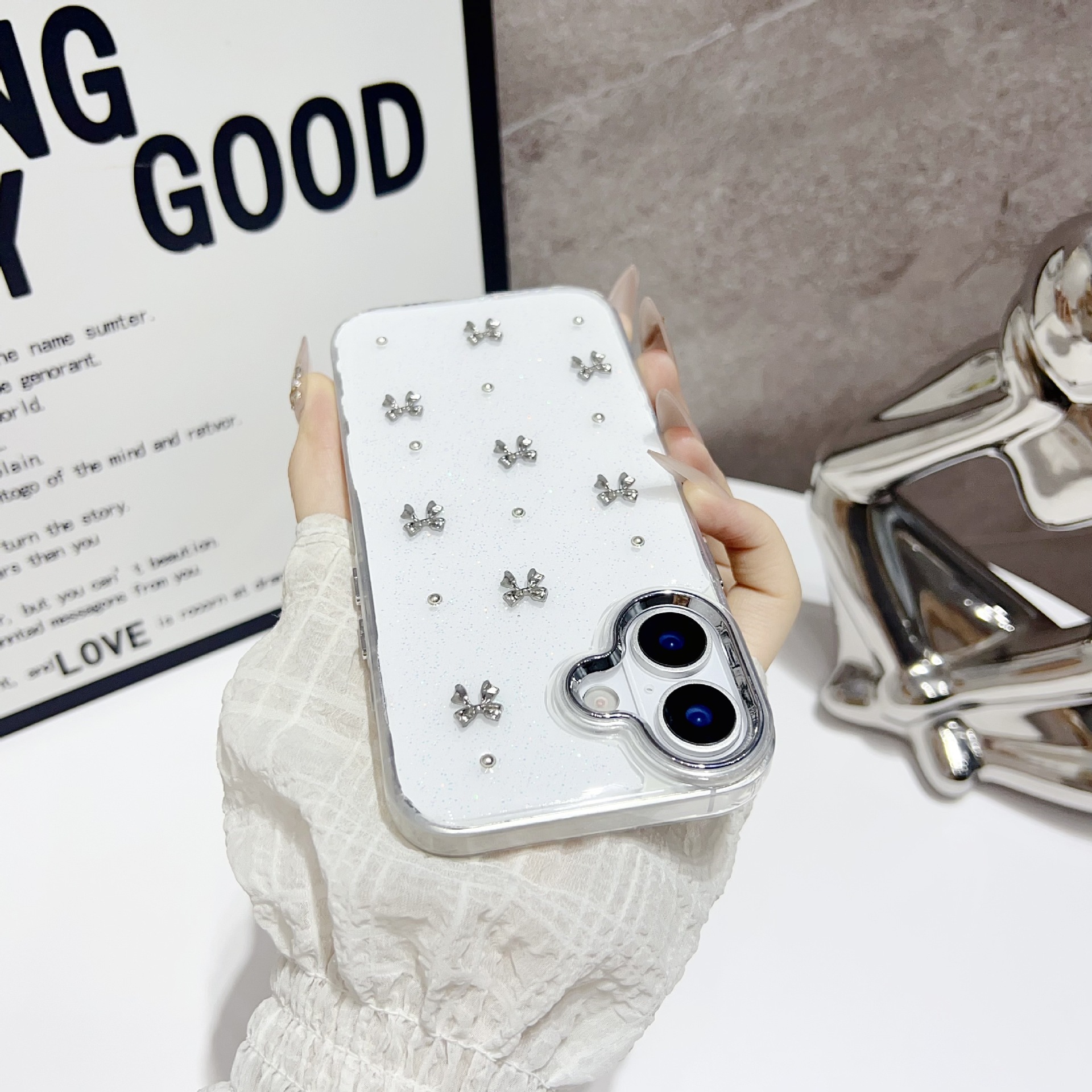IPhone16 반짝이 전화 케이스 전기 도금 버튼 애플 11/15 보호를위한 아름다운 눈 방울 접착제 실버 활