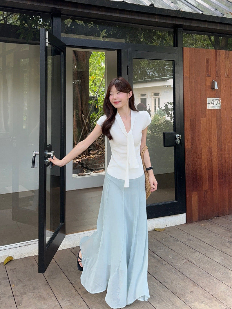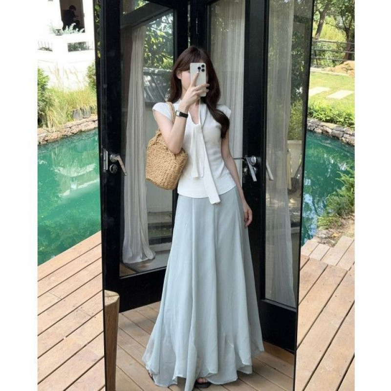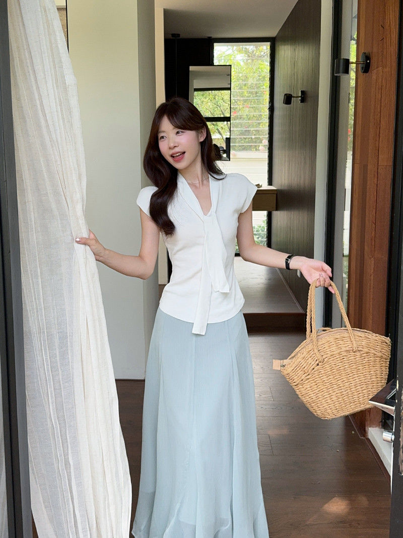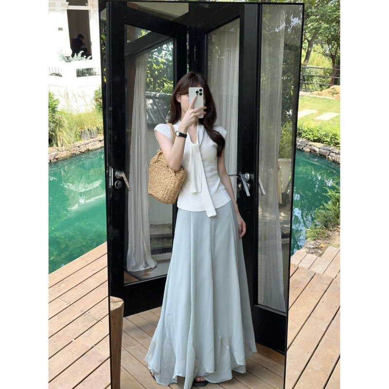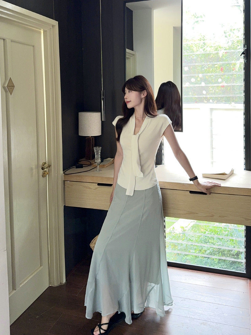 젠틀 스타일 슈트 니치 브이넥 스트랩 반팔 티셔츠 여성 여름 하이웨이스트 힙 스커트 피쉬테일 스커트 투피스 세트