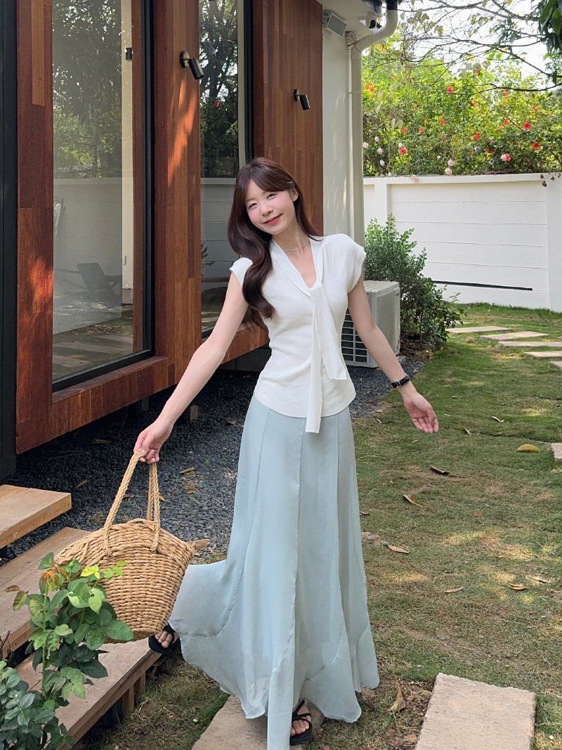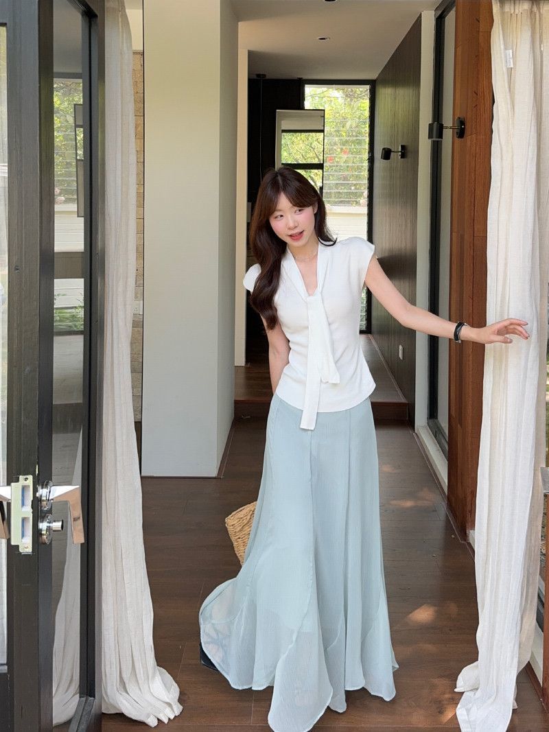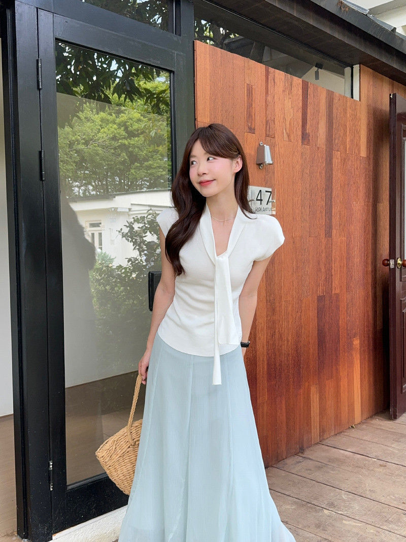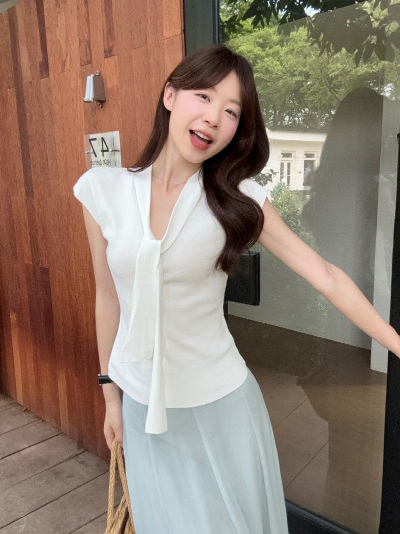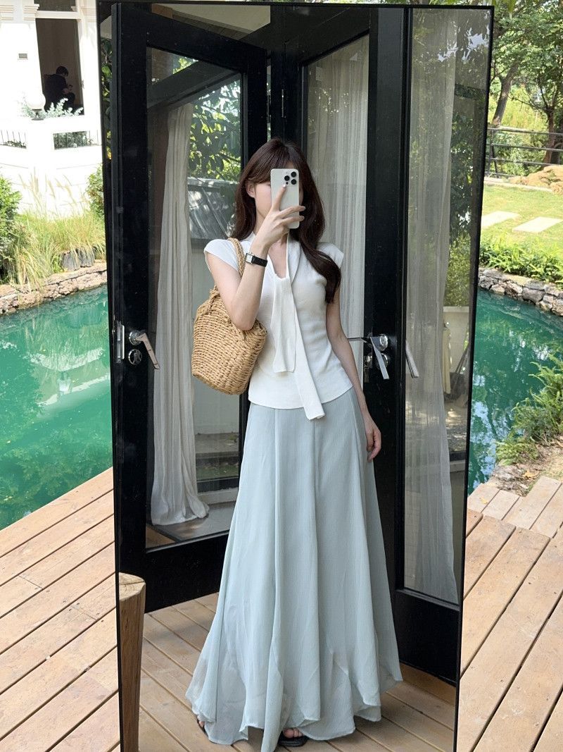 젠틀 스타일 슈트 니치 브이넥 스트랩 반팔 티셔츠 여성 여름 하이웨이스트 힙 스커트 피쉬테일 스커트 투피스 세트
