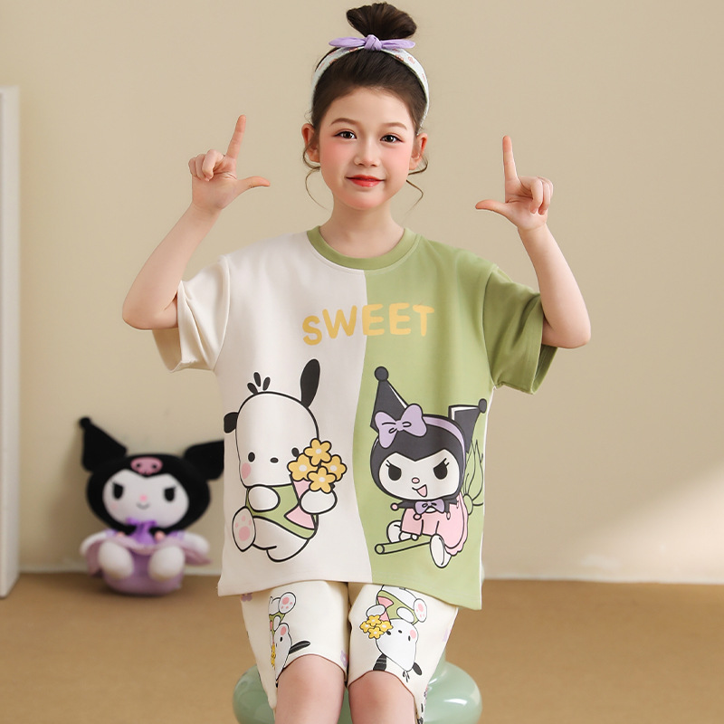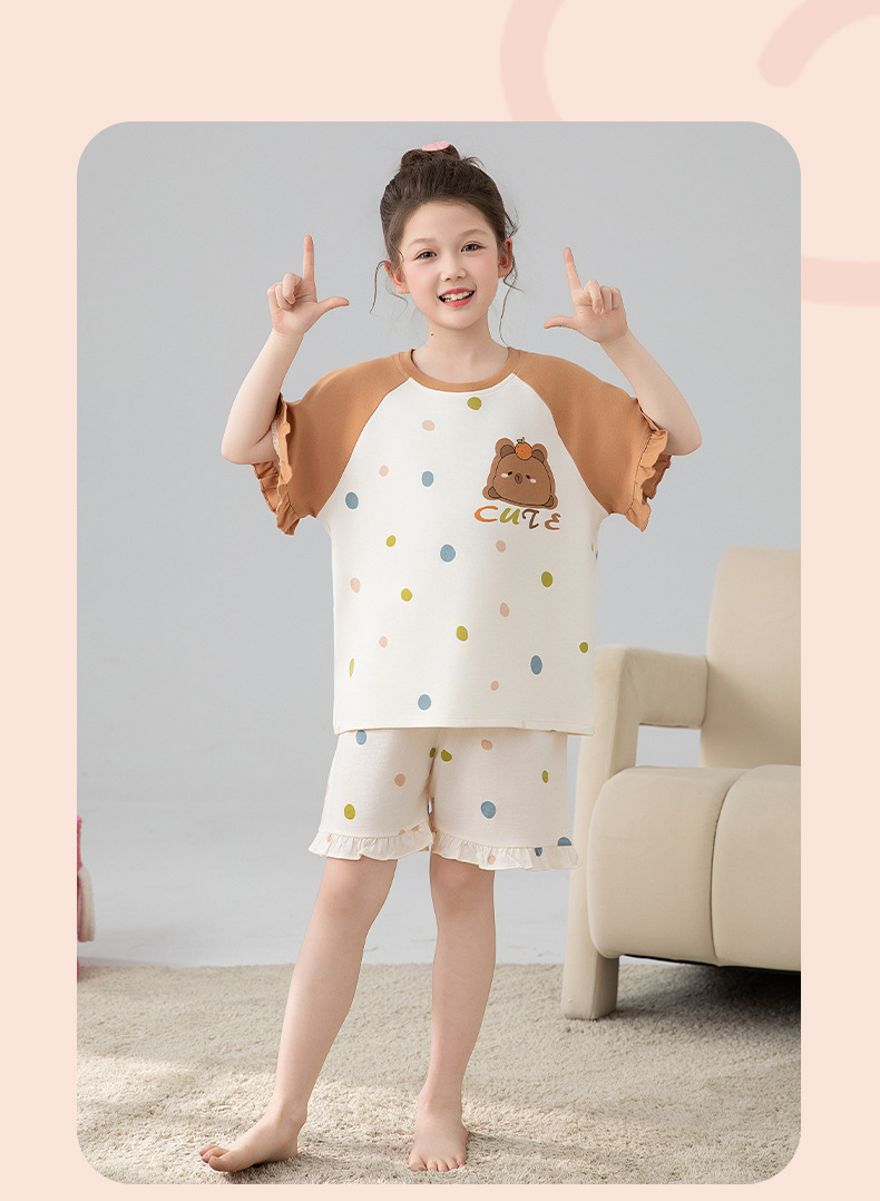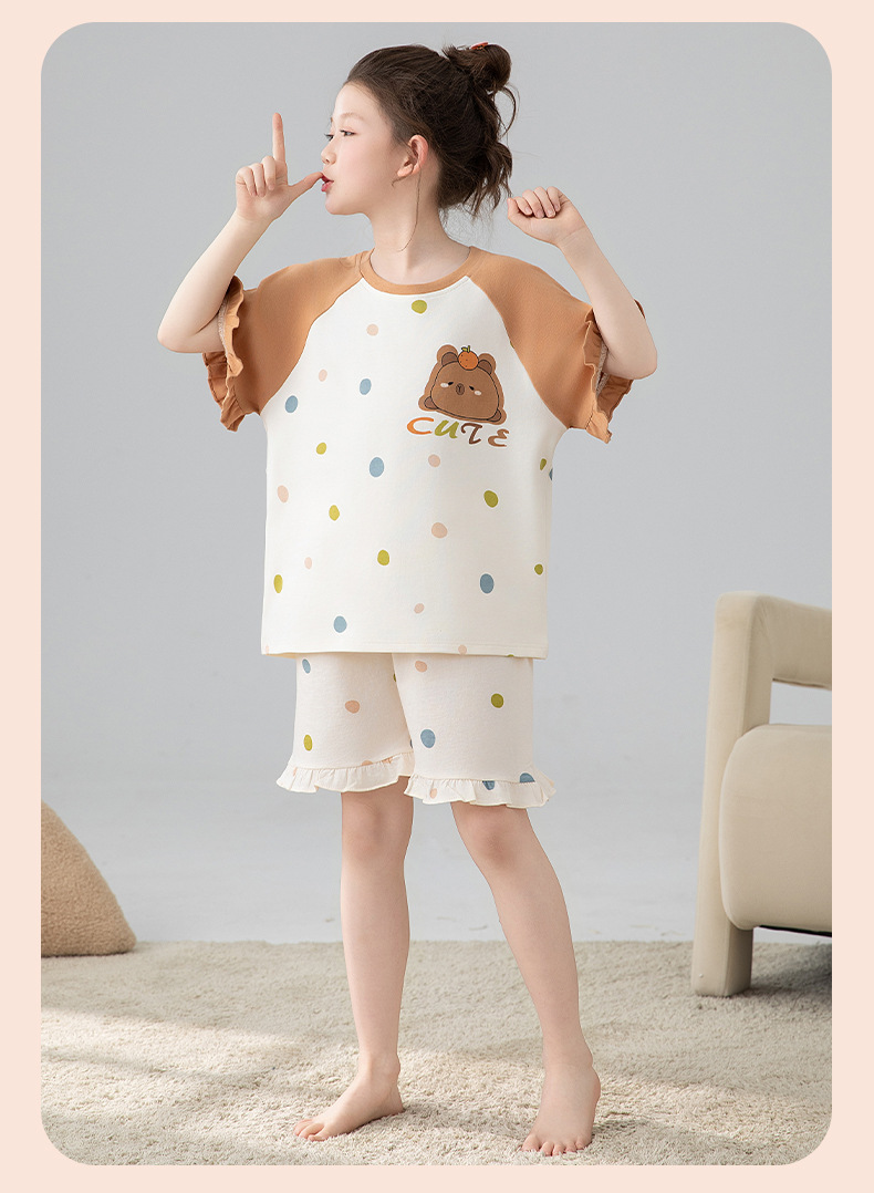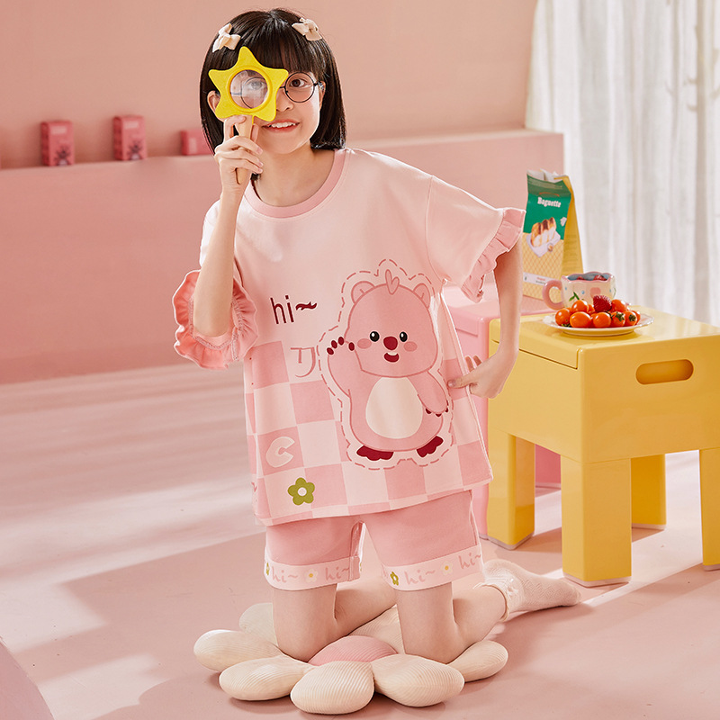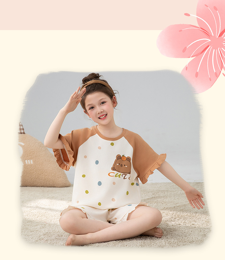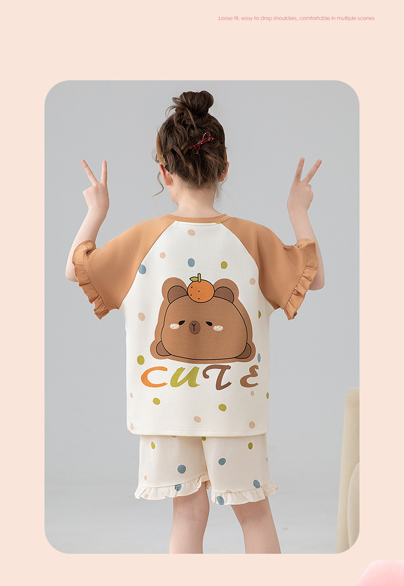 귀여운 Kapibara 순수 코튼 소녀 잠옷 여성 여름 풀오버 반팔 반바지 만화 중형 및 대형 아동복 세트
