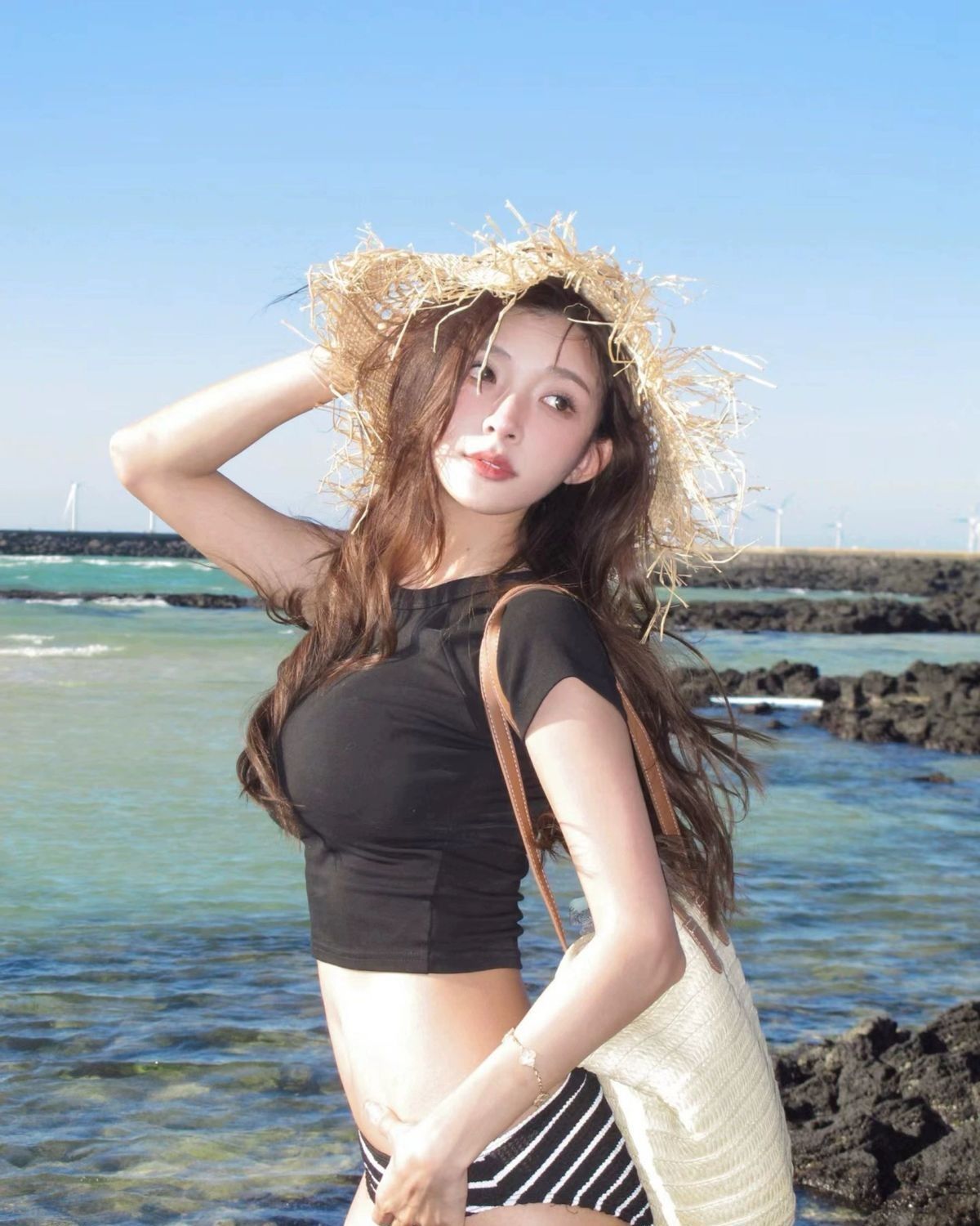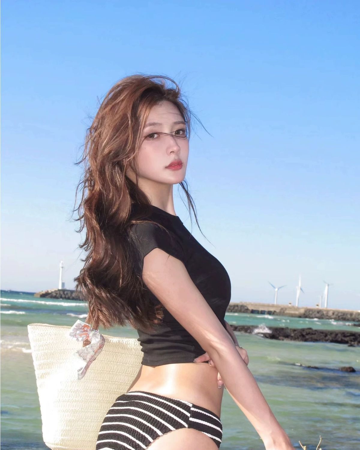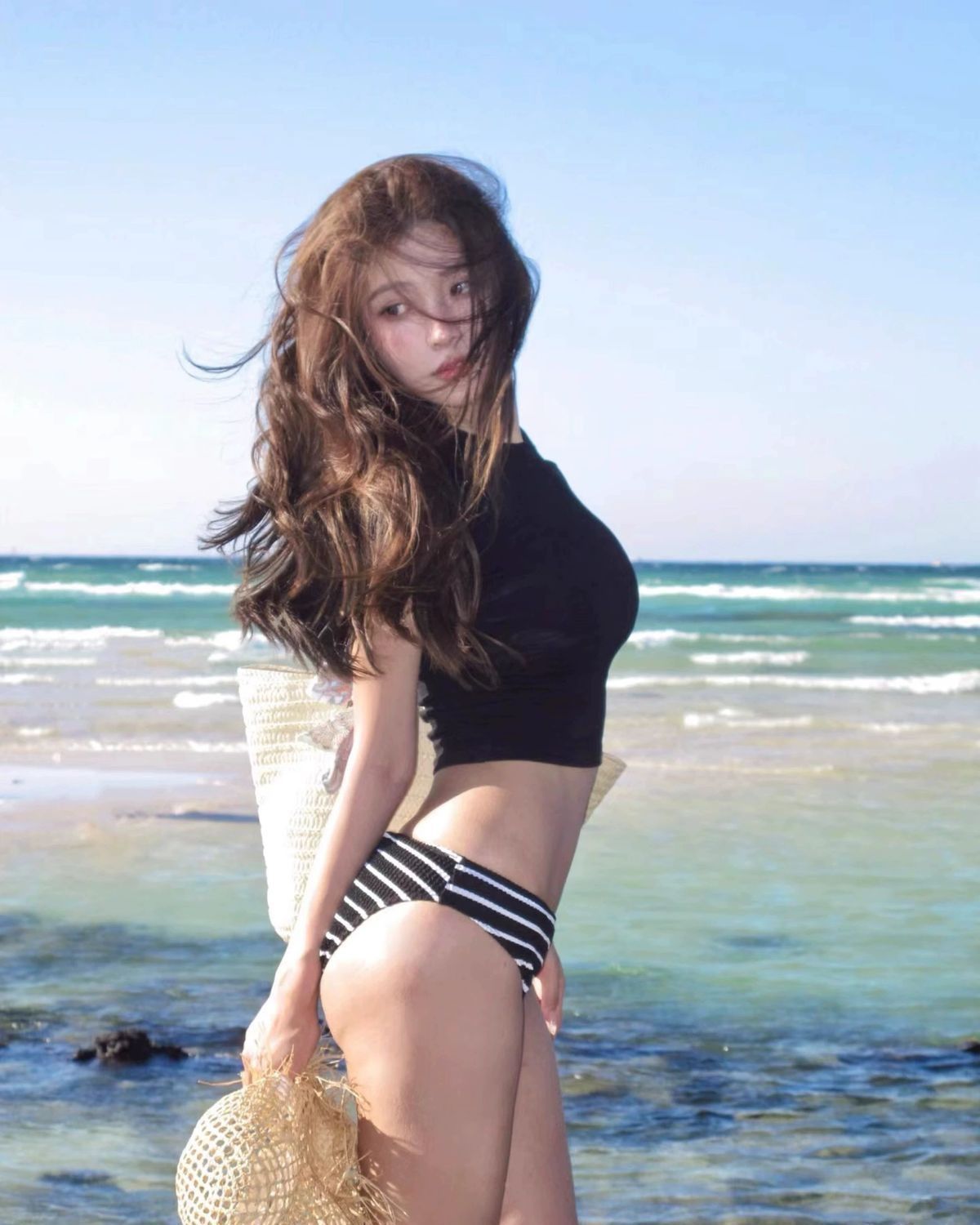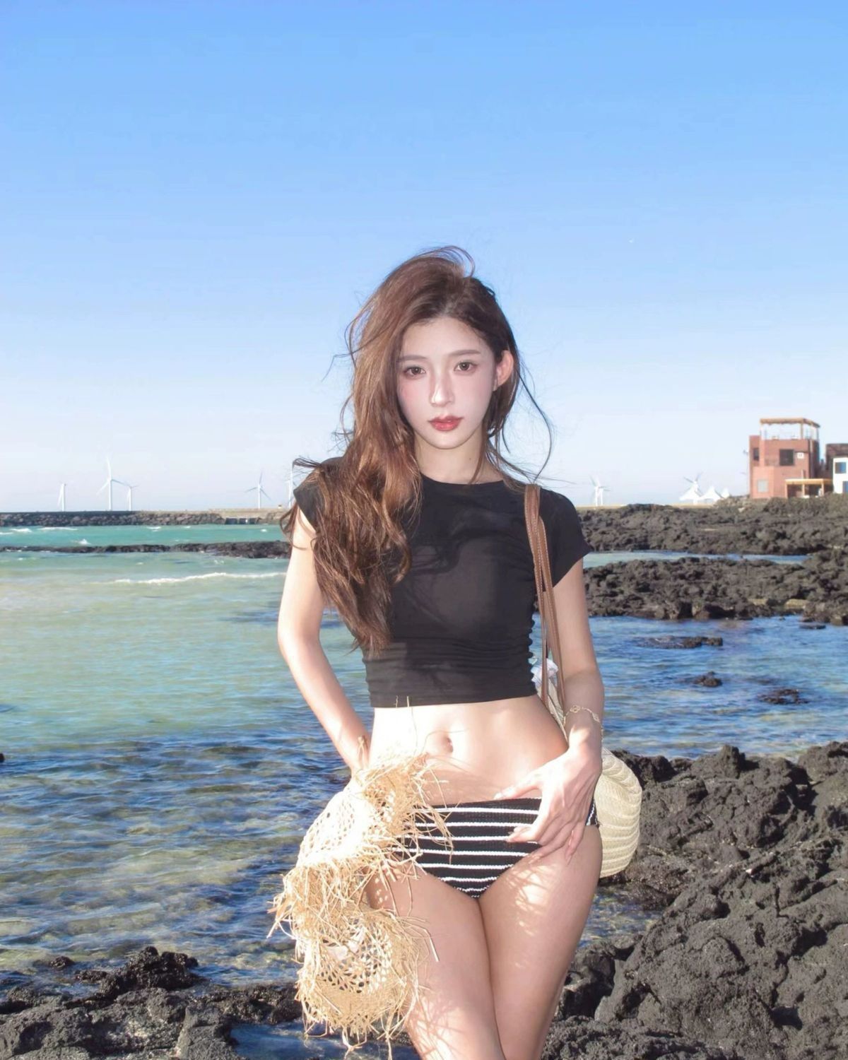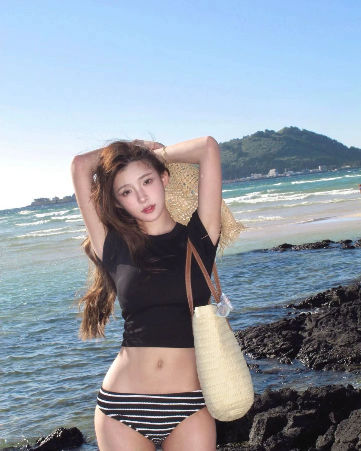 • 흑백 줄무늬 비키니 + 검정색 반소매