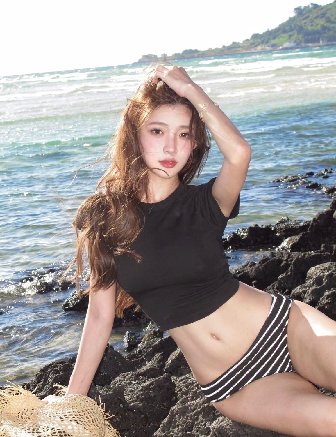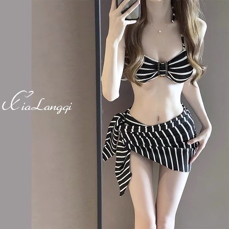 핫걸 블랙 반팔 스트라이프 스플릿 비키니 3피스 세트 섹시 슬리밍 바디 커버 해변 온천 리조트 수영복 여성용스토어 가기