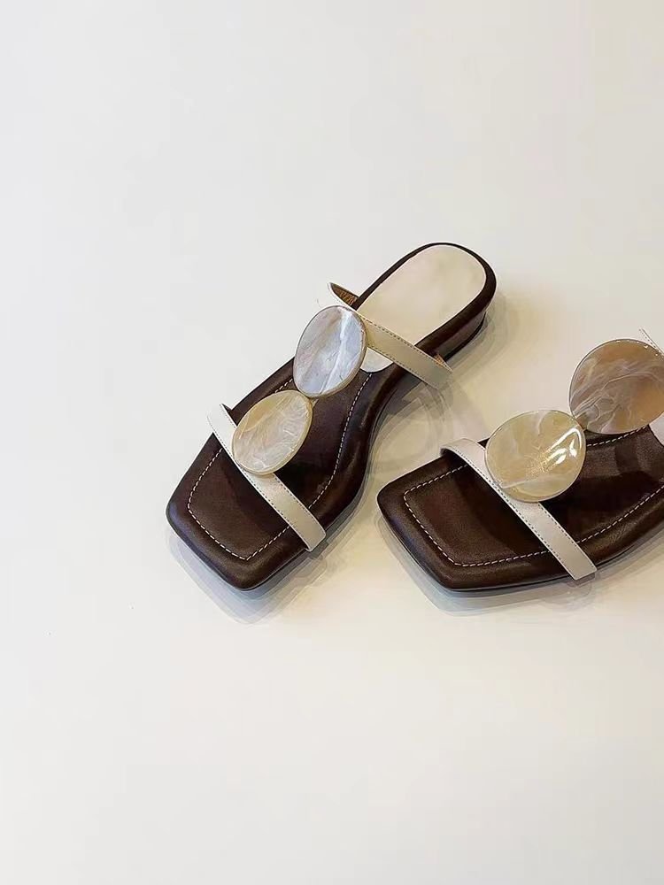 부드러운 가죽 버전 ~ 여성용 니치 프렌치 슬리퍼, 오픈 토우 스퀘어 토 로마 슈즈, 플랫 비치 슈즈