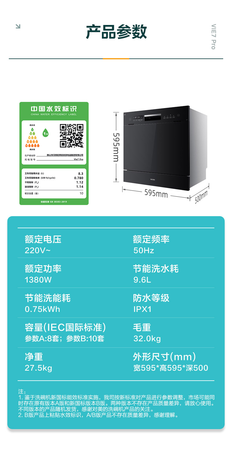 Hualing 식기 세척기 Vie7Pro 완전 자동 가정용 소형 데스크탑 임베디드 소독 및 살균 대용량 10 세트