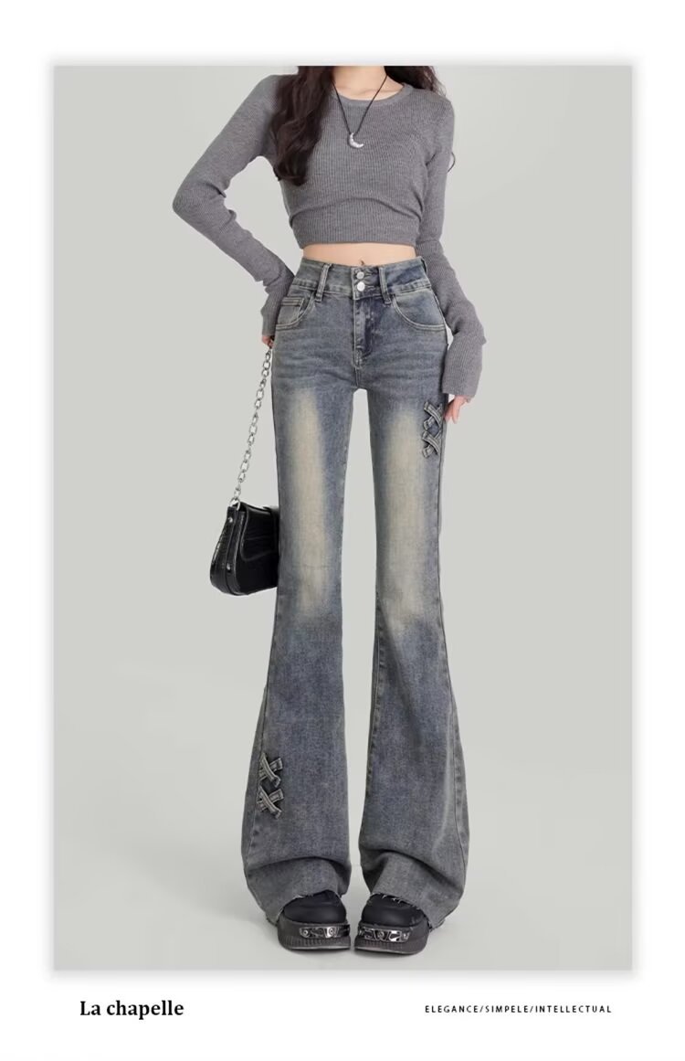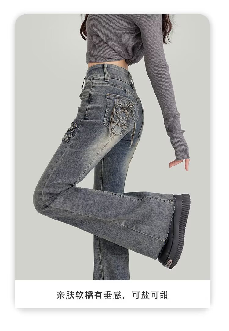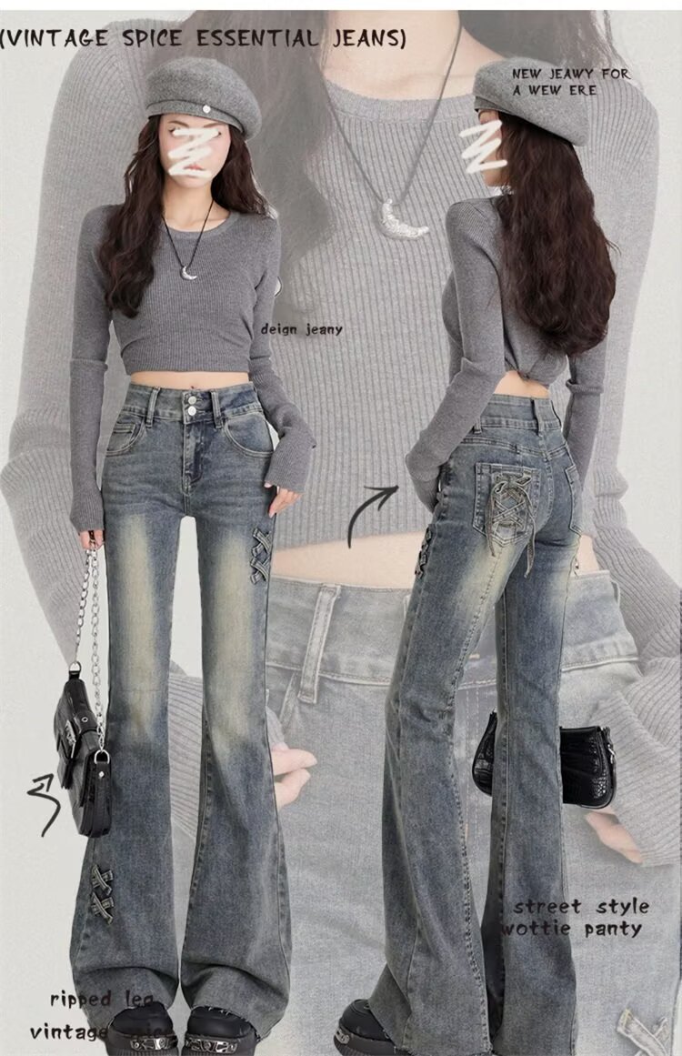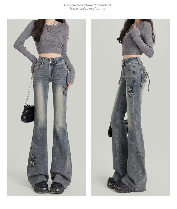 [스토어 핫셀링] 레트로 블루 더블 버튼 하이웨이스트 마이크로 플레어 청바지 여성 2025 봄 가을 신상 스트레치 보우스토어 가기