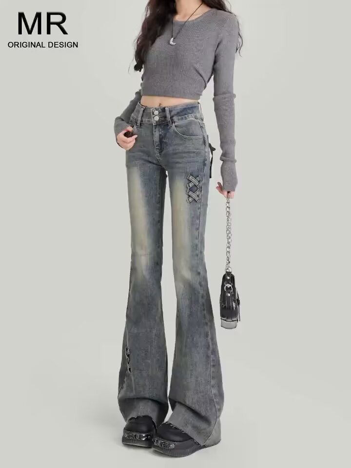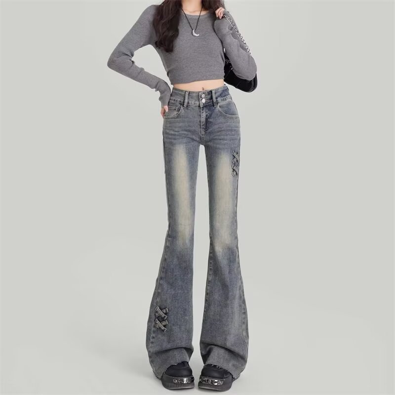 [스토어 핫셀링] 레트로 블루 더블 버튼 하이웨이스트 마이크로 플레어 청바지 여성 2025 봄 가을 신상 스트레치 보우