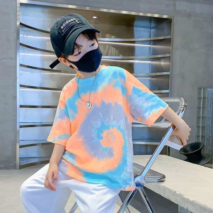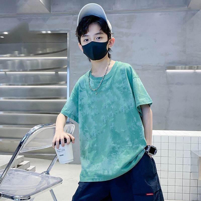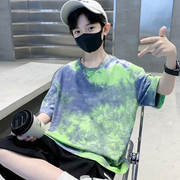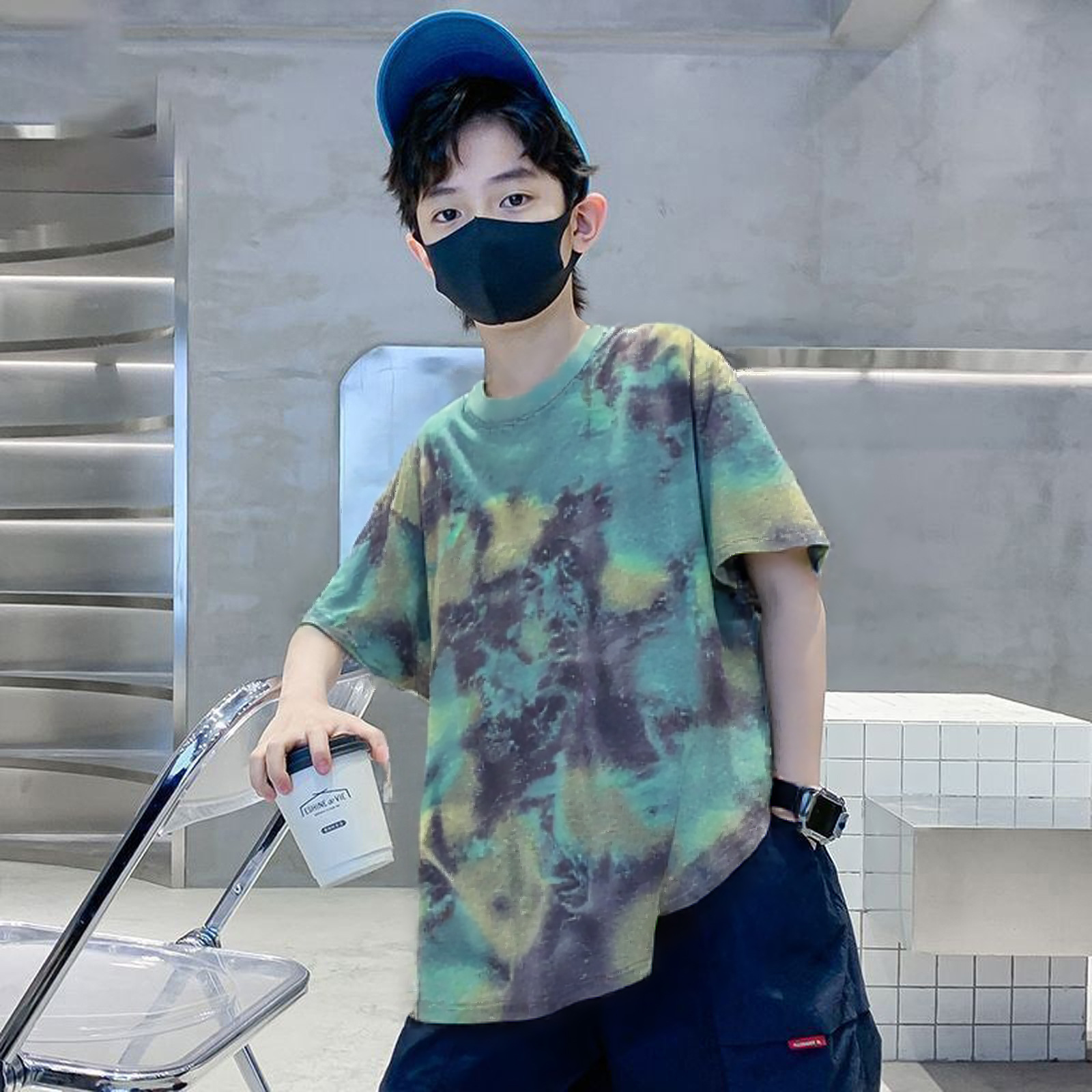 소년 반팔 티셔츠 여름 2025 새로운 스타일 소년 잘 생기고 세련된 순수 코튼 여름 타이 염색 어린이 유행 멋진 탑 T스토어 가기
