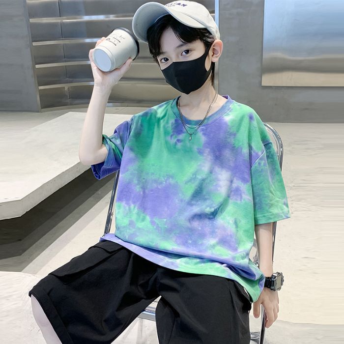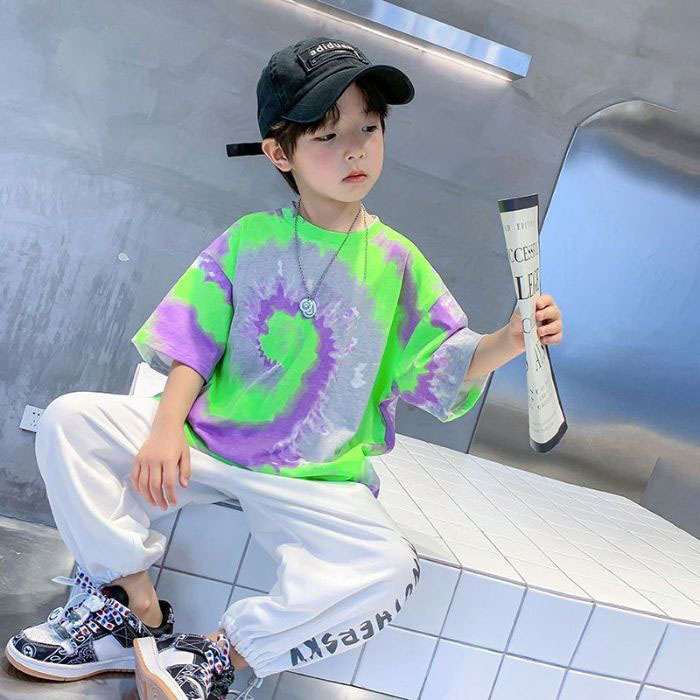 소년 반팔 티셔츠 여름 2025 새로운 스타일 소년 잘 생기고 세련된 순수 코튼 여름 타이 염색 어린이 유행 멋진 탑 T