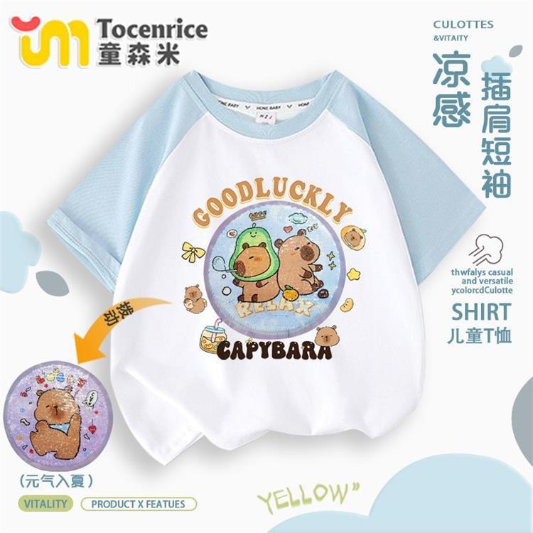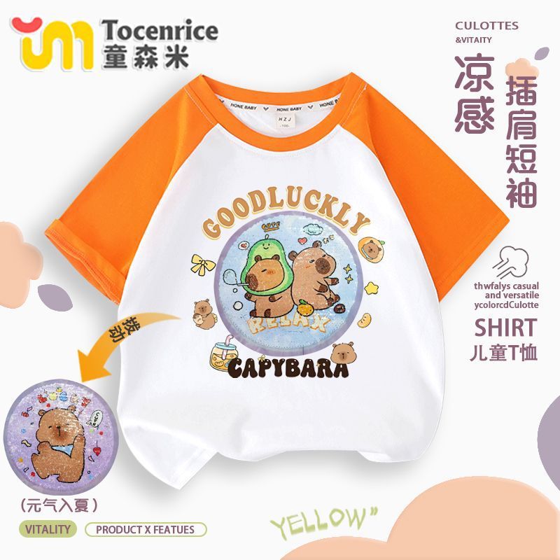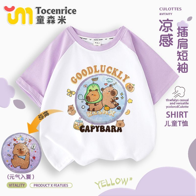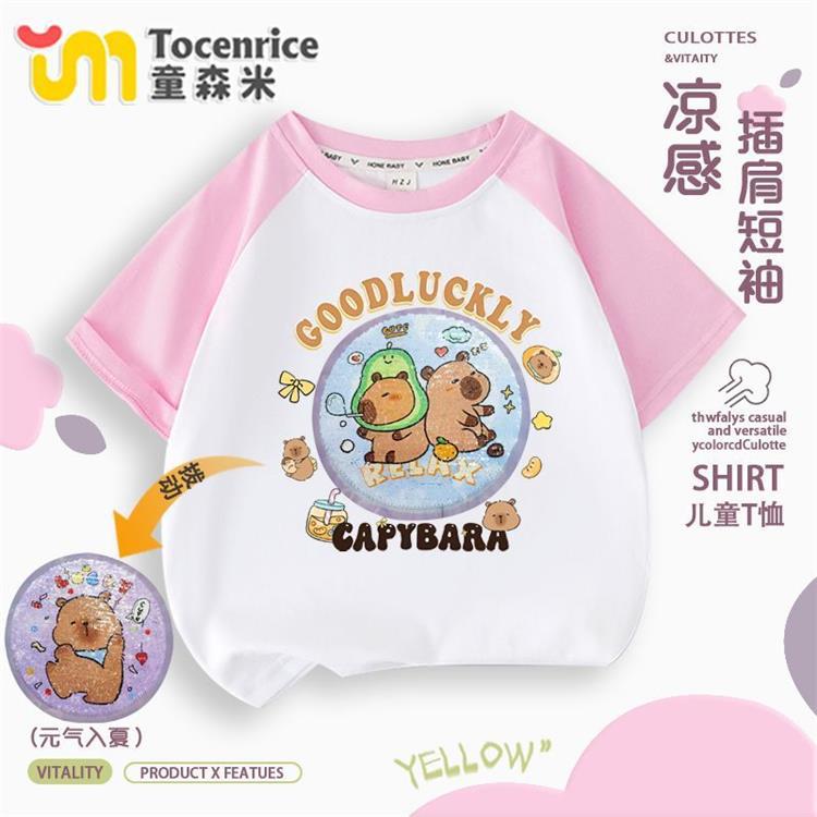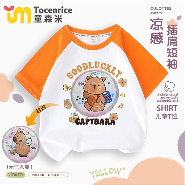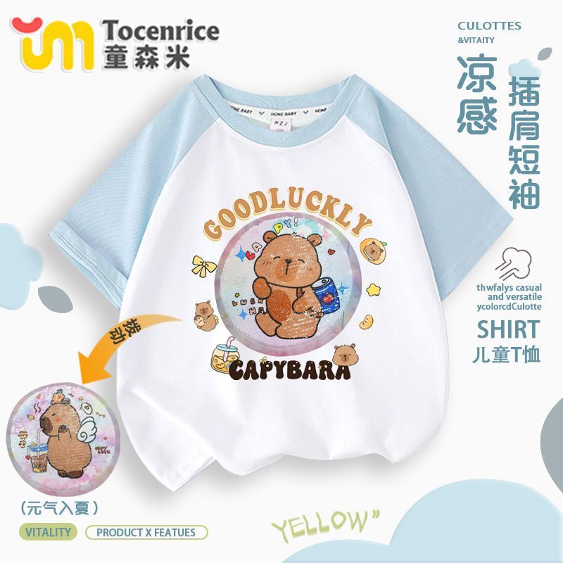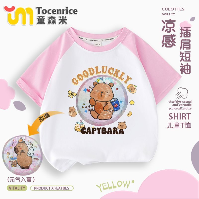 아기 소녀 여름 새로운 Kapibara 색상 변경 스팽글 반팔 셔츠 소녀 귀여운 얼굴 변경 바닥 셔츠 라글란 T스토어 가기