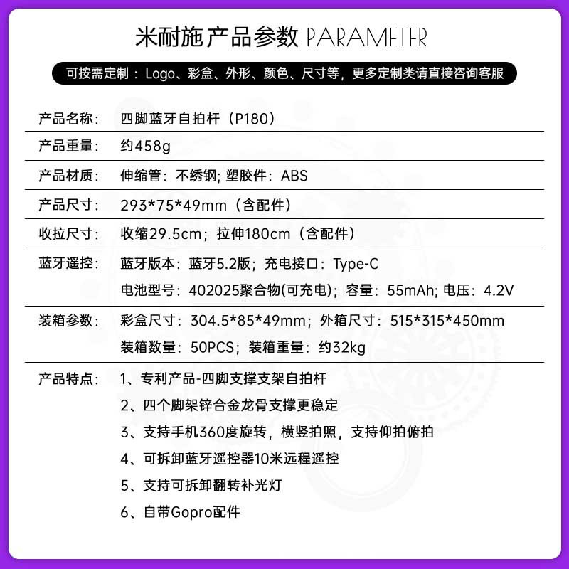 P185 P180 휴대 전화 셀카 스틱 1.8 m 휴대용 안정기 360 회전 사진 바닥 쿼드 포드