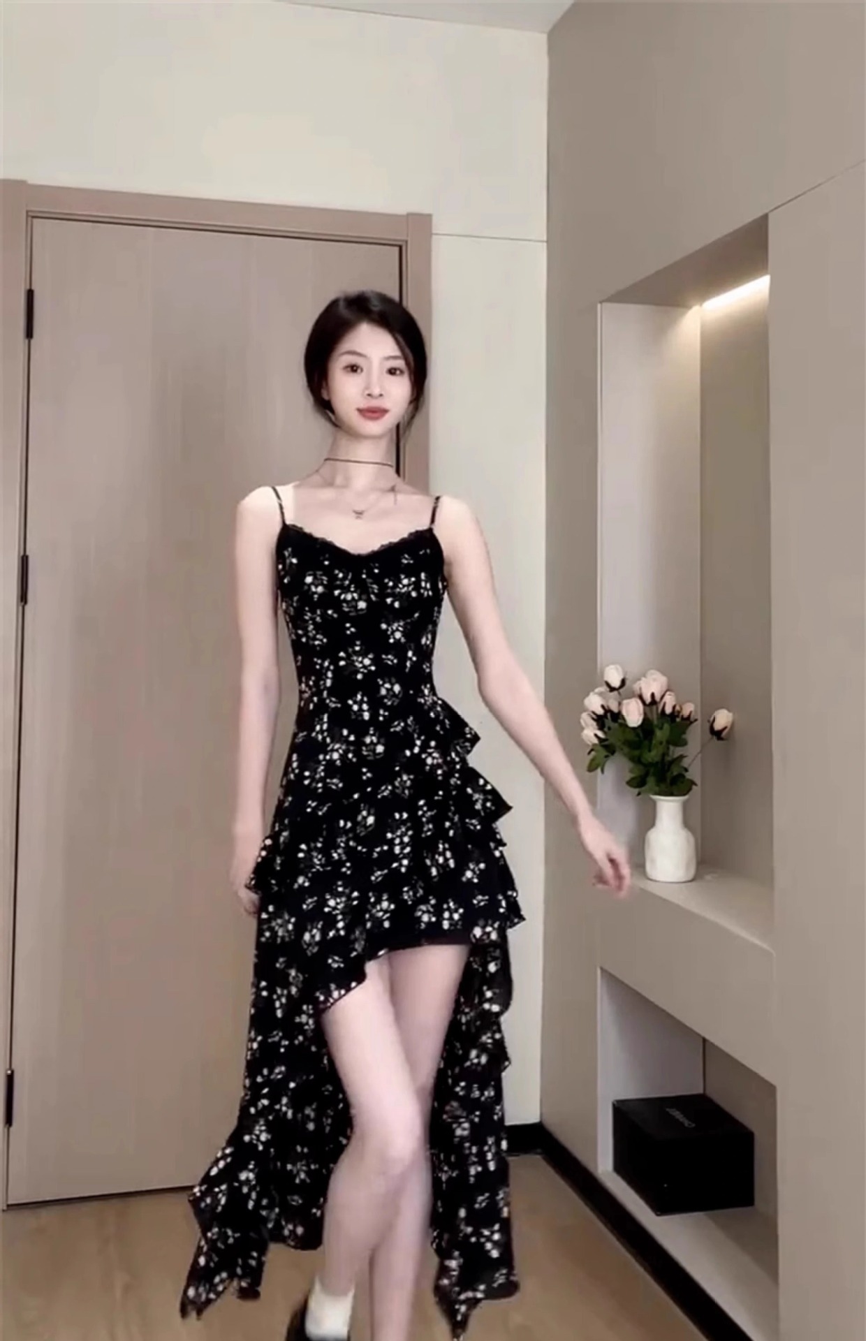 여름 2025 여성을 위한 우아한 검은 꽃무늬 서스펜더 드레스 초여름 착용을 위한 새로운 해변 휴가 스타일 롱 드레스스토어 가기
