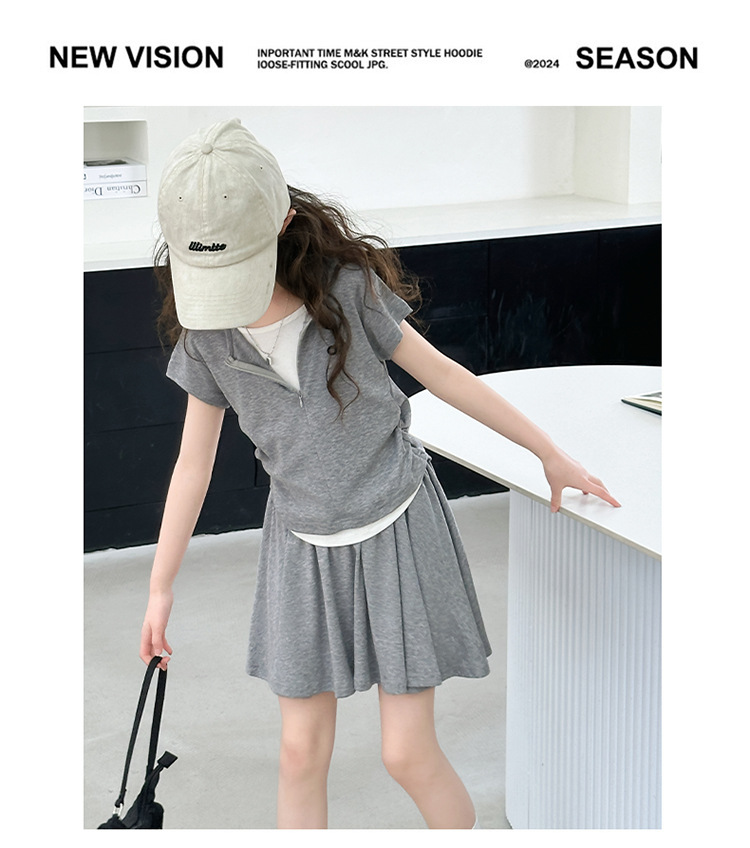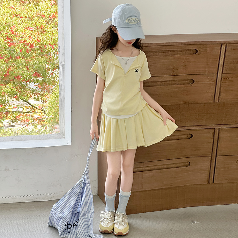 여자 한국 캐주얼 스커트 2025 여름 새로운 큰 어린이 가짜 투피스 반팔 티셔츠 주름 스커트 투피스 세트
