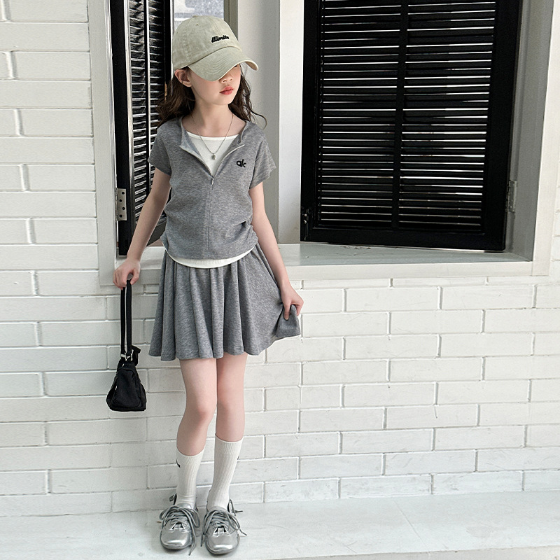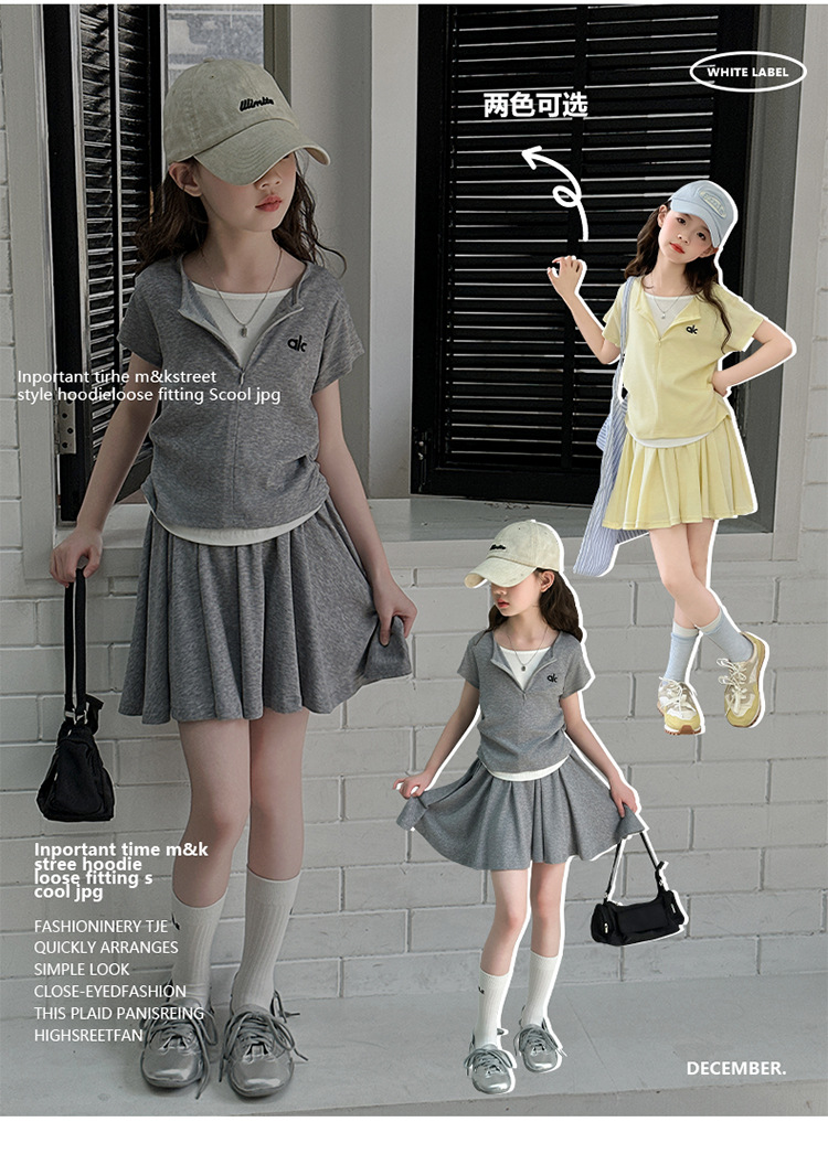 여자 한국 캐주얼 스커트 2025 여름 새로운 큰 어린이 가짜 투피스 반팔 티셔츠 주름 스커트 투피스 세트스토어 가기