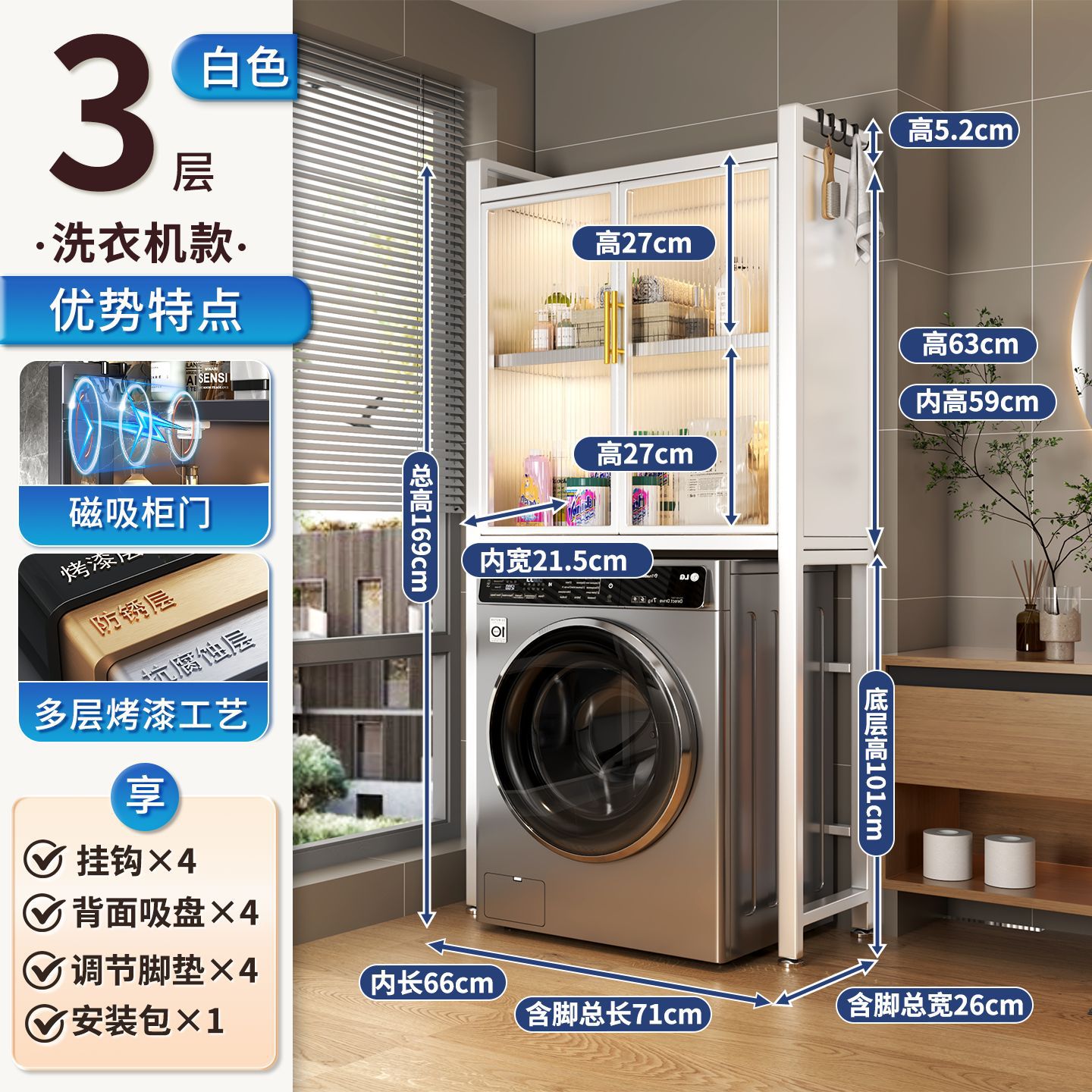 • 3단 세탁기장 [양문형, 높이 조절 가능] Haoyue 화이트 길이 71cm