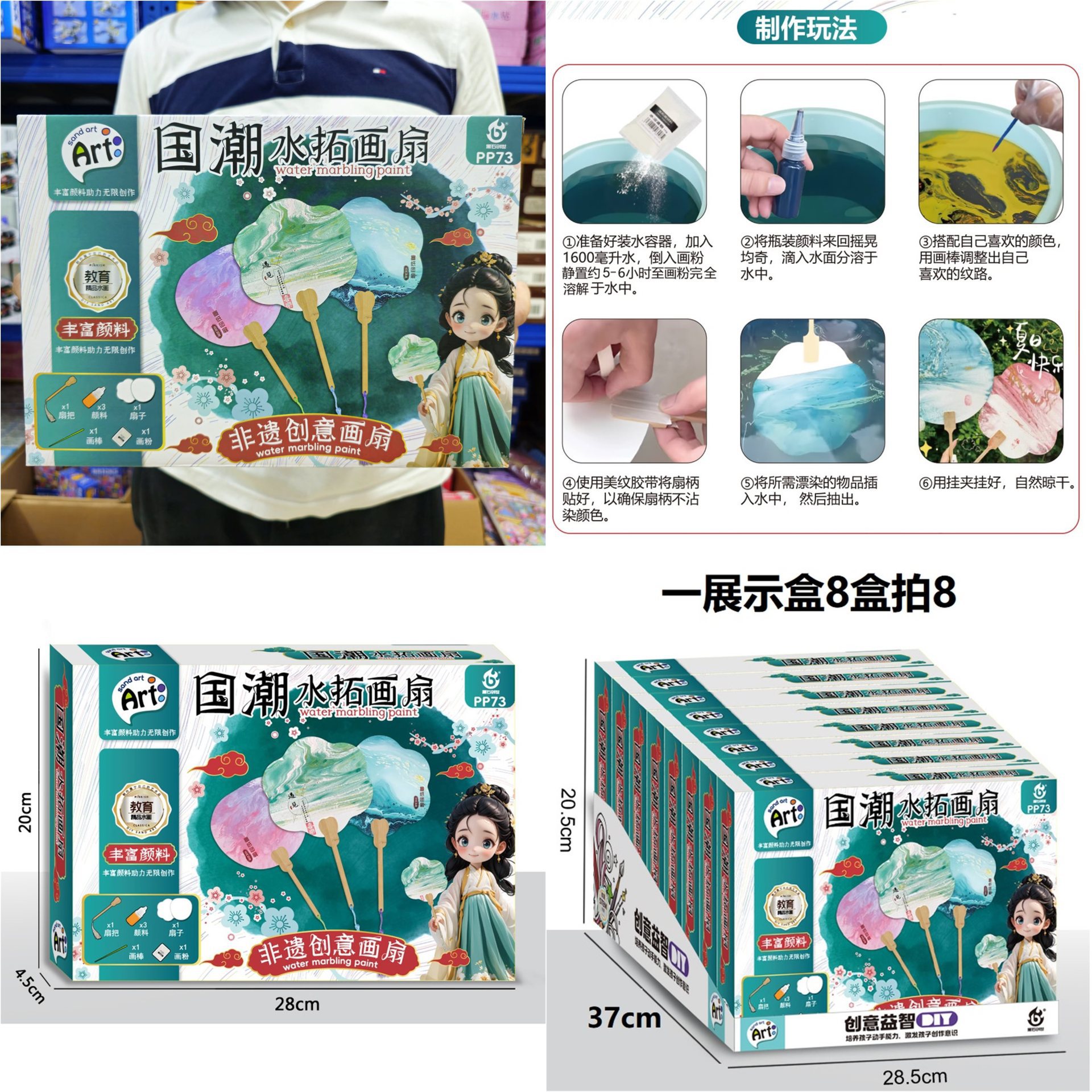 • 국산 조수 페인트 부채 세트, 부채 1개, 3색 물감 [1개 디스플레이 상자, 8개]
