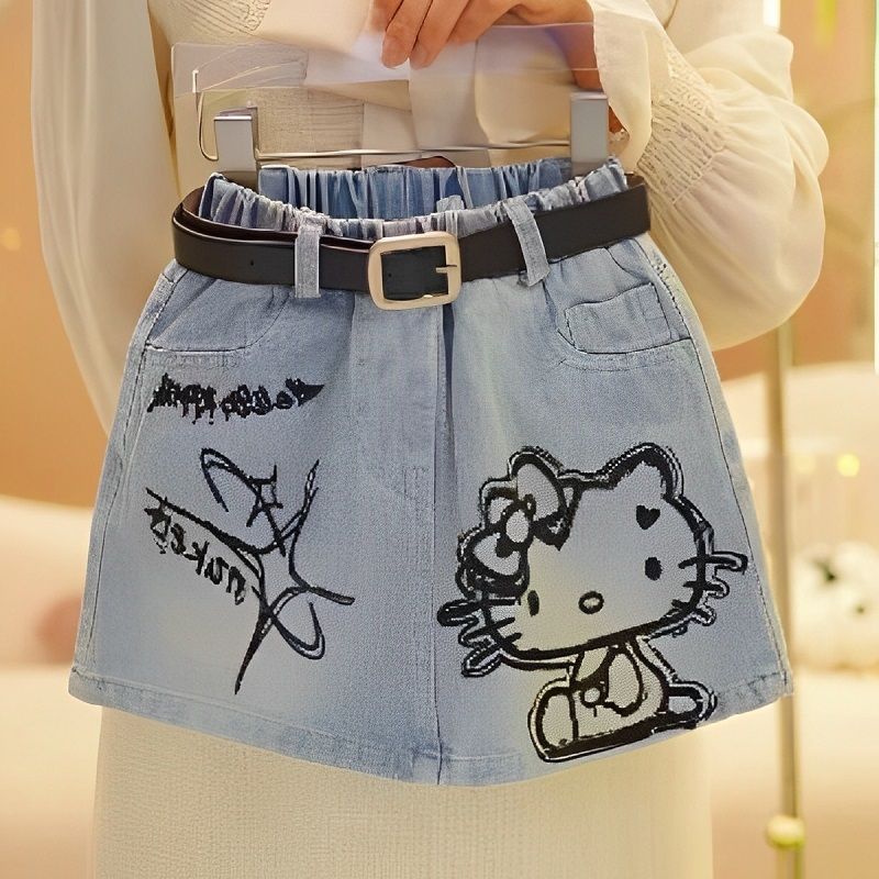 소녀 인쇄 데님 치마 2025 새로운 패션 KT 고양이 한국식 중대형 어린이 소녀 큰 어린이 트렌드 데님 치마