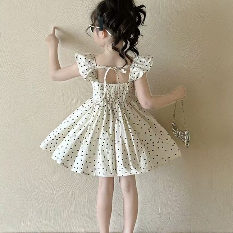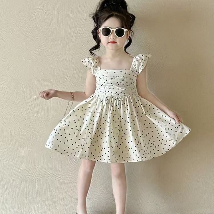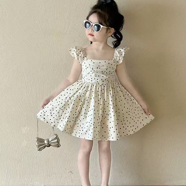 한국 스타일 여자 2025 새로운 여름 살구색 폴카 도트 작은 플라잉 슬리브 드레스 어린 소녀 허리와 큰 밑단 공주 드레스스토어 가기