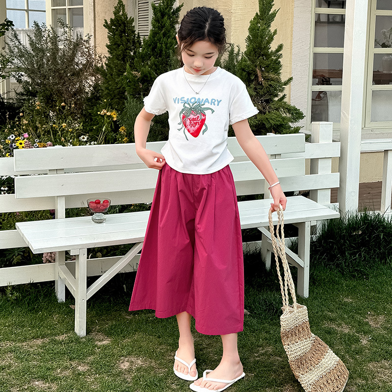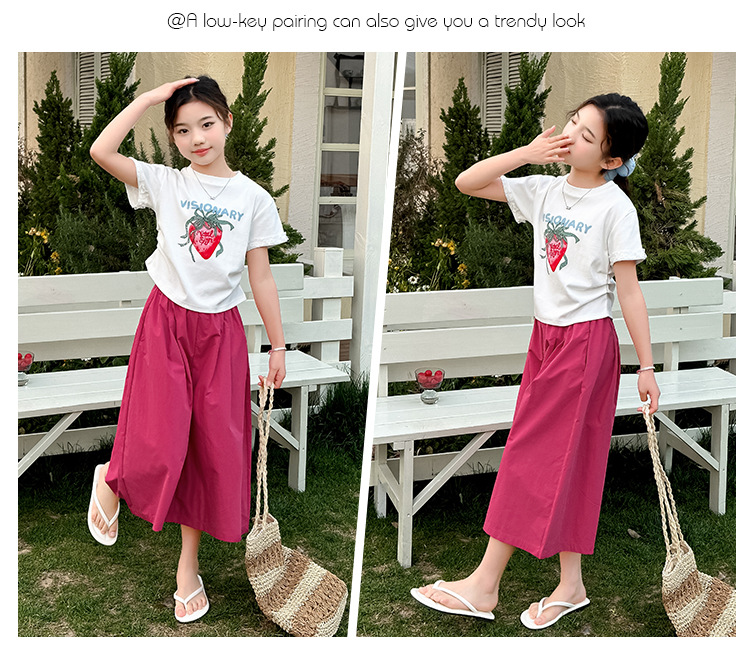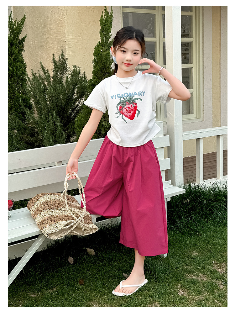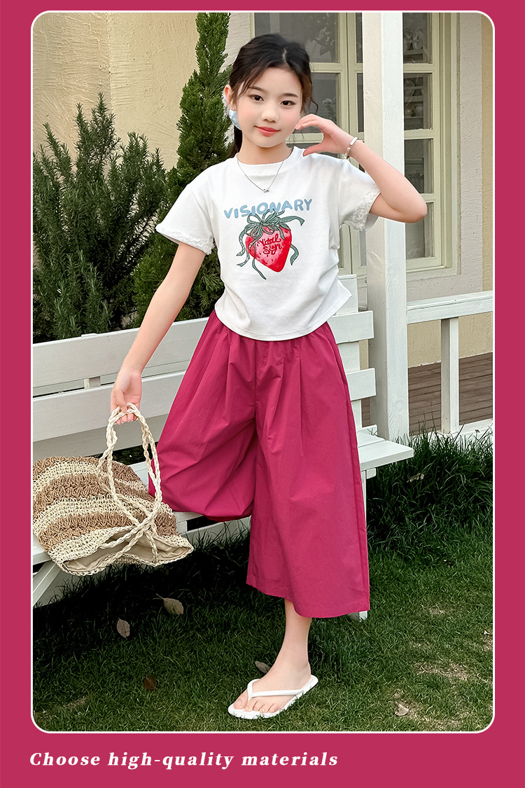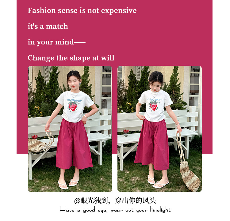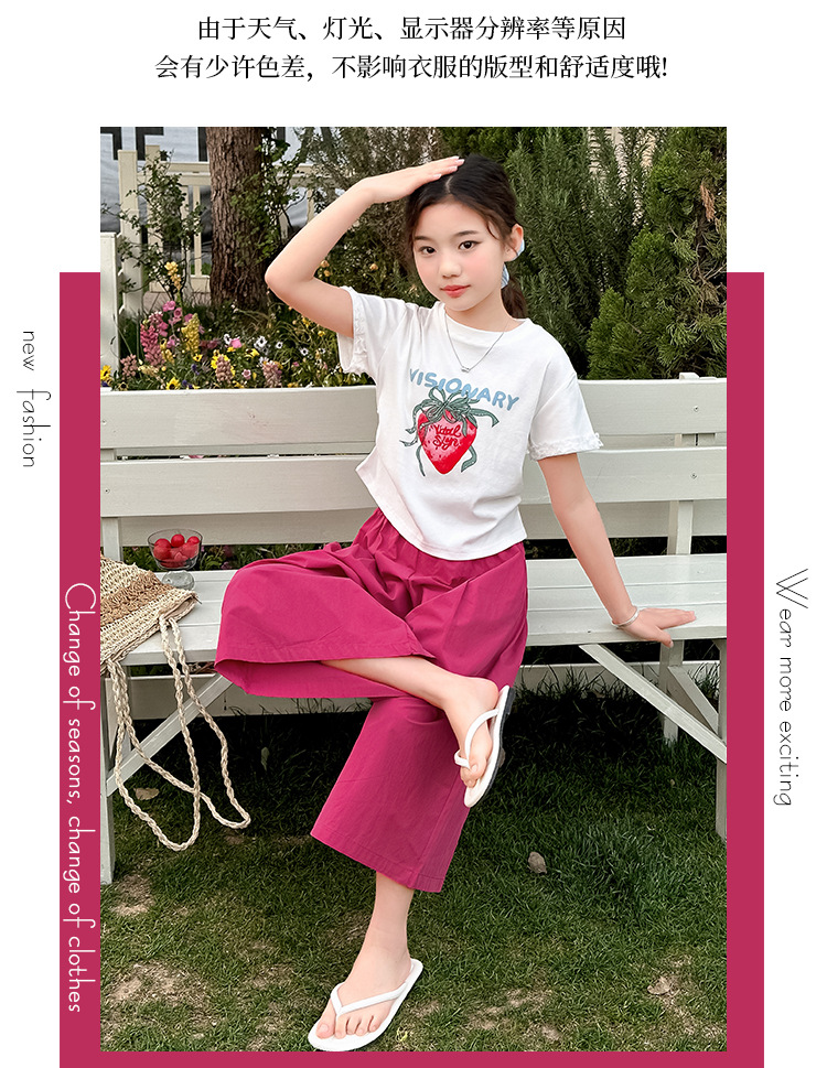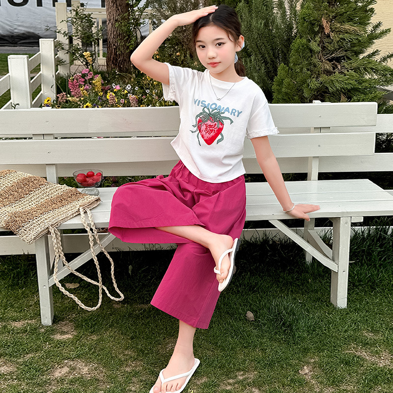 큰 어린이를 위한 여아 여름 반팔 양복, 패셔너블한 여아 여름 레이스 티셔츠, 7부 바지 투피스 세트스토어 가기