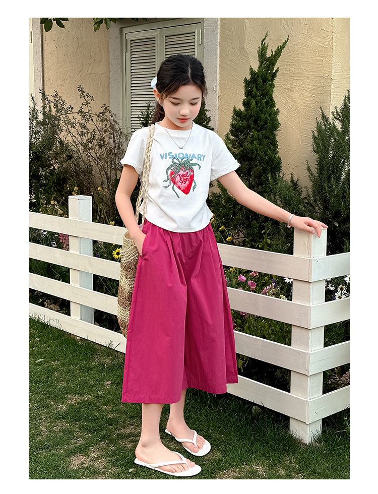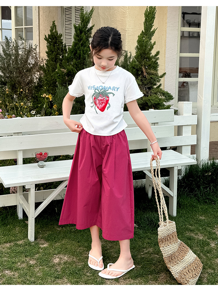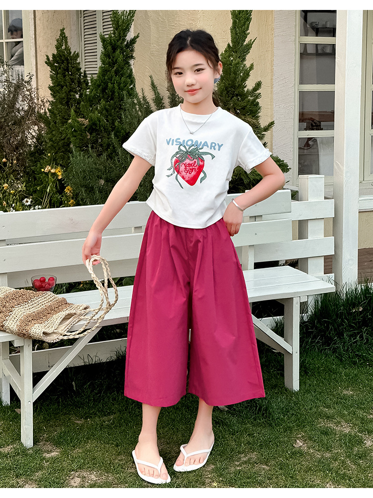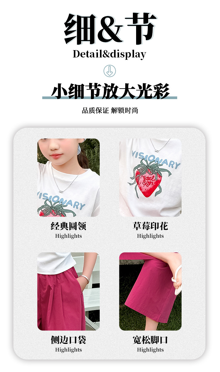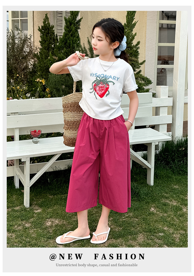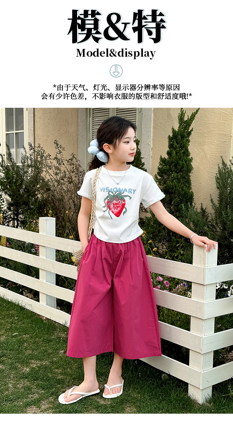 큰 어린이를 위한 여아 여름 반팔 양복, 패셔너블한 여아 여름 레이스 티셔츠, 7부 바지 투피스 세트스토어 가기