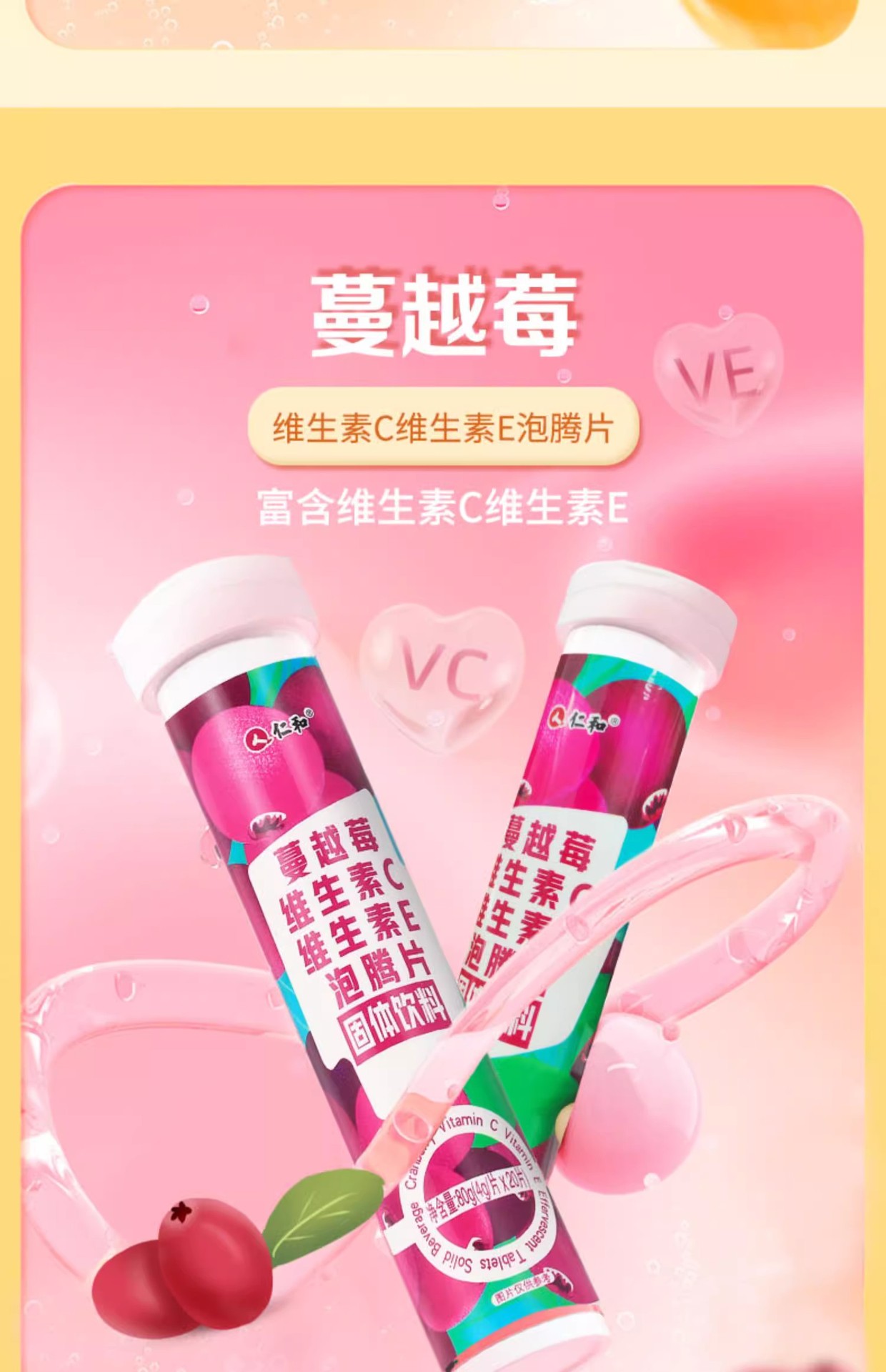 Renhe Acerola 스위트 오렌지 멀티 비타민 C 크랜베리 비타민 E 발포성 정제 80g 고체 음료
