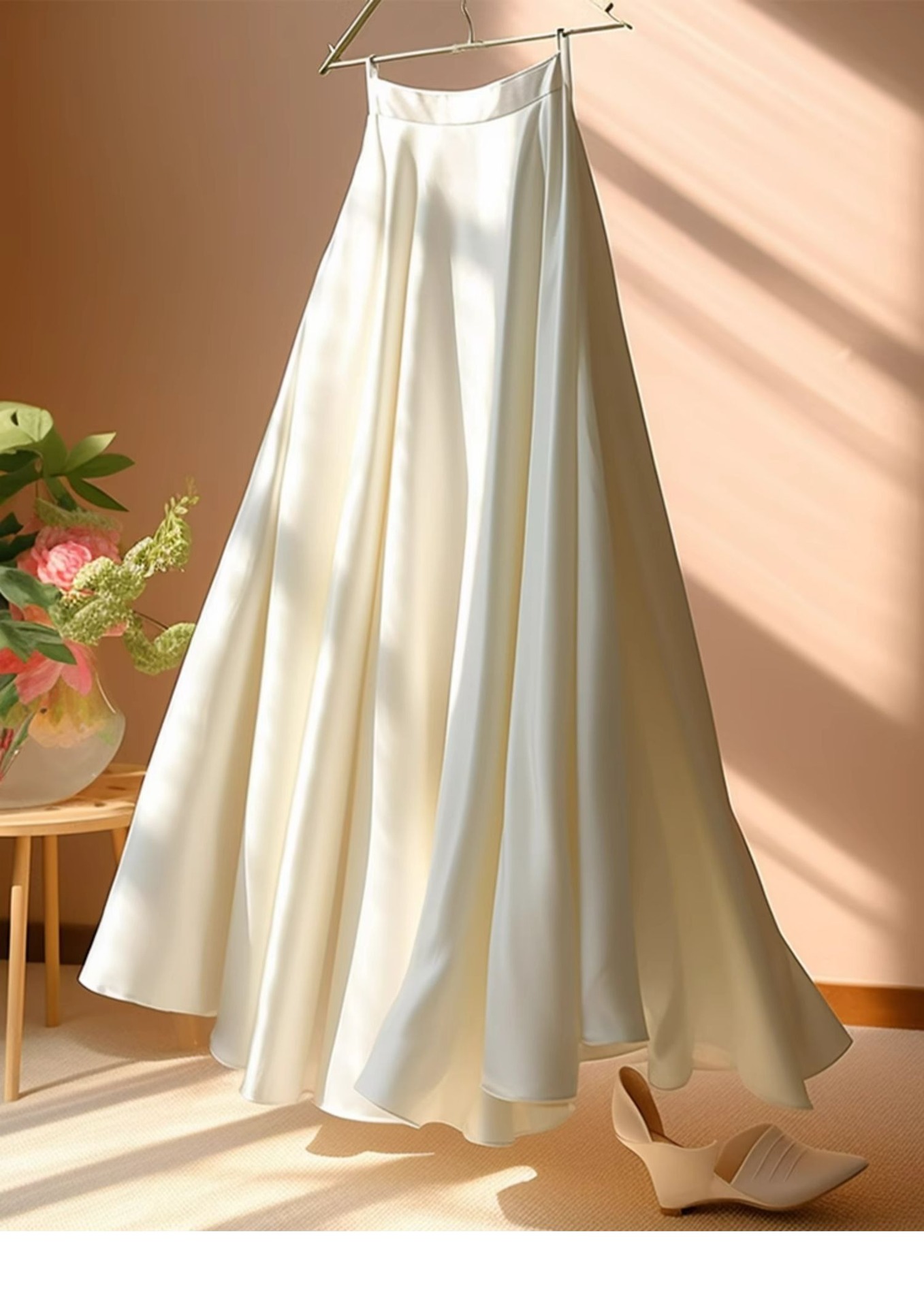 시원한 화이트 컬러의 하이웨이스트 슬리밍 A라인 우산 스커트, 여름 여성을 위한 가벼운 럭셔리 새틴 스커트스토어 가기