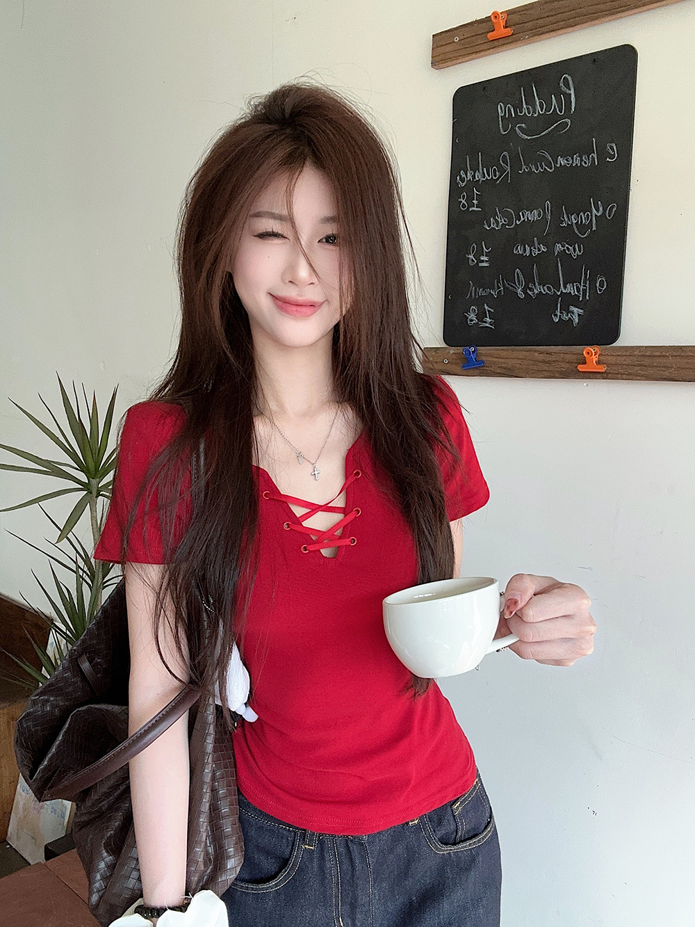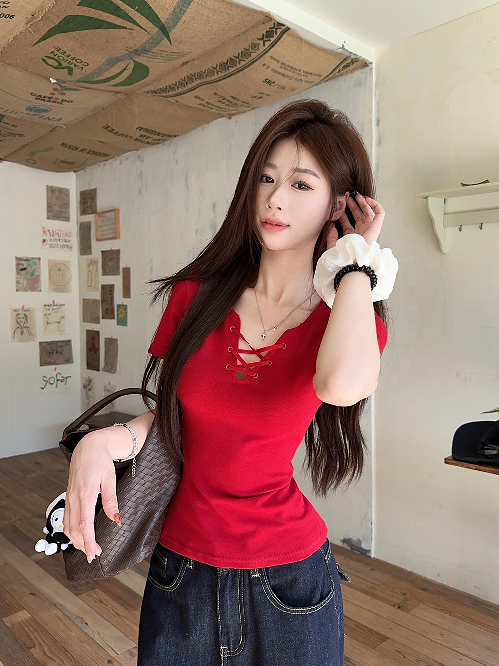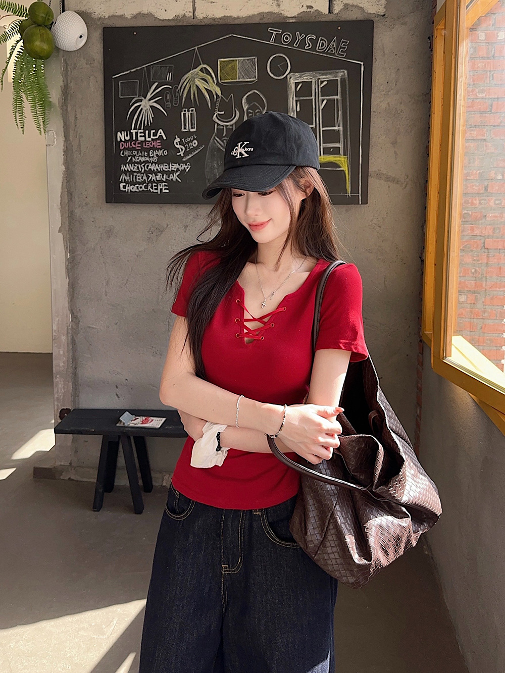 한국 캐주얼 달콤한 핫 소녀 반팔 레드 v 넥 스트랩 오른쪽 어깨 티셔츠 여성 여름 슬리밍 짧은 탑스토어 가기