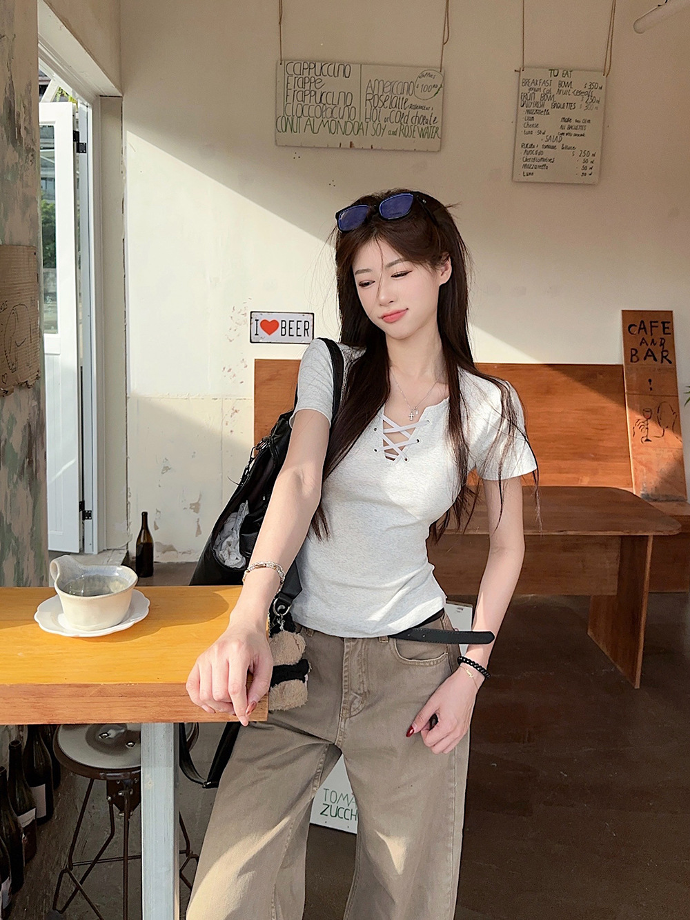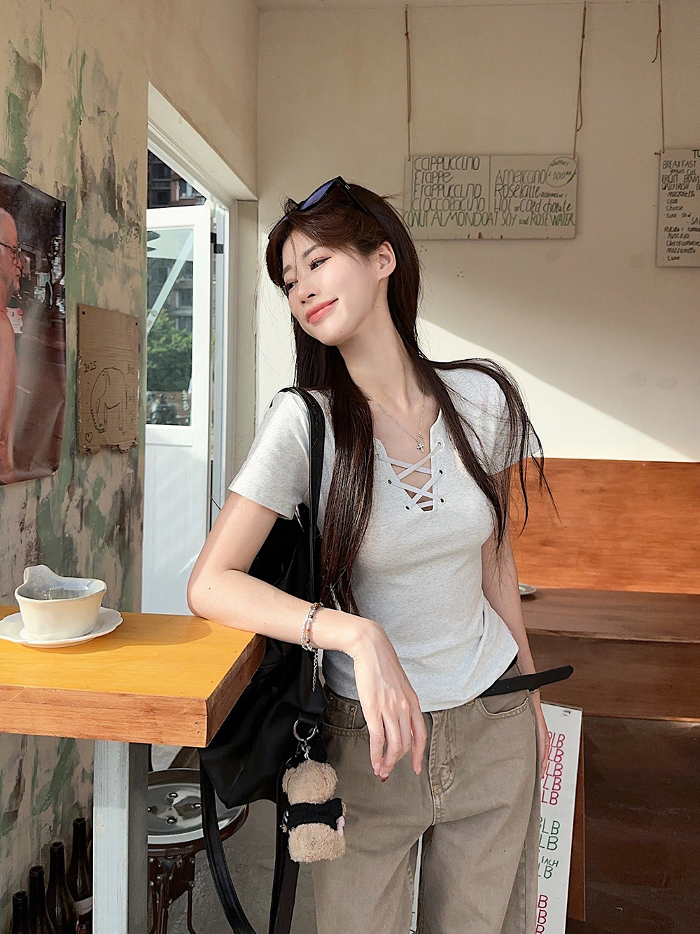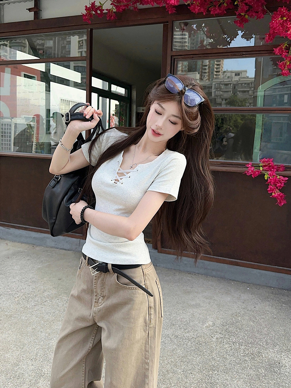 한국 캐주얼 달콤한 핫 소녀 반팔 레드 v 넥 스트랩 오른쪽 어깨 티셔츠 여성 여름 슬리밍 짧은 탑스토어 가기