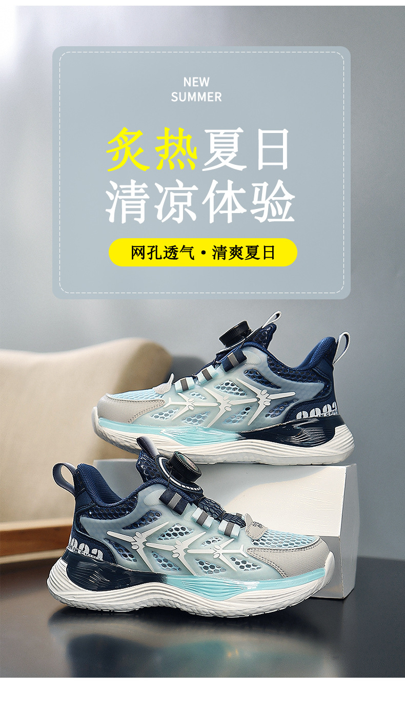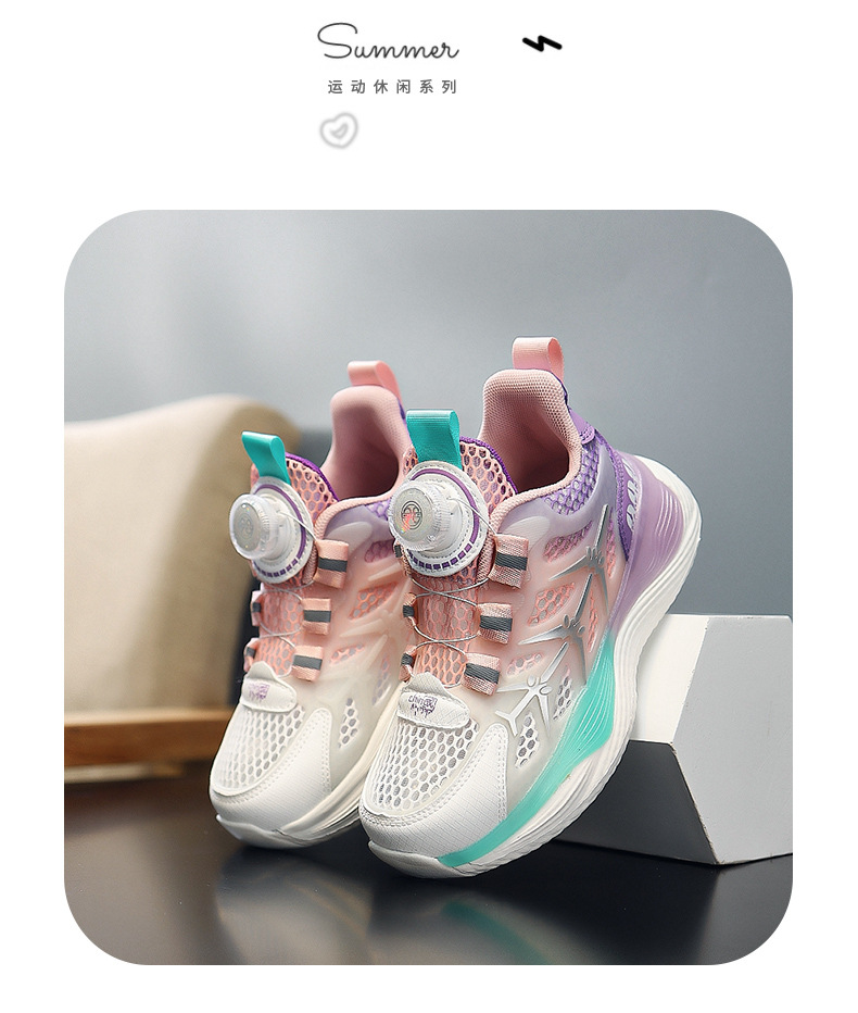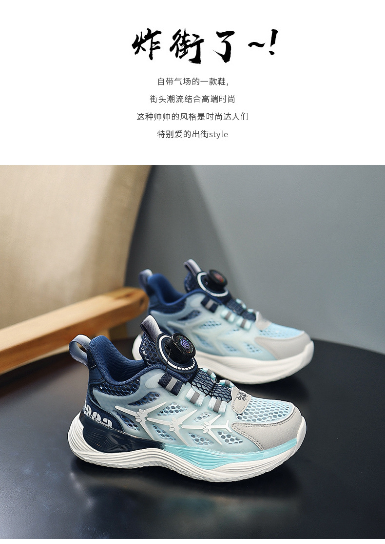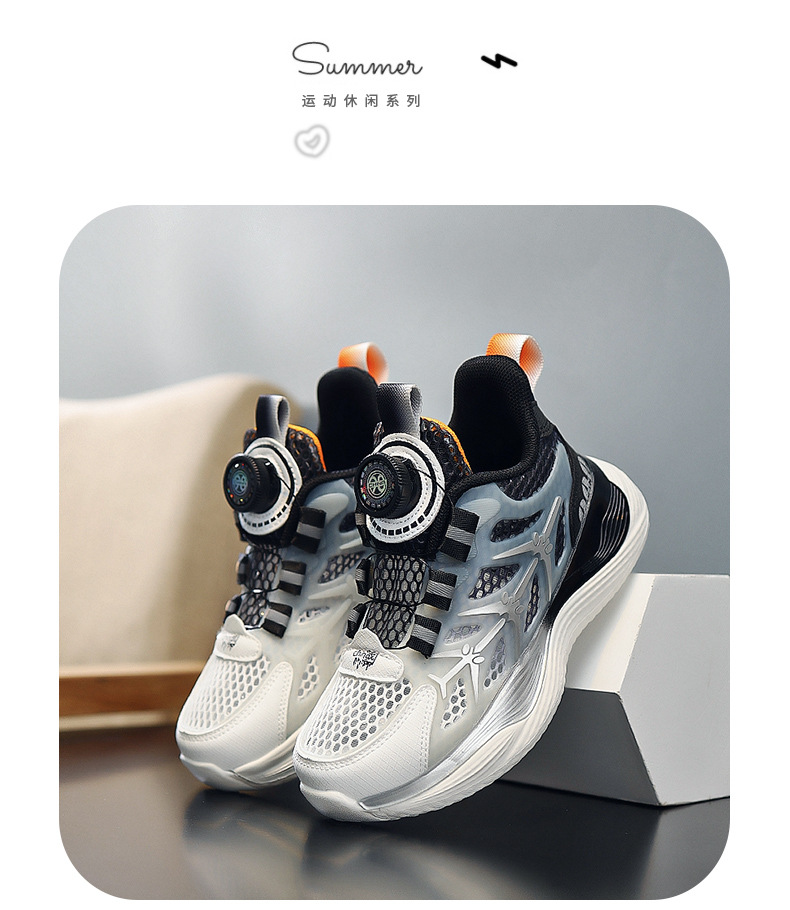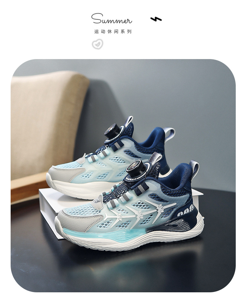 소년 신발 여름 메쉬 통기성 2025 새로운 어린이 스포츠 단일 메쉬 신발 큰 어린이를위한 부드러운 바닥 회전 버튼