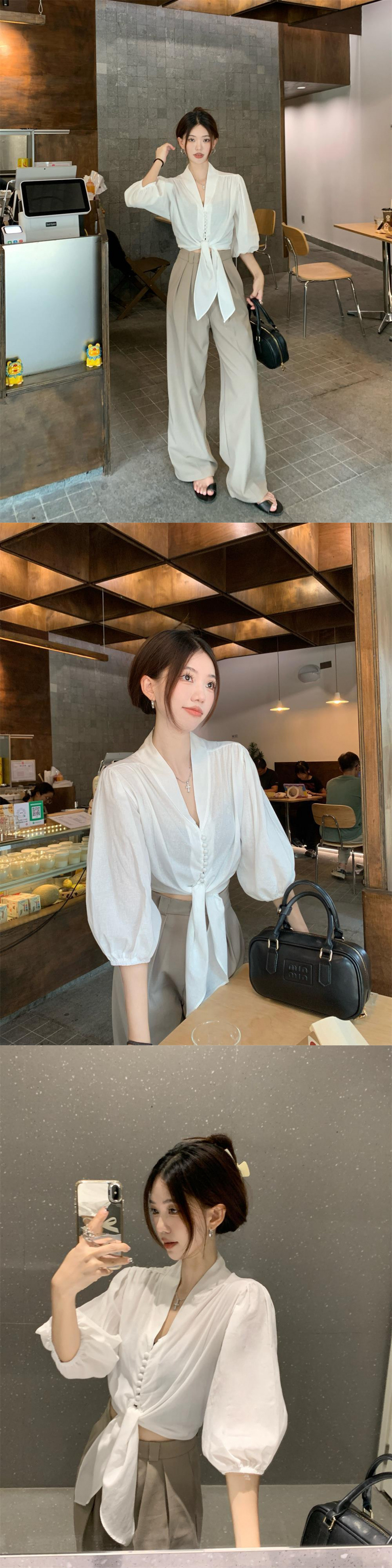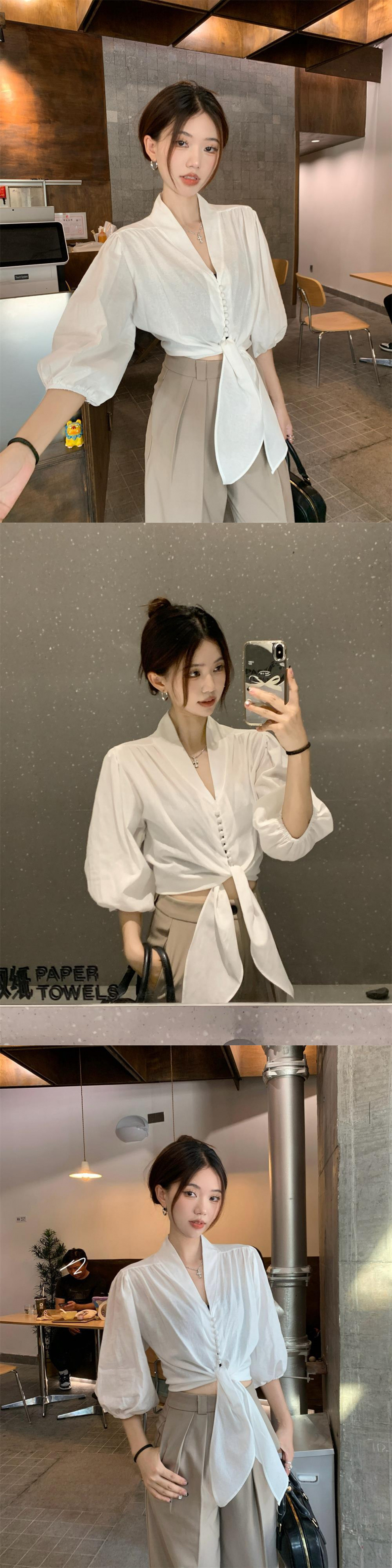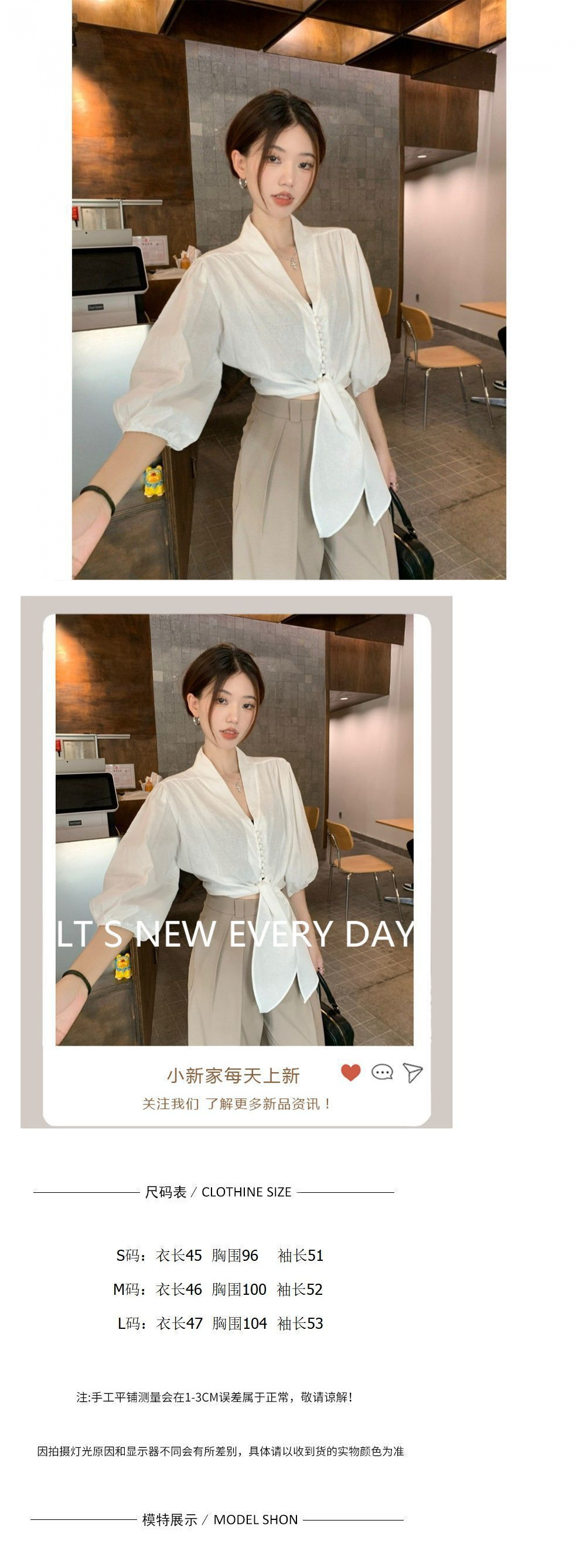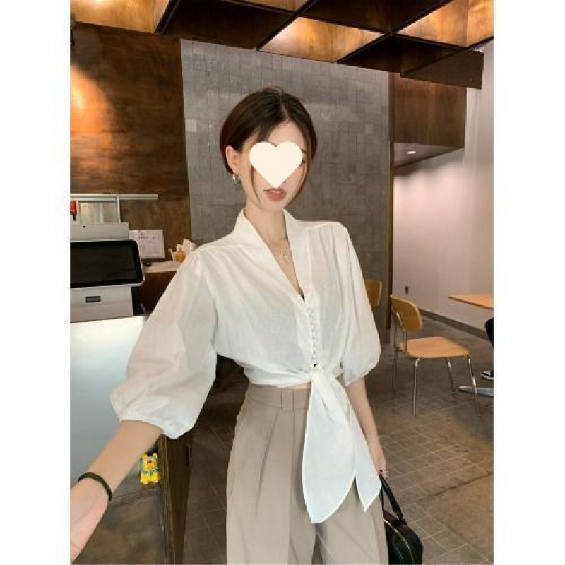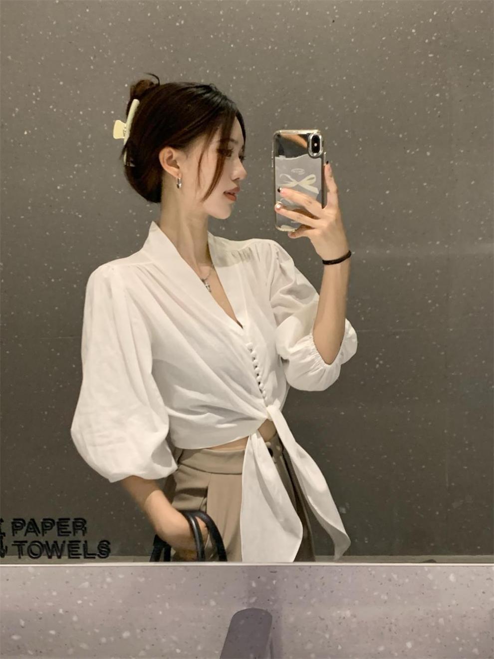 2025년 가을 여성용 프렌치 브이넥 스트랩 화이트 셔츠 새로운 스타일의 허리 슬리밍 셔츠 하이 엔드 쇼트 탑스토어 가기