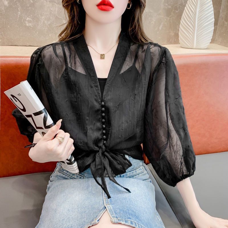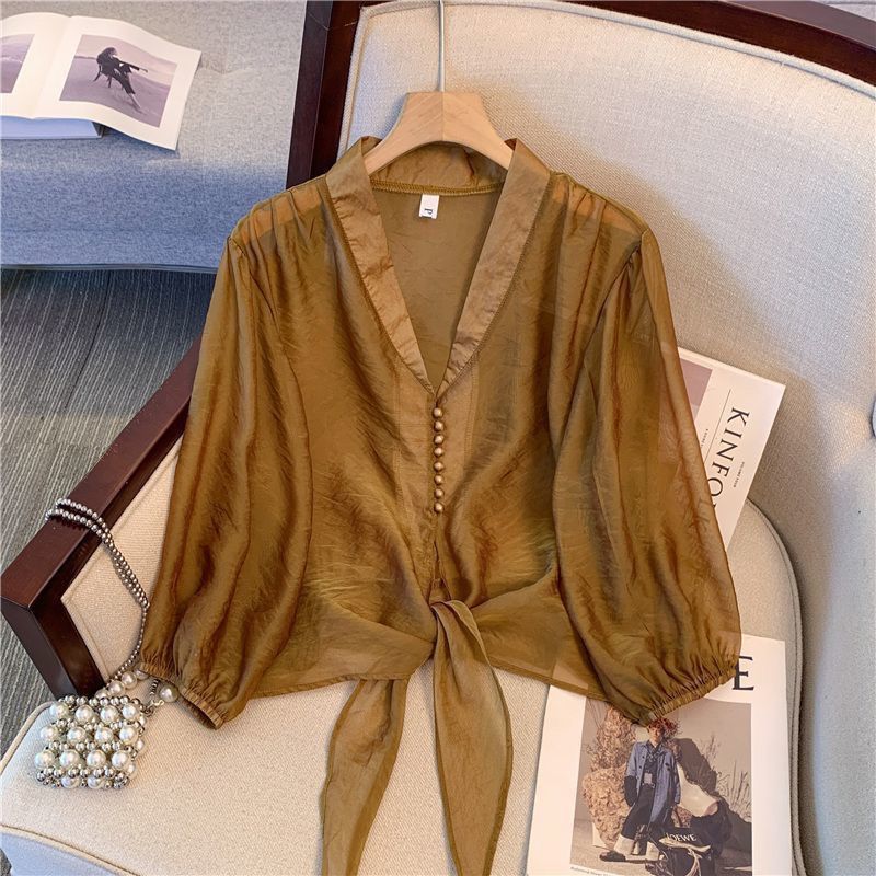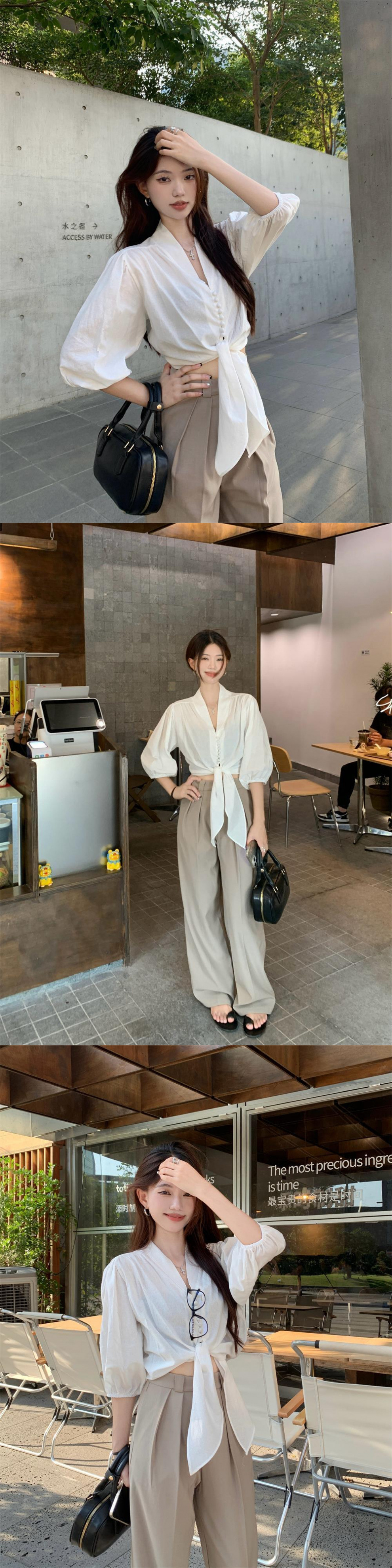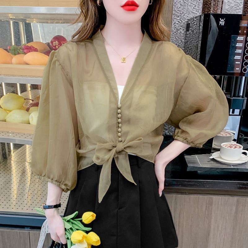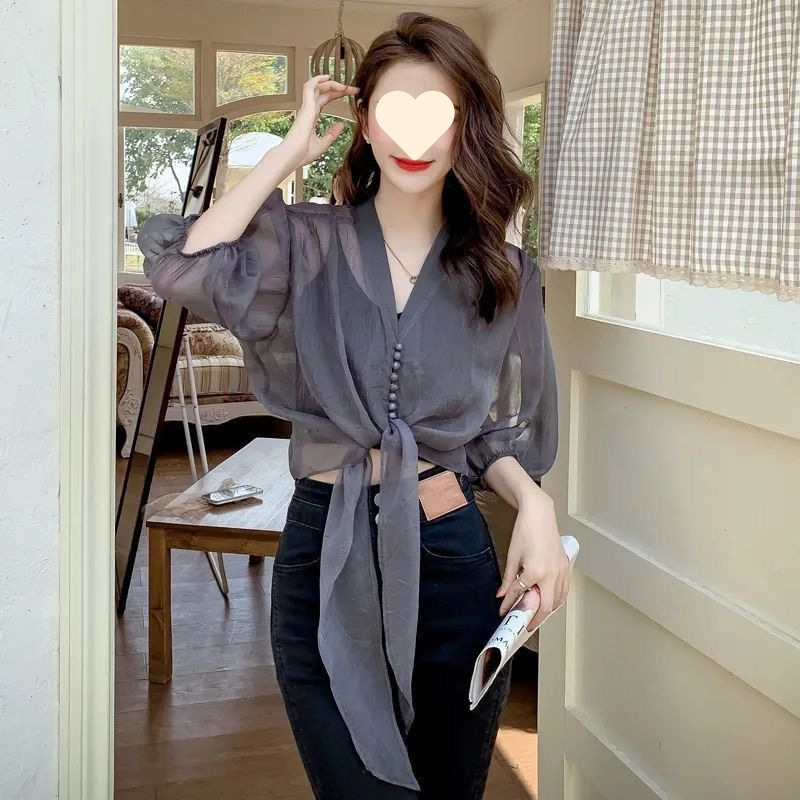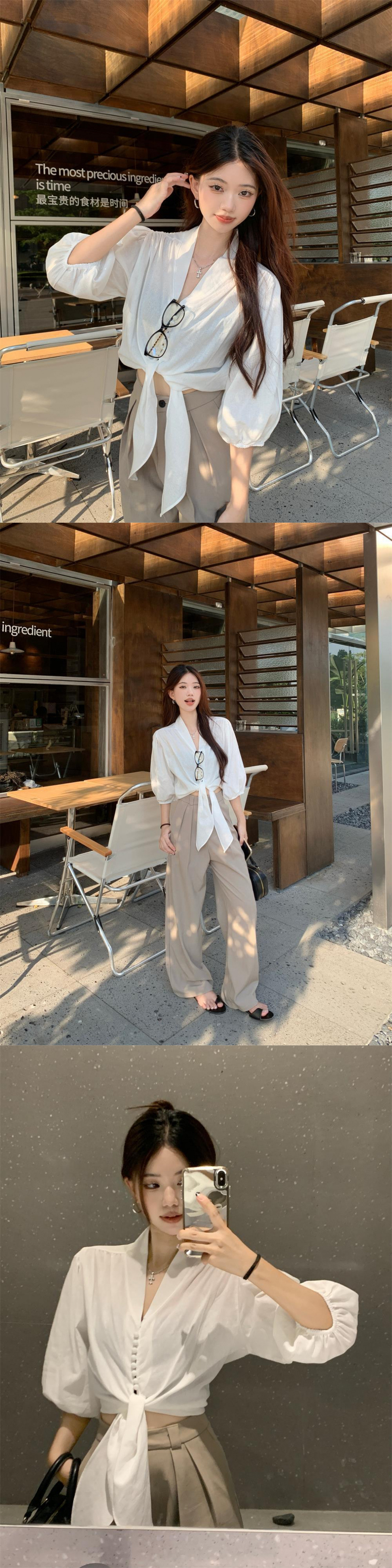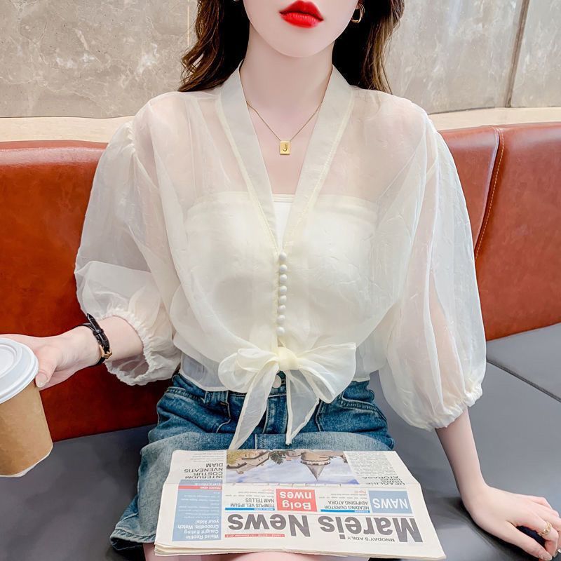 2025년 가을 여성용 프렌치 브이넥 스트랩 화이트 셔츠 새로운 스타일의 허리 슬리밍 셔츠 하이 엔드 쇼트 탑스토어 가기